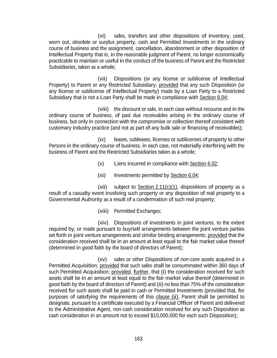 163 (vi) sales, transfers and other dispositions of inventory, used, worn out, obsolete or surplus property, cash and Permitted Investments in the ordinary course of business and the assignment, cancellation, abandonment or other disposition of Intellectual Property that is, in the reasonable judgment of Parent, no longer economically practicable to maintain or useful in the conduct of the business of Parent and the Restricted Subsidiaries, taken as a whole; (vii) Dispositions (or any license or sublicense of Intellectual Property) to Parent or any Restricted Subsidiary; provided that any such Disposition (or any license or sublicense of Intellectual Property) made by a Loan Party to a Restricted Subsidiary that is not a Loan Party shall be made in compliance with Section 6.04; (viii) the discount or sale, in each case without recourse and in the ordinary course of business, of past due receivables arising in the ordinary course of business, but only in connection with the compromise or collection thereof consistent with customary industry practice (and not as part of any bulk sale or financing of receivables); (ix) leases, subleases, licenses or sublicenses of property to other Persons in the ordinary course of business, in each case, not materially interfering with the business of Parent and the Restricted Subsidiaries taken as a whole; (x) Liens incurred in compliance with Section 6.02; (xi) Investments permitted by Section 6.04; (xii) subject to Section 2.11(c)(1), dispositions of property as a result of a casualty event involving such property or any disposition of real property to a Governmental Authority as a result of a condemnation of such real property; (xiii) Permitted Exchanges; (xiv) Dispositions of investments in joint ventures, to the extent required by, or made pursuant to buy/sell arrangements between the joint venture parties set forth in joint venture arrangements and similar binding arrangements; provided that the consideration received shall be in an amount at least equal to the fair market value thereof (determined in good faith by the board of directors of Parent); (xv) sales or other Dispositions of non-core assets acquired in a Permitted Acquisition; provided that such sales shall be consummated within 360 days of such Permitted Acquisition; provided, further, that (i) the consideration received for such assets shall be in an amount at least equal to the fair market value thereof (determined in good faith by the board of directors of Parent) and (ii) no less than 75% of the consideration received for such assets shall be paid in cash or Permitted Investments (provided that, for purposes of satisfying the requirements of this clause (ii), Parent shall be permitted to designate, pursuant to a certificate executed by a Financial Officer of Parent and delivered to the Administrative Agent, non-cash consideration received for any such Disposition as cash consideration in an amount not to exceed $10,000,000 for each such Disposition);