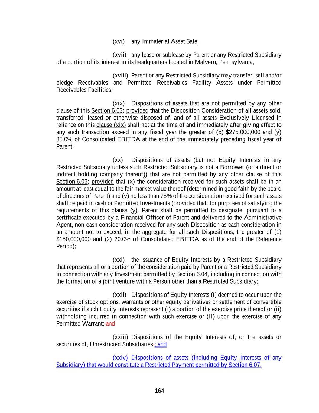 164 (xvi) any Immaterial Asset Sale; (xvii) any lease or sublease by Parent or any Restricted Subsidiary of a portion of its interest in its headquarters located in Malvern, Pennsylvania; (xviii) Parent or any Restricted Subsidiary may transfer, sell and/or pledge Receivables and Permitted Receivables Facility Assets under Permitted Receivables Facilities; (xix) Dispositions of assets that are not permitted by any other clause of this Section 6.03; provided that the Disposition Consideration of all assets sold, transferred, leased or otherwise disposed of, and of all assets Exclusively Licensed in reliance on this clause (xix) shall not at the time of and immediately after giving effect to any such transaction exceed in any fiscal year the greater of (x) $275,000,000 and (y) 35.0% of Consolidated EBITDA at the end of the immediately preceding fiscal year of Parent; (xx) Dispositions of assets (but not Equity Interests in any Restricted Subsidiary unless such Restricted Subsidiary is not a Borrower (or a direct or indirect holding company thereof)) that are not permitted by any other clause of this Section 6.03; provided that (x) the consideration received for such assets shall be in an amount at least equal to the fair market value thereof (determined in good faith by the board of directors of Parent) and (y) no less than 75% of the consideration received for such assets shall be paid in cash or Permitted Investments (provided that, for purposes of satisfying the requirements of this clause (y), Parent shall be permitted to designate, pursuant to a certificate executed by a Financial Officer of Parent and delivered to the Administrative Agent, non-cash consideration received for any such Disposition as cash consideration in an amount not to exceed, in the aggregate for all such Dispositions, the greater of (1) $150,000,000 and (2) 20.0% of Consolidated EBITDA as of the end of the Reference Period); (xxi) the issuance of Equity Interests by a Restricted Subsidiary that represents all or a portion of the consideration paid by Parent or a Restricted Subsidiary in connection with any Investment permitted by Section 6.04, including in connection with the formation of a joint venture with a Person other than a Restricted Subsidiary; (xxii) Dispositions of Equity Interests (I) deemed to occur upon the exercise of stock options, warrants or other equity derivatives or settlement of convertible securities if such Equity Interests represent (i) a portion of the exercise price thereof or (ii) withholding incurred in connection with such exercise or (II) upon the exercise of any Permitted Warrant; and (xxiii) Dispositions of the Equity Interests of, or the assets or securities of, Unrestricted Subsidiaries.; and (xxiv) Dispositions of assets (including Equity Interests of any Subsidiary) that would constitute a Restricted Payment permitted by Section 6.07.