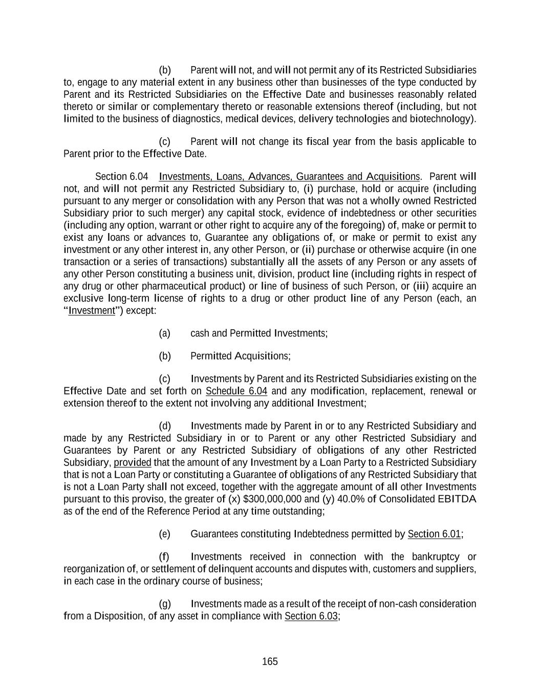 165 (b) Parent will not, and will not permit any of its Restricted Subsidiaries to, engage to any material extent in any business other than businesses of the type conducted by Parent and its Restricted Subsidiaries on the Effective Date and businesses reasonably related thereto or similar or complementary thereto or reasonable extensions thereof (including, but not limited to the business of diagnostics, medical devices, delivery technologies and biotechnology). (c) Parent will not change its fiscal year from the basis applicable to Parent prior to the Effective Date. Section 6.04 Investments, Loans, Advances, Guarantees and Acquisitions. Parent will not, and will not permit any Restricted Subsidiary to, (i) purchase, hold or acquire (including pursuant to any merger or consolidation with any Person that was not a wholly owned Restricted Subsidiary prior to such merger) any capital stock, evidence of indebtedness or other securities (including any option, warrant or other right to acquire any of the foregoing) of, make or permit to exist any loans or advances to, Guarantee any obligations of, or make or permit to exist any investment or any other interest in, any other Person, or (ii) purchase or otherwise acquire (in one transaction or a series of transactions) substantially all the assets of any Person or any assets of any other Person constituting a business unit, division, product line (including rights in respect of any drug or other pharmaceutical product) or line of business of such Person, or (iii) acquire an exclusive long-term license of rights to a drug or other product line of any Person (each, an “Investment”) except: (a) cash and Permitted Investments; (b) Permitted Acquisitions; (c) Investments by Parent and its Restricted Subsidiaries existing on the Effective Date and set forth on Schedule 6.04 and any modification, replacement, renewal or extension thereof to the extent not involving any additional Investment; (d) Investments made by Parent in or to any Restricted Subsidiary and made by any Restricted Subsidiary in or to Parent or any other Restricted Subsidiary and Guarantees by Parent or any Restricted Subsidiary of obligations of any other Restricted Subsidiary, provided that the amount of any Investment by a Loan Party to a Restricted Subsidiary that is not a Loan Party or constituting a Guarantee of obligations of any Restricted Subsidiary that is not a Loan Party shall not exceed, together with the aggregate amount of all other Investments pursuant to this proviso, the greater of (x) $300,000,000 and (y) 40.0% of Consolidated EBITDA as of the end of the Reference Period at any time outstanding; (e) Guarantees constituting Indebtedness permitted by Section 6.01; (f) Investments received in connection with the bankruptcy or reorganization of, or settlement of delinquent accounts and disputes with, customers and suppliers, in each case in the ordinary course of business; (g) Investments made as a result of the receipt of non-cash consideration from a Disposition, of any asset in compliance with Section 6.03;
