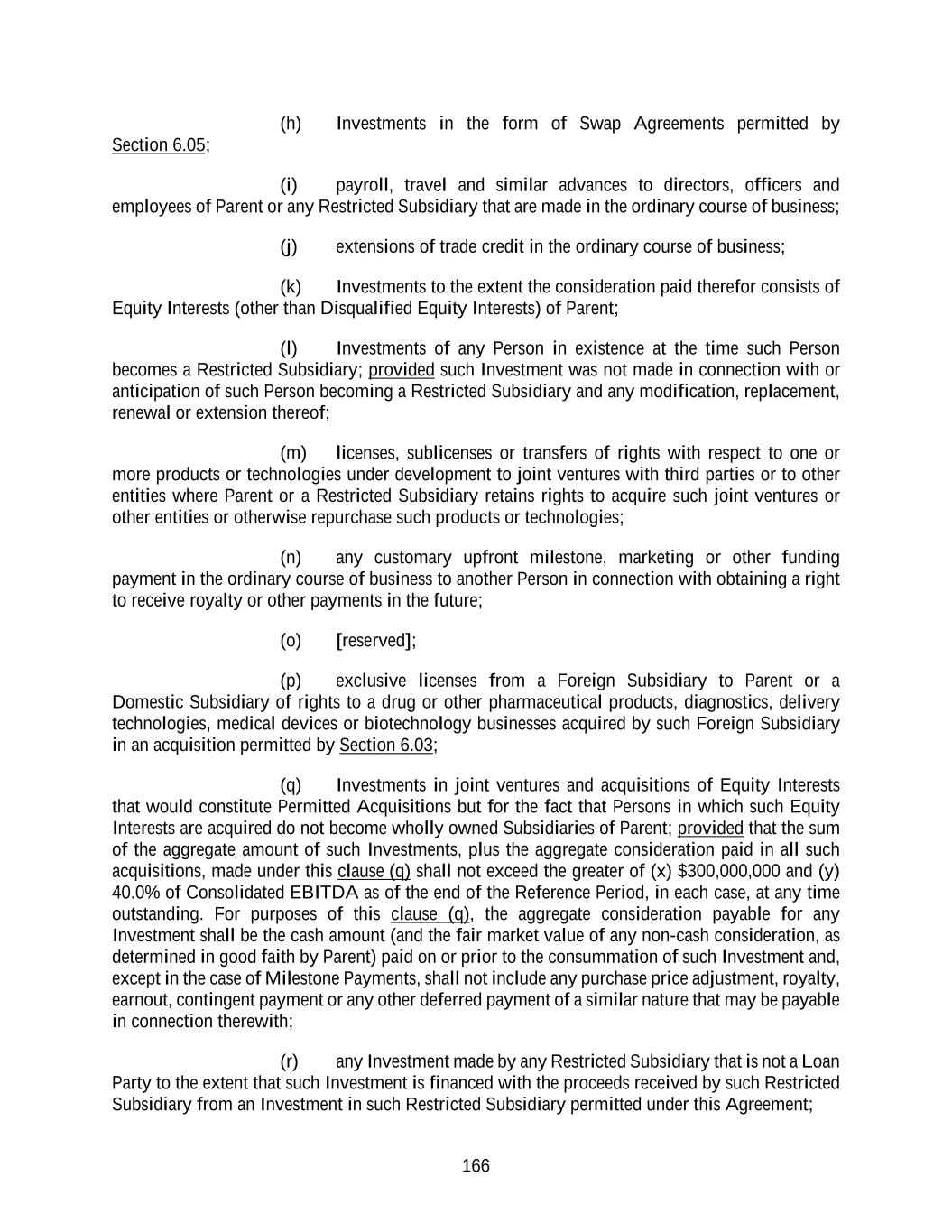 166 (h) Investments in the form of Swap Agreements permitted by Section 6.05; (i) payroll, travel and similar advances to directors, officers and employees of Parent or any Restricted Subsidiary that are made in the ordinary course of business; (j) extensions of trade credit in the ordinary course of business; (k) Investments to the extent the consideration paid therefor consists of Equity Interests (other than Disqualified Equity Interests) of Parent; (l) Investments of any Person in existence at the time such Person becomes a Restricted Subsidiary; provided such Investment was not made in connection with or anticipation of such Person becoming a Restricted Subsidiary and any modification, replacement, renewal or extension thereof; (m) licenses, sublicenses or transfers of rights with respect to one or more products or technologies under development to joint ventures with third parties or to other entities where Parent or a Restricted Subsidiary retains rights to acquire such joint ventures or other entities or otherwise repurchase such products or technologies; (n) any customary upfront milestone, marketing or other funding payment in the ordinary course of business to another Person in connection with obtaining a right to receive royalty or other payments in the future; (o) [reserved]; (p) exclusive licenses from a Foreign Subsidiary to Parent or a Domestic Subsidiary of rights to a drug or other pharmaceutical products, diagnostics, delivery technologies, medical devices or biotechnology businesses acquired by such Foreign Subsidiary in an acquisition permitted by Section 6.03; (q) Investments in joint ventures and acquisitions of Equity Interests that would constitute Permitted Acquisitions but for the fact that Persons in which such Equity Interests are acquired do not become wholly owned Subsidiaries of Parent; provided that the sum of the aggregate amount of such Investments, plus the aggregate consideration paid in all such acquisitions, made under this clause (q) shall not exceed the greater of (x) $300,000,000 and (y) 40.0% of Consolidated EBITDA as of the end of the Reference Period, in each case, at any time outstanding. For purposes of this clause (q), the aggregate consideration payable for any Investment shall be the cash amount (and the fair market value of any non-cash consideration, as determined in good faith by Parent) paid on or prior to the consummation of such Investment and, except in the case of Milestone Payments, shall not include any purchase price adjustment, royalty, earnout, contingent payment or any other deferred payment of a similar nature that may be payable in connection therewith; (r) any Investment made by any Restricted Subsidiary that is not a Loan Party to the extent that such Investment is financed with the proceeds received by such Restricted Subsidiary from an Investment in such Restricted Subsidiary permitted under this Agreement;