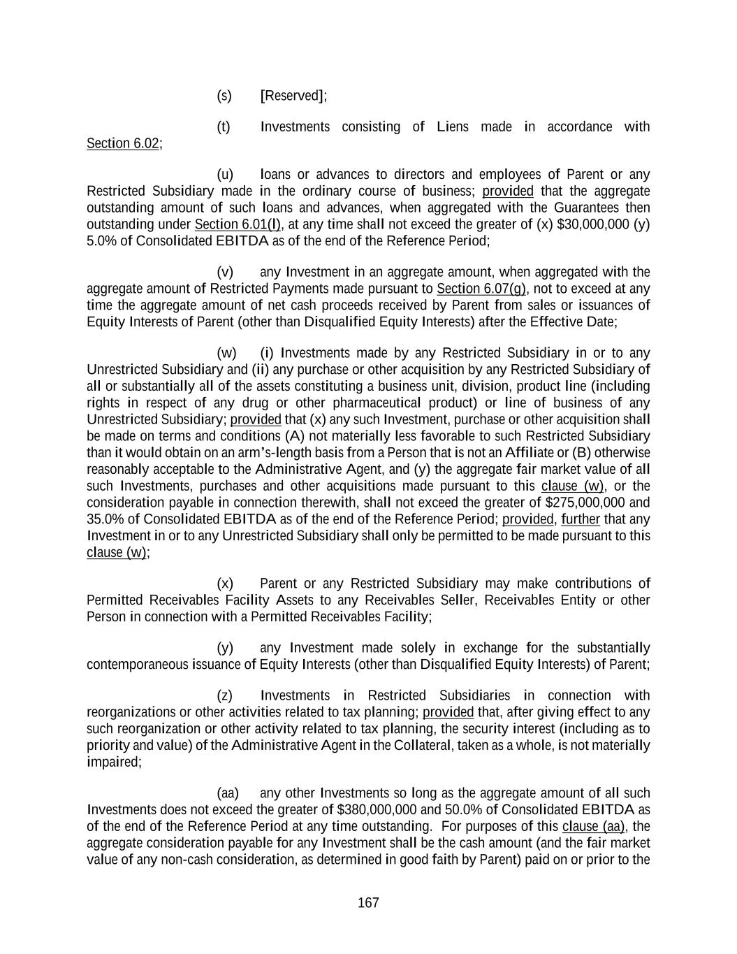 167 (s) [Reserved]; (t) Investments consisting of Liens made in accordance with Section 6.02; (u) loans or advances to directors and employees of Parent or any Restricted Subsidiary made in the ordinary course of business; provided that the aggregate outstanding amount of such loans and advances, when aggregated with the Guarantees then outstanding under Section 6.01(l), at any time shall not exceed the greater of (x) $30,000,000 (y) 5.0% of Consolidated EBITDA as of the end of the Reference Period; (v) any Investment in an aggregate amount, when aggregated with the aggregate amount of Restricted Payments made pursuant to Section 6.07(g), not to exceed at any time the aggregate amount of net cash proceeds received by Parent from sales or issuances of Equity Interests of Parent (other than Disqualified Equity Interests) after the Effective Date; (w) (i) Investments made by any Restricted Subsidiary in or to any Unrestricted Subsidiary and (ii) any purchase or other acquisition by any Restricted Subsidiary of all or substantially all of the assets constituting a business unit, division, product line (including rights in respect of any drug or other pharmaceutical product) or line of business of any Unrestricted Subsidiary; provided that (x) any such Investment, purchase or other acquisition shall be made on terms and conditions (A) not materially less favorable to such Restricted Subsidiary than it would obtain on an arm’s-length basis from a Person that is not an Affiliate or (B) otherwise reasonably acceptable to the Administrative Agent, and (y) the aggregate fair market value of all such Investments, purchases and other acquisitions made pursuant to this clause (w), or the consideration payable in connection therewith, shall not exceed the greater of $275,000,000 and 35.0% of Consolidated EBITDA as of the end of the Reference Period; provided, further that any Investment in or to any Unrestricted Subsidiary shall only be permitted to be made pursuant to this clause (w); (x) Parent or any Restricted Subsidiary may make contributions of Permitted Receivables Facility Assets to any Receivables Seller, Receivables Entity or other Person in connection with a Permitted Receivables Facility; (y) any Investment made solely in exchange for the substantially contemporaneous issuance of Equity Interests (other than Disqualified Equity Interests) of Parent; (z) Investments in Restricted Subsidiaries in connection with reorganizations or other activities related to tax planning; provided that, after giving effect to any such reorganization or other activity related to tax planning, the security interest (including as to priority and value) of the Administrative Agent in the Collateral, taken as a whole, is not materially impaired; (aa) any other Investments so long as the aggregate amount of all such Investments does not exceed the greater of $380,000,000 and 50.0% of Consolidated EBITDA as of the end of the Reference Period at any time outstanding. For purposes of this clause (aa), the aggregate consideration payable for any Investment shall be the cash amount (and the fair market value of any non-cash consideration, as determined in good faith by Parent) paid on or prior to the