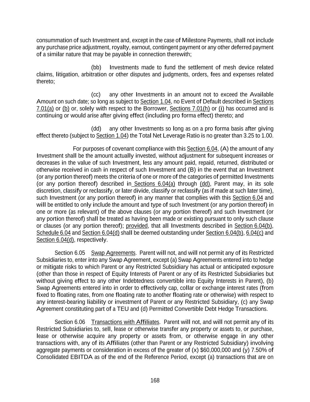 168 consummation of such Investment and, except in the case of Milestone Payments, shall not include any purchase price adjustment, royalty, earnout, contingent payment or any other deferred payment of a similar nature that may be payable in connection therewith; (bb) Investments made to fund the settlement of mesh device related claims, litigation, arbitration or other disputes and judgments, orders, fees and expenses related thereto; (cc) any other Investments in an amount not to exceed the Available Amount on such date; so long as subject to Section 1.04, no Event of Default described in Sections 7.01(a) or (b) or, solely with respect to the Borrower, Sections 7.01(h) or (i) has occurred and is continuing or would arise after giving effect (including pro forma effect) thereto; and (dd) any other Investments so long as on a pro forma basis after giving effect thereto (subject to Section 1.04) the Total Net Leverage Ratio is no greater than 3.25 to 1.00. For purposes of covenant compliance with this Section 6.04, (A) the amount of any Investment shall be the amount actually invested, without adjustment for subsequent increases or decreases in the value of such Investment, less any amount paid, repaid, returned, distributed or otherwise received in cash in respect of such Investment and (B) in the event that an Investment (or any portion thereof) meets the criteria of one or more of the categories of permitted Investments (or any portion thereof) described in Sections 6.04(a) through (dd), Parent may, in its sole discretion, classify or reclassify, or later divide, classify or reclassify (as if made at such later time), such Investment (or any portion thereof) in any manner that complies with this Section 6.04 and will be entitled to only include the amount and type of such Investment (or any portion thereof) in one or more (as relevant) of the above clauses (or any portion thereof) and such Investment (or any portion thereof) shall be treated as having been made or existing pursuant to only such clause or clauses (or any portion thereof); provided, that all Investments described in Section 6.04(b), Schedule 6.04 and Section 6.04(d) shall be deemed outstanding under Section 6.04(b), 6.04(c) and Section 6.04(d), respectively. Section 6.05 Swap Agreements. Parent will not, and will not permit any of its Restricted Subsidiaries to, enter into any Swap Agreement, except (a) Swap Agreements entered into to hedge or mitigate risks to which Parent or any Restricted Subsidiary has actual or anticipated exposure (other than those in respect of Equity Interests of Parent or any of its Restricted Subsidiaries but without giving effect to any other Indebtedness convertible into Equity Interests in Parent), (b) Swap Agreements entered into in order to effectively cap, collar or exchange interest rates (from fixed to floating rates, from one floating rate to another floating rate or otherwise) with respect to any interest-bearing liability or investment of Parent or any Restricted Subsidiary, (c) any Swap Agreement constituting part of a TEU and (d) Permitted Convertible Debt Hedge Transactions. Section 6.06 Transactions with Affiliates. Parent will not, and will not permit any of its Restricted Subsidiaries to, sell, lease or otherwise transfer any property or assets to, or purchase, lease or otherwise acquire any property or assets from, or otherwise engage in any other transactions with, any of its Affiliates (other than Parent or any Restricted Subsidiary) involving aggregate payments or consideration in excess of the greater of (x) $60,000,000 and (y) 7.50% of Consolidated EBITDA as of the end of the Reference Period, except (a) transactions that are on