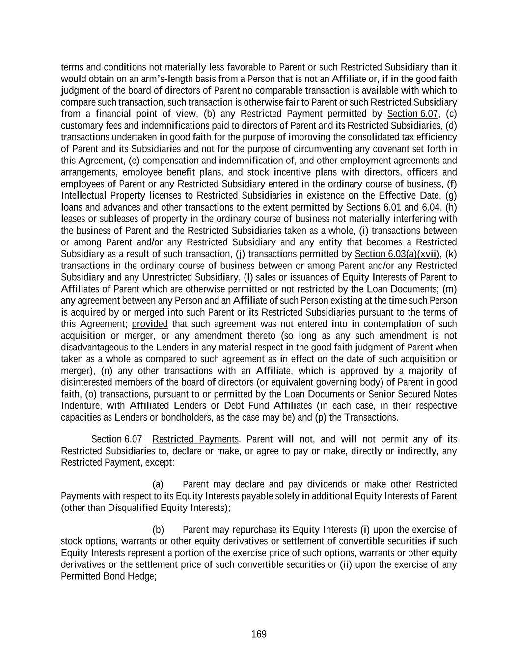 169 terms and conditions not materially less favorable to Parent or such Restricted Subsidiary than it would obtain on an arm’s-length basis from a Person that is not an Affiliate or, if in the good faith judgment of the board of directors of Parent no comparable transaction is available with which to compare such transaction, such transaction is otherwise fair to Parent or such Restricted Subsidiary from a financial point of view, (b) any Restricted Payment permitted by Section 6.07, (c) customary fees and indemnifications paid to directors of Parent and its Restricted Subsidiaries, (d) transactions undertaken in good faith for the purpose of improving the consolidated tax efficiency of Parent and its Subsidiaries and not for the purpose of circumventing any covenant set forth in this Agreement, (e) compensation and indemnification of, and other employment agreements and arrangements, employee benefit plans, and stock incentive plans with directors, officers and employees of Parent or any Restricted Subsidiary entered in the ordinary course of business, (f) Intellectual Property licenses to Restricted Subsidiaries in existence on the Effective Date, (g) loans and advances and other transactions to the extent permitted by Sections 6.01 and 6.04, (h) leases or subleases of property in the ordinary course of business not materially interfering with the business of Parent and the Restricted Subsidiaries taken as a whole, (i) transactions between or among Parent and/or any Restricted Subsidiary and any entity that becomes a Restricted Subsidiary as a result of such transaction, (j) transactions permitted by Section 6.03(a)(xvii), (k) transactions in the ordinary course of business between or among Parent and/or any Restricted Subsidiary and any Unrestricted Subsidiary, (l) sales or issuances of Equity Interests of Parent to Affiliates of Parent which are otherwise permitted or not restricted by the Loan Documents; (m) any agreement between any Person and an Affiliate of such Person existing at the time such Person is acquired by or merged into such Parent or its Restricted Subsidiaries pursuant to the terms of this Agreement; provided that such agreement was not entered into in contemplation of such acquisition or merger, or any amendment thereto (so long as any such amendment is not disadvantageous to the Lenders in any material respect in the good faith judgment of Parent when taken as a whole as compared to such agreement as in effect on the date of such acquisition or merger), (n) any other transactions with an Affiliate, which is approved by a majority of disinterested members of the board of directors (or equivalent governing body) of Parent in good faith, (o) transactions, pursuant to or permitted by the Loan Documents or Senior Secured Notes Indenture, with Affiliated Lenders or Debt Fund Affiliates (in each case, in their respective capacities as Lenders or bondholders, as the case may be) and (p) the Transactions. Section 6.07 Restricted Payments. Parent will not, and will not permit any of its Restricted Subsidiaries to, declare or make, or agree to pay or make, directly or indirectly, any Restricted Payment, except: (a) Parent may declare and pay dividends or make other Restricted Payments with respect to its Equity Interests payable solely in additional Equity Interests of Parent (other than Disqualified Equity Interests); (b) Parent may repurchase its Equity Interests (i) upon the exercise of stock options, warrants or other equity derivatives or settlement of convertible securities if such Equity Interests represent a portion of the exercise price of such options, warrants or other equity derivatives or the settlement price of such convertible securities or (ii) upon the exercise of any Permitted Bond Hedge;