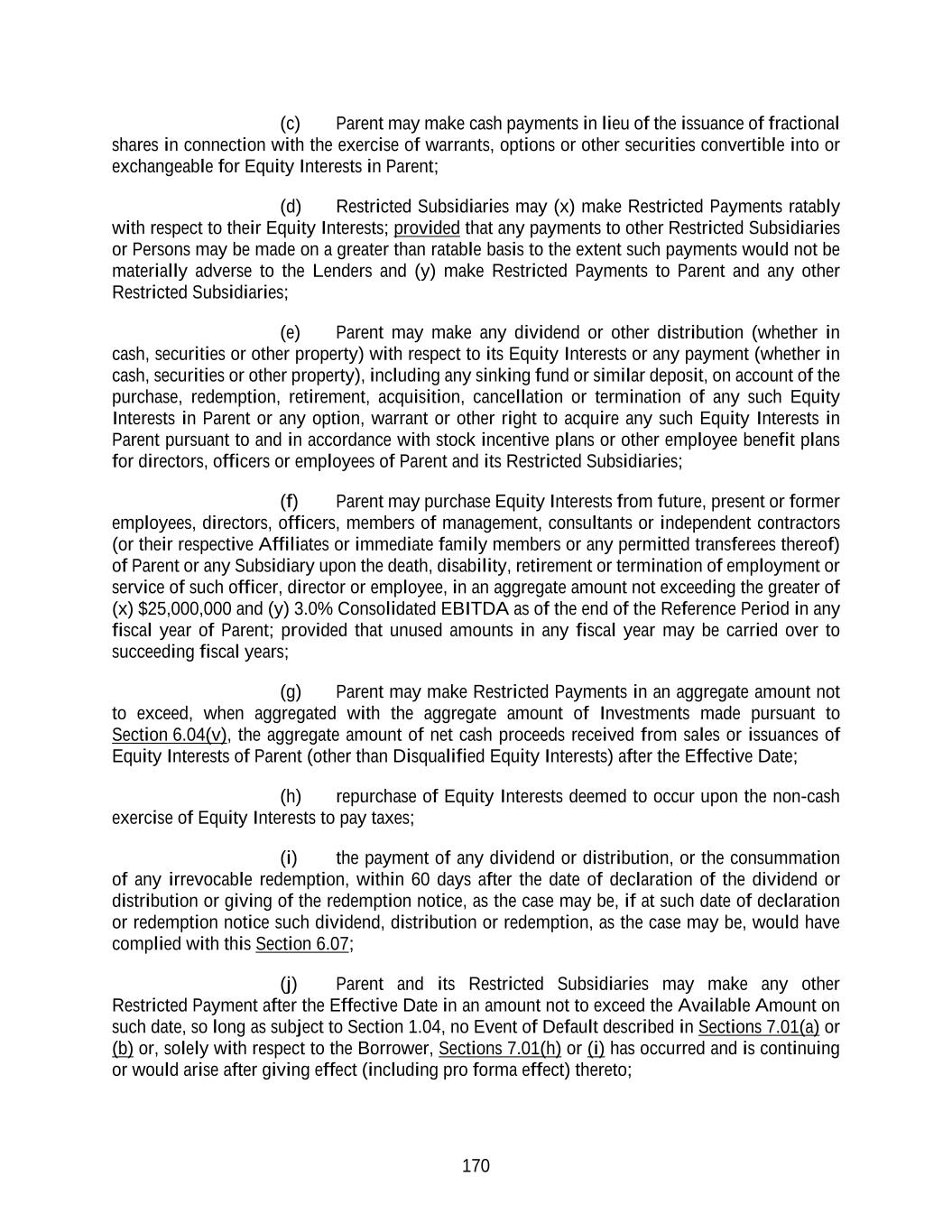 170 (c) Parent may make cash payments in lieu of the issuance of fractional shares in connection with the exercise of warrants, options or other securities convertible into or exchangeable for Equity Interests in Parent; (d) Restricted Subsidiaries may (x) make Restricted Payments ratably with respect to their Equity Interests; provided that any payments to other Restricted Subsidiaries or Persons may be made on a greater than ratable basis to the extent such payments would not be materially adverse to the Lenders and (y) make Restricted Payments to Parent and any other Restricted Subsidiaries; (e) Parent may make any dividend or other distribution (whether in cash, securities or other property) with respect to its Equity Interests or any payment (whether in cash, securities or other property), including any sinking fund or similar deposit, on account of the purchase, redemption, retirement, acquisition, cancellation or termination of any such Equity Interests in Parent or any option, warrant or other right to acquire any such Equity Interests in Parent pursuant to and in accordance with stock incentive plans or other employee benefit plans for directors, officers or employees of Parent and its Restricted Subsidiaries; (f) Parent may purchase Equity Interests from future, present or former employees, directors, officers, members of management, consultants or independent contractors (or their respective Affiliates or immediate family members or any permitted transferees thereof) of Parent or any Subsidiary upon the death, disability, retirement or termination of employment or service of such officer, director or employee, in an aggregate amount not exceeding the greater of (x) $25,000,000 and (y) 3.0% Consolidated EBITDA as of the end of the Reference Period in any fiscal year of Parent; provided that unused amounts in any fiscal year may be carried over to succeeding fiscal years; (g) Parent may make Restricted Payments in an aggregate amount not to exceed, when aggregated with the aggregate amount of Investments made pursuant to Section 6.04(v), the aggregate amount of net cash proceeds received from sales or issuances of Equity Interests of Parent (other than Disqualified Equity Interests) after the Effective Date; (h) repurchase of Equity Interests deemed to occur upon the non-cash exercise of Equity Interests to pay taxes; (i) the payment of any dividend or distribution, or the consummation of any irrevocable redemption, within 60 days after the date of declaration of the dividend or distribution or giving of the redemption notice, as the case may be, if at such date of declaration or redemption notice such dividend, distribution or redemption, as the case may be, would have complied with this Section 6.07; (j) Parent and its Restricted Subsidiaries may make any other Restricted Payment after the Effective Date in an amount not to exceed the Available Amount on such date, so long as subject to Section 1.04, no Event of Default described in Sections 7.01(a) or (b) or, solely with respect to the Borrower, Sections 7.01(h) or (i) has occurred and is continuing or would arise after giving effect (including pro forma effect) thereto;