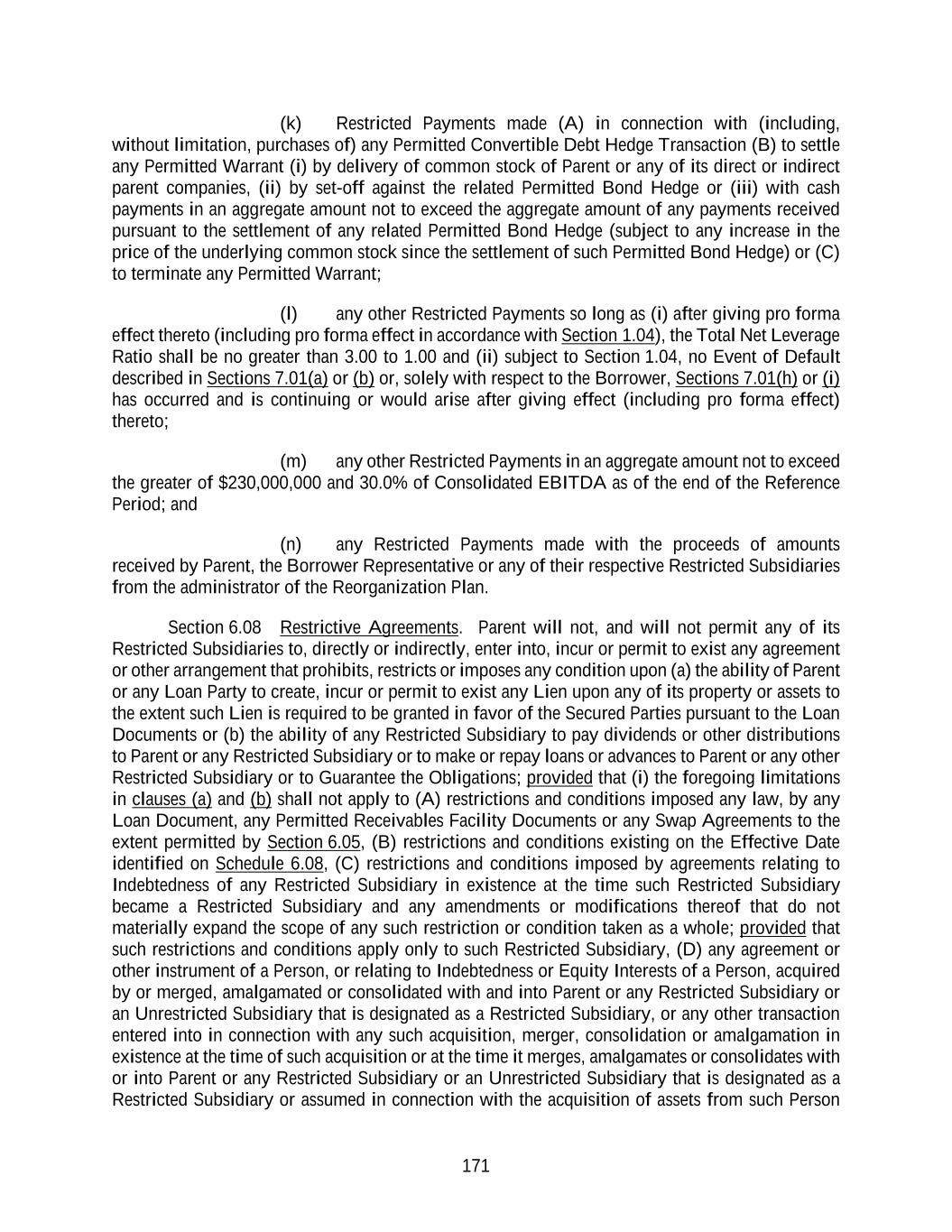 171 (k) Restricted Payments made (A) in connection with (including, without limitation, purchases of) any Permitted Convertible Debt Hedge Transaction (B) to settle any Permitted Warrant (i) by delivery of common stock of Parent or any of its direct or indirect parent companies, (ii) by set-off against the related Permitted Bond Hedge or (iii) with cash payments in an aggregate amount not to exceed the aggregate amount of any payments received pursuant to the settlement of any related Permitted Bond Hedge (subject to any increase in the price of the underlying common stock since the settlement of such Permitted Bond Hedge) or (C) to terminate any Permitted Warrant; (l) any other Restricted Payments so long as (i) after giving pro forma effect thereto (including pro forma effect in accordance with Section 1.04), the Total Net Leverage Ratio shall be no greater than 3.00 to 1.00 and (ii) subject to Section 1.04, no Event of Default described in Sections 7.01(a) or (b) or, solely with respect to the Borrower, Sections 7.01(h) or (i) has occurred and is continuing or would arise after giving effect (including pro forma effect) thereto; (m) any other Restricted Payments in an aggregate amount not to exceed the greater of $230,000,000 and 30.0% of Consolidated EBITDA as of the end of the Reference Period; and (n) any Restricted Payments made with the proceeds of amounts received by Parent, the Borrower Representative or any of their respective Restricted Subsidiaries from the administrator of the Reorganization Plan. Section 6.08 Restrictive Agreements. Parent will not, and will not permit any of its Restricted Subsidiaries to, directly or indirectly, enter into, incur or permit to exist any agreement or other arrangement that prohibits, restricts or imposes any condition upon (a) the ability of Parent or any Loan Party to create, incur or permit to exist any Lien upon any of its property or assets to the extent such Lien is required to be granted in favor of the Secured Parties pursuant to the Loan Documents or (b) the ability of any Restricted Subsidiary to pay dividends or other distributions to Parent or any Restricted Subsidiary or to make or repay loans or advances to Parent or any other Restricted Subsidiary or to Guarantee the Obligations; provided that (i) the foregoing limitations in clauses (a) and (b) shall not apply to (A) restrictions and conditions imposed any law, by any Loan Document, any Permitted Receivables Facility Documents or any Swap Agreements to the extent permitted by Section 6.05, (B) restrictions and conditions existing on the Effective Date identified on Schedule 6.08, (C) restrictions and conditions imposed by agreements relating to Indebtedness of any Restricted Subsidiary in existence at the time such Restricted Subsidiary became a Restricted Subsidiary and any amendments or modifications thereof that do not materially expand the scope of any such restriction or condition taken as a whole; provided that such restrictions and conditions apply only to such Restricted Subsidiary, (D) any agreement or other instrument of a Person, or relating to Indebtedness or Equity Interests of a Person, acquired by or merged, amalgamated or consolidated with and into Parent or any Restricted Subsidiary or an Unrestricted Subsidiary that is designated as a Restricted Subsidiary, or any other transaction entered into in connection with any such acquisition, merger, consolidation or amalgamation in existence at the time of such acquisition or at the time it merges, amalgamates or consolidates with or into Parent or any Restricted Subsidiary or an Unrestricted Subsidiary that is designated as a Restricted Subsidiary or assumed in connection with the acquisition of assets from such Person