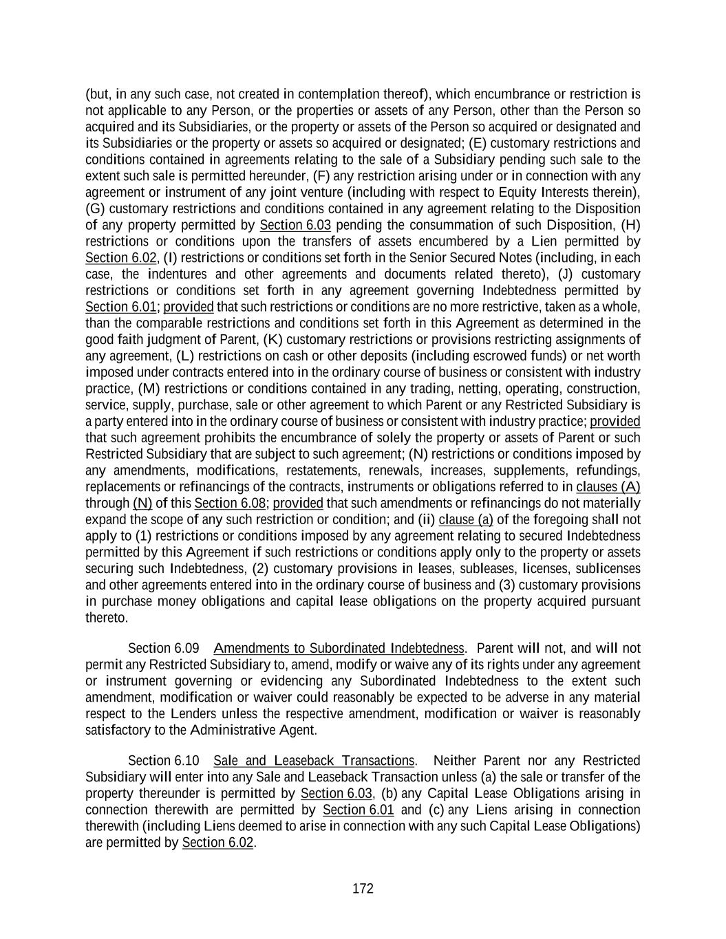 172 (but, in any such case, not created in contemplation thereof), which encumbrance or restriction is not applicable to any Person, or the properties or assets of any Person, other than the Person so acquired and its Subsidiaries, or the property or assets of the Person so acquired or designated and its Subsidiaries or the property or assets so acquired or designated; (E) customary restrictions and conditions contained in agreements relating to the sale of a Subsidiary pending such sale to the extent such sale is permitted hereunder, (F) any restriction arising under or in connection with any agreement or instrument of any joint venture (including with respect to Equity Interests therein), (G) customary restrictions and conditions contained in any agreement relating to the Disposition of any property permitted by Section 6.03 pending the consummation of such Disposition, (H) restrictions or conditions upon the transfers of assets encumbered by a Lien permitted by Section 6.02, (I) restrictions or conditions set forth in the Senior Secured Notes (including, in each case, the indentures and other agreements and documents related thereto), (J) customary restrictions or conditions set forth in any agreement governing Indebtedness permitted by Section 6.01; provided that such restrictions or conditions are no more restrictive, taken as a whole, than the comparable restrictions and conditions set forth in this Agreement as determined in the good faith judgment of Parent, (K) customary restrictions or provisions restricting assignments of any agreement, (L) restrictions on cash or other deposits (including escrowed funds) or net worth imposed under contracts entered into in the ordinary course of business or consistent with industry practice, (M) restrictions or conditions contained in any trading, netting, operating, construction, service, supply, purchase, sale or other agreement to which Parent or any Restricted Subsidiary is a party entered into in the ordinary course of business or consistent with industry practice; provided that such agreement prohibits the encumbrance of solely the property or assets of Parent or such Restricted Subsidiary that are subject to such agreement; (N) restrictions or conditions imposed by any amendments, modifications, restatements, renewals, increases, supplements, refundings, replacements or refinancings of the contracts, instruments or obligations referred to in clauses (A) through (N) of this Section 6.08; provided that such amendments or refinancings do not materially expand the scope of any such restriction or condition; and (ii) clause (a) of the foregoing shall not apply to (1) restrictions or conditions imposed by any agreement relating to secured Indebtedness permitted by this Agreement if such restrictions or conditions apply only to the property or assets securing such Indebtedness, (2) customary provisions in leases, subleases, licenses, sublicenses and other agreements entered into in the ordinary course of business and (3) customary provisions in purchase money obligations and capital lease obligations on the property acquired pursuant thereto. Section 6.09 Amendments to Subordinated Indebtedness. Parent will not, and will not permit any Restricted Subsidiary to, amend, modify or waive any of its rights under any agreement or instrument governing or evidencing any Subordinated Indebtedness to the extent such amendment, modification or waiver could reasonably be expected to be adverse in any material respect to the Lenders unless the respective amendment, modification or waiver is reasonably satisfactory to the Administrative Agent. Section 6.10 Sale and Leaseback Transactions. Neither Parent nor any Restricted Subsidiary will enter into any Sale and Leaseback Transaction unless (a) the sale or transfer of the property thereunder is permitted by Section 6.03, (b) any Capital Lease Obligations arising in connection therewith are permitted by Section 6.01 and (c) any Liens arising in connection therewith (including Liens deemed to arise in connection with any such Capital Lease Obligations) are permitted by Section 6.02.