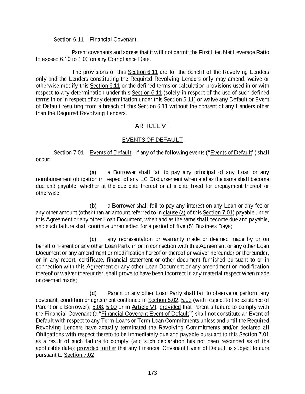 173 Section 6.11 Financial Covenant. Parent covenants and agrees that it will not permit the First Lien Net Leverage Ratio to exceed 6.10 to 1.00 on any Compliance Date. The provisions of this Section 6.11 are for the benefit of the Revolving Lenders only and the Lenders constituting the Required Revolving Lenders only may amend, waive or otherwise modify this Section 6.11 or the defined terms or calculation provisions used in or with respect to any determination under this Section 6.11 (solely in respect of the use of such defined terms in or in respect of any determination under this Section 6.11) or waive any Default or Event of Default resulting from a breach of this Section 6.11 without the consent of any Lenders other than the Required Revolving Lenders. ARTICLE VII EVENTS OF DEFAULT Section 7.01 Events of Default. If any of the following events (“Events of Default”) shall occur: (a) a Borrower shall fail to pay any principal of any Loan or any reimbursement obligation in respect of any LC Disbursement when and as the same shall become due and payable, whether at the due date thereof or at a date fixed for prepayment thereof or otherwise; (b) a Borrower shall fail to pay any interest on any Loan or any fee or any other amount (other than an amount referred to in clause (a) of this Section 7.01) payable under this Agreement or any other Loan Document, when and as the same shall become due and payable, and such failure shall continue unremedied for a period of five (5) Business Days; (c) any representation or warranty made or deemed made by or on behalf of Parent or any other Loan Party in or in connection with this Agreement or any other Loan Document or any amendment or modification hereof or thereof or waiver hereunder or thereunder, or in any report, certificate, financial statement or other document furnished pursuant to or in connection with this Agreement or any other Loan Document or any amendment or modification thereof or waiver thereunder, shall prove to have been incorrect in any material respect when made or deemed made; (d) Parent or any other Loan Party shall fail to observe or perform any covenant, condition or agreement contained in Section 5.02, 5.03 (with respect to the existence of Parent or a Borrower), 5.08, 5.09 or in Article VI; provided that Parent’s failure to comply with the Financial Covenant (a “Financial Covenant Event of Default”) shall not constitute an Event of Default with respect to any Term Loans or Term Loan Commitments unless and until the Required Revolving Lenders have actually terminated the Revolving Commitments and/or declared all Obligations with respect thereto to be immediately due and payable pursuant to this Section 7.01 as a result of such failure to comply (and such declaration has not been rescinded as of the applicable date); provided further that any Financial Covenant Event of Default is subject to cure pursuant to Section 7.02;