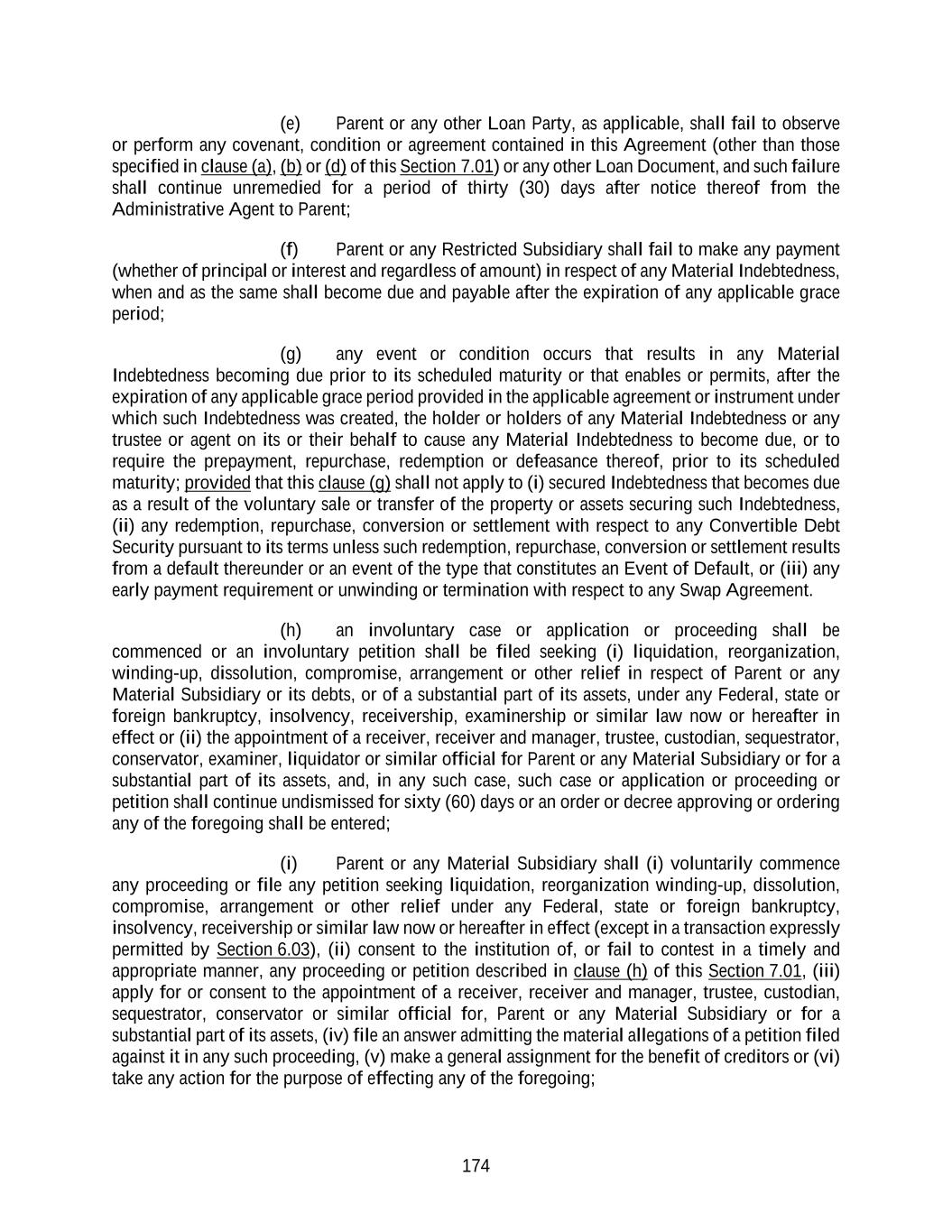 174 (e) Parent or any other Loan Party, as applicable, shall fail to observe or perform any covenant, condition or agreement contained in this Agreement (other than those specified in clause (a), (b) or (d) of this Section 7.01) or any other Loan Document, and such failure shall continue unremedied for a period of thirty (30) days after notice thereof from the Administrative Agent to Parent; (f) Parent or any Restricted Subsidiary shall fail to make any payment (whether of principal or interest and regardless of amount) in respect of any Material Indebtedness, when and as the same shall become due and payable after the expiration of any applicable grace period; (g) any event or condition occurs that results in any Material Indebtedness becoming due prior to its scheduled maturity or that enables or permits, after the expiration of any applicable grace period provided in the applicable agreement or instrument under which such Indebtedness was created, the holder or holders of any Material Indebtedness or any trustee or agent on its or their behalf to cause any Material Indebtedness to become due, or to require the prepayment, repurchase, redemption or defeasance thereof, prior to its scheduled maturity; provided that this clause (g) shall not apply to (i) secured Indebtedness that becomes due as a result of the voluntary sale or transfer of the property or assets securing such Indebtedness, (ii) any redemption, repurchase, conversion or settlement with respect to any Convertible Debt Security pursuant to its terms unless such redemption, repurchase, conversion or settlement results from a default thereunder or an event of the type that constitutes an Event of Default, or (iii) any early payment requirement or unwinding or termination with respect to any Swap Agreement. (h) an involuntary case or application or proceeding shall be commenced or an involuntary petition shall be filed seeking (i) liquidation, reorganization, winding-up, dissolution, compromise, arrangement or other relief in respect of Parent or any Material Subsidiary or its debts, or of a substantial part of its assets, under any Federal, state or foreign bankruptcy, insolvency, receivership, examinership or similar law now or hereafter in effect or (ii) the appointment of a receiver, receiver and manager, trustee, custodian, sequestrator, conservator, examiner, liquidator or similar official for Parent or any Material Subsidiary or for a substantial part of its assets, and, in any such case, such case or application or proceeding or petition shall continue undismissed for sixty (60) days or an order or decree approving or ordering any of the foregoing shall be entered; (i) Parent or any Material Subsidiary shall (i) voluntarily commence any proceeding or file any petition seeking liquidation, reorganization winding-up, dissolution, compromise, arrangement or other relief under any Federal, state or foreign bankruptcy, insolvency, receivership or similar law now or hereafter in effect (except in a transaction expressly permitted by Section 6.03), (ii) consent to the institution of, or fail to contest in a timely and appropriate manner, any proceeding or petition described in clause (h) of this Section 7.01, (iii) apply for or consent to the appointment of a receiver, receiver and manager, trustee, custodian, sequestrator, conservator or similar official for, Parent or any Material Subsidiary or for a substantial part of its assets, (iv) file an answer admitting the material allegations of a petition filed against it in any such proceeding, (v) make a general assignment for the benefit of creditors or (vi) take any action for the purpose of effecting any of the foregoing;