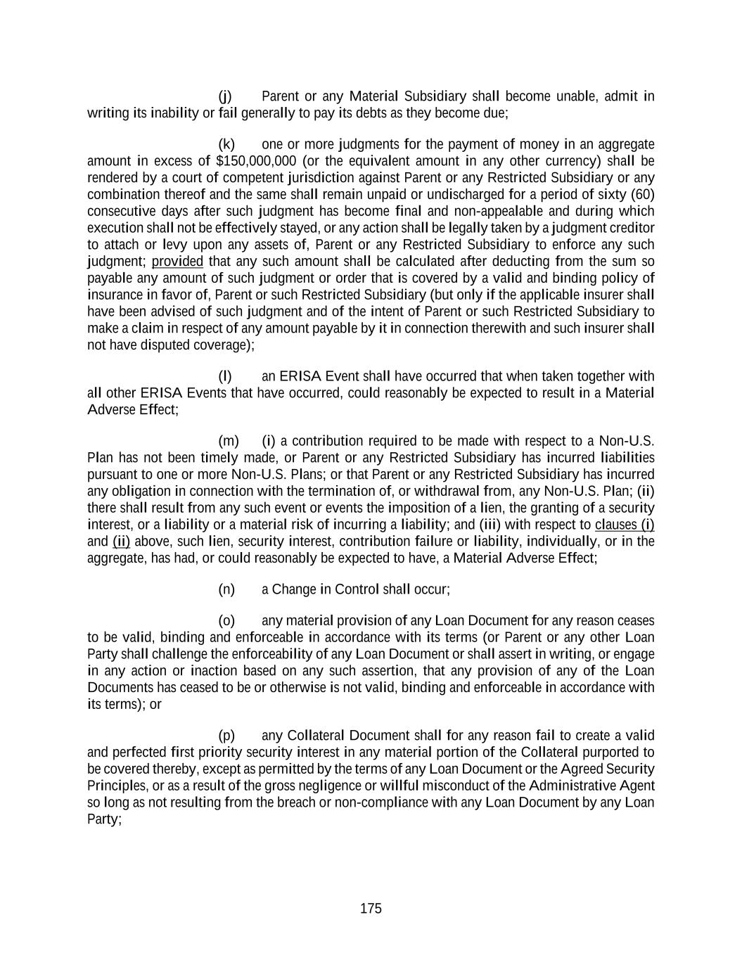 175 (j) Parent or any Material Subsidiary shall become unable, admit in writing its inability or fail generally to pay its debts as they become due; (k) one or more judgments for the payment of money in an aggregate amount in excess of $150,000,000 (or the equivalent amount in any other currency) shall be rendered by a court of competent jurisdiction against Parent or any Restricted Subsidiary or any combination thereof and the same shall remain unpaid or undischarged for a period of sixty (60) consecutive days after such judgment has become final and non-appealable and during which execution shall not be effectively stayed, or any action shall be legally taken by a judgment creditor to attach or levy upon any assets of, Parent or any Restricted Subsidiary to enforce any such judgment; provided that any such amount shall be calculated after deducting from the sum so payable any amount of such judgment or order that is covered by a valid and binding policy of insurance in favor of, Parent or such Restricted Subsidiary (but only if the applicable insurer shall have been advised of such judgment and of the intent of Parent or such Restricted Subsidiary to make a claim in respect of any amount payable by it in connection therewith and such insurer shall not have disputed coverage); (l) an ERISA Event shall have occurred that when taken together with all other ERISA Events that have occurred, could reasonably be expected to result in a Material Adverse Effect; (m) (i) a contribution required to be made with respect to a Non-U.S. Plan has not been timely made, or Parent or any Restricted Subsidiary has incurred liabilities pursuant to one or more Non-U.S. Plans; or that Parent or any Restricted Subsidiary has incurred any obligation in connection with the termination of, or withdrawal from, any Non-U.S. Plan; (ii) there shall result from any such event or events the imposition of a lien, the granting of a security interest, or a liability or a material risk of incurring a liability; and (iii) with respect to clauses (i) and (ii) above, such lien, security interest, contribution failure or liability, individually, or in the aggregate, has had, or could reasonably be expected to have, a Material Adverse Effect; (n) a Change in Control shall occur; (o) any material provision of any Loan Document for any reason ceases to be valid, binding and enforceable in accordance with its terms (or Parent or any other Loan Party shall challenge the enforceability of any Loan Document or shall assert in writing, or engage in any action or inaction based on any such assertion, that any provision of any of the Loan Documents has ceased to be or otherwise is not valid, binding and enforceable in accordance with its terms); or (p) any Collateral Document shall for any reason fail to create a valid and perfected first priority security interest in any material portion of the Collateral purported to be covered thereby, except as permitted by the terms of any Loan Document or the Agreed Security Principles, or as a result of the gross negligence or willful misconduct of the Administrative Agent so long as not resulting from the breach or non-compliance with any Loan Document by any Loan Party;