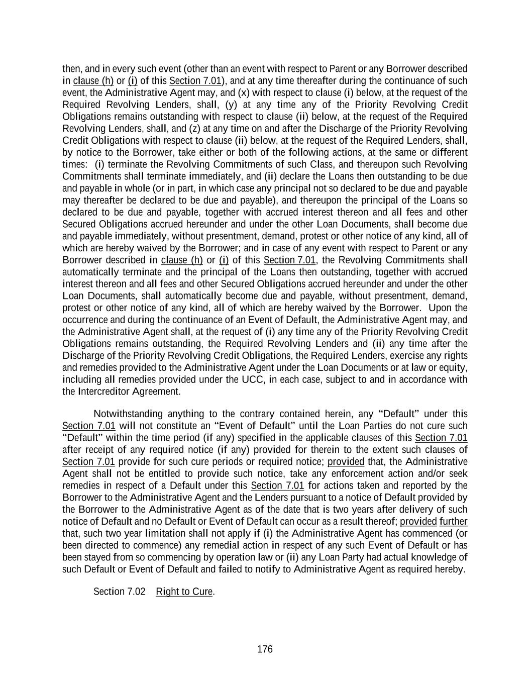 176 then, and in every such event (other than an event with respect to Parent or any Borrower described in clause (h) or (i) of this Section 7.01), and at any time thereafter during the continuance of such event, the Administrative Agent may, and (x) with respect to clause (i) below, at the request of the Required Revolving Lenders, shall, (y) at any time any of the Priority Revolving Credit Obligations remains outstanding with respect to clause (ii) below, at the request of the Required Revolving Lenders, shall, and (z) at any time on and after the Discharge of the Priority Revolving Credit Obligations with respect to clause (ii) below, at the request of the Required Lenders, shall, by notice to the Borrower, take either or both of the following actions, at the same or different times: (i) terminate the Revolving Commitments of such Class, and thereupon such Revolving Commitments shall terminate immediately, and (ii) declare the Loans then outstanding to be due and payable in whole (or in part, in which case any principal not so declared to be due and payable may thereafter be declared to be due and payable), and thereupon the principal of the Loans so declared to be due and payable, together with accrued interest thereon and all fees and other Secured Obligations accrued hereunder and under the other Loan Documents, shall become due and payable immediately, without presentment, demand, protest or other notice of any kind, all of which are hereby waived by the Borrower; and in case of any event with respect to Parent or any Borrower described in clause (h) or (i) of this Section 7.01, the Revolving Commitments shall automatically terminate and the principal of the Loans then outstanding, together with accrued interest thereon and all fees and other Secured Obligations accrued hereunder and under the other Loan Documents, shall automatically become due and payable, without presentment, demand, protest or other notice of any kind, all of which are hereby waived by the Borrower. Upon the occurrence and during the continuance of an Event of Default, the Administrative Agent may, and the Administrative Agent shall, at the request of (i) any time any of the Priority Revolving Credit Obligations remains outstanding, the Required Revolving Lenders and (ii) any time after the Discharge of the Priority Revolving Credit Obligations, the Required Lenders, exercise any rights and remedies provided to the Administrative Agent under the Loan Documents or at law or equity, including all remedies provided under the UCC, in each case, subject to and in accordance with the Intercreditor Agreement. Notwithstanding anything to the contrary contained herein, any “Default” under this Section 7.01 will not constitute an “Event of Default” until the Loan Parties do not cure such “Default” within the time period (if any) specified in the applicable clauses of this Section 7.01 after receipt of any required notice (if any) provided for therein to the extent such clauses of Section 7.01 provide for such cure periods or required notice; provided that, the Administrative Agent shall not be entitled to provide such notice, take any enforcement action and/or seek remedies in respect of a Default under this Section 7.01 for actions taken and reported by the Borrower to the Administrative Agent and the Lenders pursuant to a notice of Default provided by the Borrower to the Administrative Agent as of the date that is two years after delivery of such notice of Default and no Default or Event of Default can occur as a result thereof; provided further that, such two year limitation shall not apply if (i) the Administrative Agent has commenced (or been directed to commence) any remedial action in respect of any such Event of Default or has been stayed from so commencing by operation law or (ii) any Loan Party had actual knowledge of such Default or Event of Default and failed to notify to Administrative Agent as required hereby. Section 7.02 Right to Cure.
