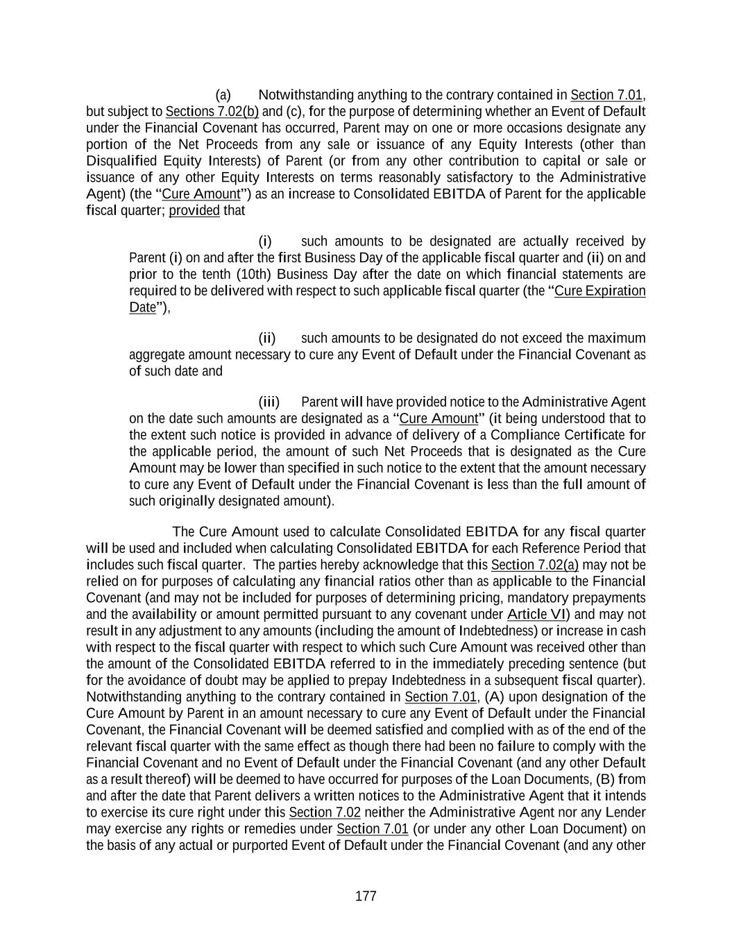 177 (a) Notwithstanding anything to the contrary contained in Section 7.01, but subject to Sections 7.02(b) and (c), for the purpose of determining whether an Event of Default under the Financial Covenant has occurred, Parent may on one or more occasions designate any portion of the Net Proceeds from any sale or issuance of any Equity Interests (other than Disqualified Equity Interests) of Parent (or from any other contribution to capital or sale or issuance of any other Equity Interests on terms reasonably satisfactory to the Administrative Agent) (the “Cure Amount”) as an increase to Consolidated EBITDA of Parent for the applicable fiscal quarter; provided that (i) such amounts to be designated are actually received by Parent (i) on and after the first Business Day of the applicable fiscal quarter and (ii) on and prior to the tenth (10th) Business Day after the date on which financial statements are required to be delivered with respect to such applicable fiscal quarter (the “Cure Expiration Date”), (ii) such amounts to be designated do not exceed the maximum aggregate amount necessary to cure any Event of Default under the Financial Covenant as of such date and (iii) Parent will have provided notice to the Administrative Agent on the date such amounts are designated as a “Cure Amount” (it being understood that to the extent such notice is provided in advance of delivery of a Compliance Certificate for the applicable period, the amount of such Net Proceeds that is designated as the Cure Amount may be lower than specified in such notice to the extent that the amount necessary to cure any Event of Default under the Financial Covenant is less than the full amount of such originally designated amount). The Cure Amount used to calculate Consolidated EBITDA for any fiscal quarter will be used and included when calculating Consolidated EBITDA for each Reference Period that includes such fiscal quarter. The parties hereby acknowledge that this Section 7.02(a) may not be relied on for purposes of calculating any financial ratios other than as applicable to the Financial Covenant (and may not be included for purposes of determining pricing, mandatory prepayments and the availability or amount permitted pursuant to any covenant under Article VI) and may not result in any adjustment to any amounts (including the amount of Indebtedness) or increase in cash with respect to the fiscal quarter with respect to which such Cure Amount was received other than the amount of the Consolidated EBITDA referred to in the immediately preceding sentence (but for the avoidance of doubt may be applied to prepay Indebtedness in a subsequent fiscal quarter). Notwithstanding anything to the contrary contained in Section 7.01, (A) upon designation of the Cure Amount by Parent in an amount necessary to cure any Event of Default under the Financial Covenant, the Financial Covenant will be deemed satisfied and complied with as of the end of the relevant fiscal quarter with the same effect as though there had been no failure to comply with the Financial Covenant and no Event of Default under the Financial Covenant (and any other Default as a result thereof) will be deemed to have occurred for purposes of the Loan Documents, (B) from and after the date that Parent delivers a written notices to the Administrative Agent that it intends to exercise its cure right under this Section 7.02 neither the Administrative Agent nor any Lender may exercise any rights or remedies under Section 7.01 (or under any other Loan Document) on the basis of any actual or purported Event of Default under the Financial Covenant (and any other