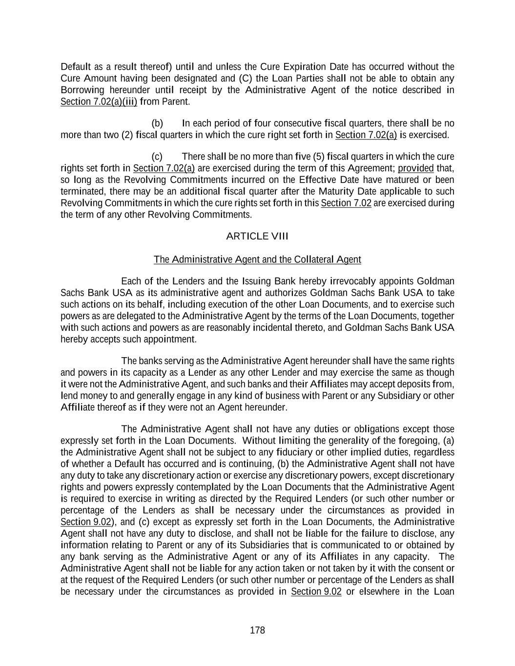 178 Default as a result thereof) until and unless the Cure Expiration Date has occurred without the Cure Amount having been designated and (C) the Loan Parties shall not be able to obtain any Borrowing hereunder until receipt by the Administrative Agent of the notice described in Section 7.02(a)(iii) from Parent. (b) In each period of four consecutive fiscal quarters, there shall be no more than two (2) fiscal quarters in which the cure right set forth in Section 7.02(a) is exercised. (c) There shall be no more than five (5) fiscal quarters in which the cure rights set forth in Section 7.02(a) are exercised during the term of this Agreement; provided that, so long as the Revolving Commitments incurred on the Effective Date have matured or been terminated, there may be an additional fiscal quarter after the Maturity Date applicable to such Revolving Commitments in which the cure rights set forth in this Section 7.02 are exercised during the term of any other Revolving Commitments. ARTICLE VIII The Administrative Agent and the Collateral Agent Each of the Lenders and the Issuing Bank hereby irrevocably appoints Goldman Sachs Bank USA as its administrative agent and authorizes Goldman Sachs Bank USA to take such actions on its behalf, including execution of the other Loan Documents, and to exercise such powers as are delegated to the Administrative Agent by the terms of the Loan Documents, together with such actions and powers as are reasonably incidental thereto, and Goldman Sachs Bank USA hereby accepts such appointment. The banks serving as the Administrative Agent hereunder shall have the same rights and powers in its capacity as a Lender as any other Lender and may exercise the same as though it were not the Administrative Agent, and such banks and their Affiliates may accept deposits from, lend money to and generally engage in any kind of business with Parent or any Subsidiary or other Affiliate thereof as if they were not an Agent hereunder. The Administrative Agent shall not have any duties or obligations except those expressly set forth in the Loan Documents. Without limiting the generality of the foregoing, (a) the Administrative Agent shall not be subject to any fiduciary or other implied duties, regardless of whether a Default has occurred and is continuing, (b) the Administrative Agent shall not have any duty to take any discretionary action or exercise any discretionary powers, except discretionary rights and powers expressly contemplated by the Loan Documents that the Administrative Agent is required to exercise in writing as directed by the Required Lenders (or such other number or percentage of the Lenders as shall be necessary under the circumstances as provided in Section 9.02), and (c) except as expressly set forth in the Loan Documents, the Administrative Agent shall not have any duty to disclose, and shall not be liable for the failure to disclose, any information relating to Parent or any of its Subsidiaries that is communicated to or obtained by any bank serving as the Administrative Agent or any of its Affiliates in any capacity. The Administrative Agent shall not be liable for any action taken or not taken by it with the consent or at the request of the Required Lenders (or such other number or percentage of the Lenders as shall be necessary under the circumstances as provided in Section 9.02 or elsewhere in the Loan