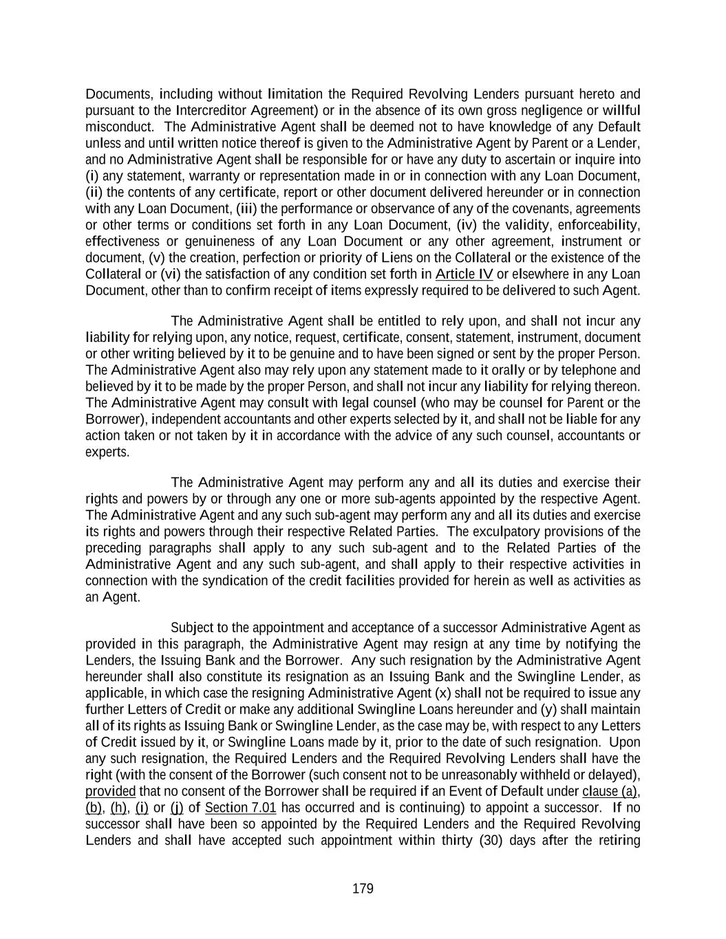 179 Documents, including without limitation the Required Revolving Lenders pursuant hereto and pursuant to the Intercreditor Agreement) or in the absence of its own gross negligence or willful misconduct. The Administrative Agent shall be deemed not to have knowledge of any Default unless and until written notice thereof is given to the Administrative Agent by Parent or a Lender, and no Administrative Agent shall be responsible for or have any duty to ascertain or inquire into (i) any statement, warranty or representation made in or in connection with any Loan Document, (ii) the contents of any certificate, report or other document delivered hereunder or in connection with any Loan Document, (iii) the performance or observance of any of the covenants, agreements or other terms or conditions set forth in any Loan Document, (iv) the validity, enforceability, effectiveness or genuineness of any Loan Document or any other agreement, instrument or document, (v) the creation, perfection or priority of Liens on the Collateral or the existence of the Collateral or (vi) the satisfaction of any condition set forth in Article IV or elsewhere in any Loan Document, other than to confirm receipt of items expressly required to be delivered to such Agent. The Administrative Agent shall be entitled to rely upon, and shall not incur any liability for relying upon, any notice, request, certificate, consent, statement, instrument, document or other writing believed by it to be genuine and to have been signed or sent by the proper Person. The Administrative Agent also may rely upon any statement made to it orally or by telephone and believed by it to be made by the proper Person, and shall not incur any liability for relying thereon. The Administrative Agent may consult with legal counsel (who may be counsel for Parent or the Borrower), independent accountants and other experts selected by it, and shall not be liable for any action taken or not taken by it in accordance with the advice of any such counsel, accountants or experts. The Administrative Agent may perform any and all its duties and exercise their rights and powers by or through any one or more sub-agents appointed by the respective Agent. The Administrative Agent and any such sub-agent may perform any and all its duties and exercise its rights and powers through their respective Related Parties. The exculpatory provisions of the preceding paragraphs shall apply to any such sub-agent and to the Related Parties of the Administrative Agent and any such sub-agent, and shall apply to their respective activities in connection with the syndication of the credit facilities provided for herein as well as activities as an Agent. Subject to the appointment and acceptance of a successor Administrative Agent as provided in this paragraph, the Administrative Agent may resign at any time by notifying the Lenders, the Issuing Bank and the Borrower. Any such resignation by the Administrative Agent hereunder shall also constitute its resignation as an Issuing Bank and the Swingline Lender, as applicable, in which case the resigning Administrative Agent (x) shall not be required to issue any further Letters of Credit or make any additional Swingline Loans hereunder and (y) shall maintain all of its rights as Issuing Bank or Swingline Lender, as the case may be, with respect to any Letters of Credit issued by it, or Swingline Loans made by it, prior to the date of such resignation. Upon any such resignation, the Required Lenders and the Required Revolving Lenders shall have the right (with the consent of the Borrower (such consent not to be unreasonably withheld or delayed), provided that no consent of the Borrower shall be required if an Event of Default under clause (a), (b), (h), (i) or (j) of Section 7.01 has occurred and is continuing) to appoint a successor. If no successor shall have been so appointed by the Required Lenders and the Required Revolving Lenders and shall have accepted such appointment within thirty (30) days after the retiring
