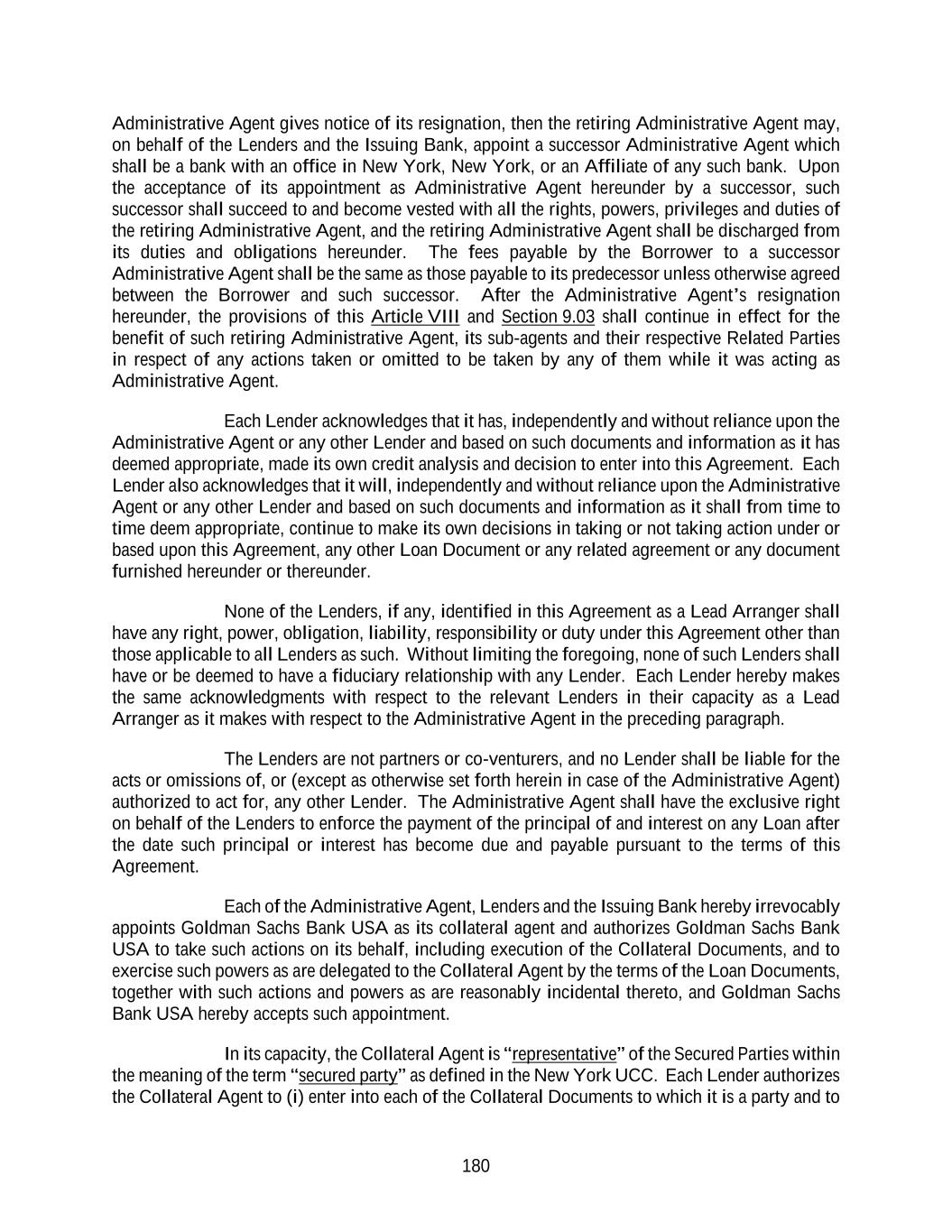 180 Administrative Agent gives notice of its resignation, then the retiring Administrative Agent may, on behalf of the Lenders and the Issuing Bank, appoint a successor Administrative Agent which shall be a bank with an office in New York, New York, or an Affiliate of any such bank. Upon the acceptance of its appointment as Administrative Agent hereunder by a successor, such successor shall succeed to and become vested with all the rights, powers, privileges and duties of the retiring Administrative Agent, and the retiring Administrative Agent shall be discharged from its duties and obligations hereunder. The fees payable by the Borrower to a successor Administrative Agent shall be the same as those payable to its predecessor unless otherwise agreed between the Borrower and such successor. After the Administrative Agent’s resignation hereunder, the provisions of this Article VIII and Section 9.03 shall continue in effect for the benefit of such retiring Administrative Agent, its sub-agents and their respective Related Parties in respect of any actions taken or omitted to be taken by any of them while it was acting as Administrative Agent. Each Lender acknowledges that it has, independently and without reliance upon the Administrative Agent or any other Lender and based on such documents and information as it has deemed appropriate, made its own credit analysis and decision to enter into this Agreement. Each Lender also acknowledges that it will, independently and without reliance upon the Administrative Agent or any other Lender and based on such documents and information as it shall from time to time deem appropriate, continue to make its own decisions in taking or not taking action under or based upon this Agreement, any other Loan Document or any related agreement or any document furnished hereunder or thereunder. None of the Lenders, if any, identified in this Agreement as a Lead Arranger shall have any right, power, obligation, liability, responsibility or duty under this Agreement other than those applicable to all Lenders as such. Without limiting the foregoing, none of such Lenders shall have or be deemed to have a fiduciary relationship with any Lender. Each Lender hereby makes the same acknowledgments with respect to the relevant Lenders in their capacity as a Lead Arranger as it makes with respect to the Administrative Agent in the preceding paragraph. The Lenders are not partners or co-venturers, and no Lender shall be liable for the acts or omissions of, or (except as otherwise set forth herein in case of the Administrative Agent) authorized to act for, any other Lender. The Administrative Agent shall have the exclusive right on behalf of the Lenders to enforce the payment of the principal of and interest on any Loan after the date such principal or interest has become due and payable pursuant to the terms of this Agreement. Each of the Administrative Agent, Lenders and the Issuing Bank hereby irrevocably appoints Goldman Sachs Bank USA as its collateral agent and authorizes Goldman Sachs Bank USA to take such actions on its behalf, including execution of the Collateral Documents, and to exercise such powers as are delegated to the Collateral Agent by the terms of the Loan Documents, together with such actions and powers as are reasonably incidental thereto, and Goldman Sachs Bank USA hereby accepts such appointment. In its capacity, the Collateral Agent is “representative” of the Secured Parties within the meaning of the term “secured party” as defined in the New York UCC. Each Lender authorizes the Collateral Agent to (i) enter into each of the Collateral Documents to which it is a party and to