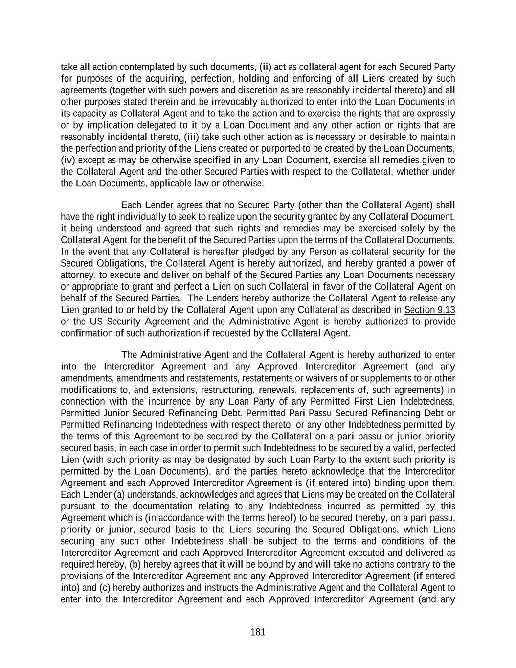 181 take all action contemplated by such documents, (ii) act as collateral agent for each Secured Party for purposes of the acquiring, perfection, holding and enforcing of all Liens created by such agreements (together with such powers and discretion as are reasonably incidental thereto) and all other purposes stated therein and be irrevocably authorized to enter into the Loan Documents in its capacity as Collateral Agent and to take the action and to exercise the rights that are expressly or by implication delegated to it by a Loan Document and any other action or rights that are reasonably incidental thereto, (iii) take such other action as is necessary or desirable to maintain the perfection and priority of the Liens created or purported to be created by the Loan Documents, (iv) except as may be otherwise specified in any Loan Document, exercise all remedies given to the Collateral Agent and the other Secured Parties with respect to the Collateral, whether under the Loan Documents, applicable law or otherwise. Each Lender agrees that no Secured Party (other than the Collateral Agent) shall have the right individually to seek to realize upon the security granted by any Collateral Document, it being understood and agreed that such rights and remedies may be exercised solely by the Collateral Agent for the benefit of the Secured Parties upon the terms of the Collateral Documents. In the event that any Collateral is hereafter pledged by any Person as collateral security for the Secured Obligations, the Collateral Agent is hereby authorized, and hereby granted a power of attorney, to execute and deliver on behalf of the Secured Parties any Loan Documents necessary or appropriate to grant and perfect a Lien on such Collateral in favor of the Collateral Agent on behalf of the Secured Parties. The Lenders hereby authorize the Collateral Agent to release any Lien granted to or held by the Collateral Agent upon any Collateral as described in Section 9.13 or the US Security Agreement and the Administrative Agent is hereby authorized to provide confirmation of such authorization if requested by the Collateral Agent. The Administrative Agent and the Collateral Agent is hereby authorized to enter into the Intercreditor Agreement and any Approved Intercreditor Agreement (and any amendments, amendments and restatements, restatements or waivers of or supplements to or other modifications to, and extensions, restructuring, renewals, replacements of, such agreements) in connection with the incurrence by any Loan Party of any Permitted First Lien Indebtedness, Permitted Junior Secured Refinancing Debt, Permitted Pari Passu Secured Refinancing Debt or Permitted Refinancing Indebtedness with respect thereto, or any other Indebtedness permitted by the terms of this Agreement to be secured by the Collateral on a pari passu or junior priority secured basis, in each case in order to permit such Indebtedness to be secured by a valid, perfected Lien (with such priority as may be designated by such Loan Party to the extent such priority is permitted by the Loan Documents), and the parties hereto acknowledge that the Intercreditor Agreement and each Approved Intercreditor Agreement is (if entered into) binding upon them. Each Lender (a) understands, acknowledges and agrees that Liens may be created on the Collateral pursuant to the documentation relating to any Indebtedness incurred as permitted by this Agreement which is (in accordance with the terms hereof) to be secured thereby, on a pari passu, priority or junior, secured basis to the Liens securing the Secured Obligations, which Liens securing any such other Indebtedness shall be subject to the terms and conditions of the Intercreditor Agreement and each Approved Intercreditor Agreement executed and delivered as required hereby, (b) hereby agrees that it will be bound by and will take no actions contrary to the provisions of the Intercreditor Agreement and any Approved Intercreditor Agreement (if entered into) and (c) hereby authorizes and instructs the Administrative Agent and the Collateral Agent to enter into the Intercreditor Agreement and each Approved Intercreditor Agreement (and any