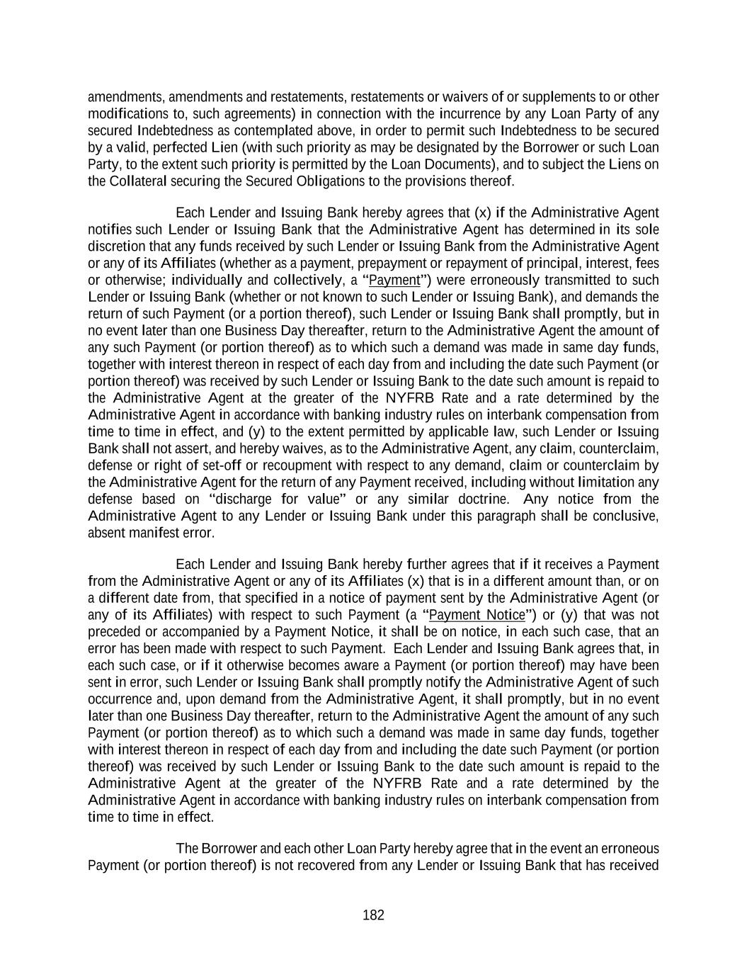 182 amendments, amendments and restatements, restatements or waivers of or supplements to or other modifications to, such agreements) in connection with the incurrence by any Loan Party of any secured Indebtedness as contemplated above, in order to permit such Indebtedness to be secured by a valid, perfected Lien (with such priority as may be designated by the Borrower or such Loan Party, to the extent such priority is permitted by the Loan Documents), and to subject the Liens on the Collateral securing the Secured Obligations to the provisions thereof. Each Lender and Issuing Bank hereby agrees that (x) if the Administrative Agent notifies such Lender or Issuing Bank that the Administrative Agent has determined in its sole discretion that any funds received by such Lender or Issuing Bank from the Administrative Agent or any of its Affiliates (whether as a payment, prepayment or repayment of principal, interest, fees or otherwise; individually and collectively, a “Payment”) were erroneously transmitted to such Lender or Issuing Bank (whether or not known to such Lender or Issuing Bank), and demands the return of such Payment (or a portion thereof), such Lender or Issuing Bank shall promptly, but in no event later than one Business Day thereafter, return to the Administrative Agent the amount of any such Payment (or portion thereof) as to which such a demand was made in same day funds, together with interest thereon in respect of each day from and including the date such Payment (or portion thereof) was received by such Lender or Issuing Bank to the date such amount is repaid to the Administrative Agent at the greater of the NYFRB Rate and a rate determined by the Administrative Agent in accordance with banking industry rules on interbank compensation from time to time in effect, and (y) to the extent permitted by applicable law, such Lender or Issuing Bank shall not assert, and hereby waives, as to the Administrative Agent, any claim, counterclaim, defense or right of set-off or recoupment with respect to any demand, claim or counterclaim by the Administrative Agent for the return of any Payment received, including without limitation any defense based on “discharge for value” or any similar doctrine. Any notice from the Administrative Agent to any Lender or Issuing Bank under this paragraph shall be conclusive, absent manifest error. Each Lender and Issuing Bank hereby further agrees that if it receives a Payment from the Administrative Agent or any of its Affiliates (x) that is in a different amount than, or on a different date from, that specified in a notice of payment sent by the Administrative Agent (or any of its Affiliates) with respect to such Payment (a “Payment Notice”) or (y) that was not preceded or accompanied by a Payment Notice, it shall be on notice, in each such case, that an error has been made with respect to such Payment. Each Lender and Issuing Bank agrees that, in each such case, or if it otherwise becomes aware a Payment (or portion thereof) may have been sent in error, such Lender or Issuing Bank shall promptly notify the Administrative Agent of such occurrence and, upon demand from the Administrative Agent, it shall promptly, but in no event later than one Business Day thereafter, return to the Administrative Agent the amount of any such Payment (or portion thereof) as to which such a demand was made in same day funds, together with interest thereon in respect of each day from and including the date such Payment (or portion thereof) was received by such Lender or Issuing Bank to the date such amount is repaid to the Administrative Agent at the greater of the NYFRB Rate and a rate determined by the Administrative Agent in accordance with banking industry rules on interbank compensation from time to time in effect. The Borrower and each other Loan Party hereby agree that in the event an erroneous Payment (or portion thereof) is not recovered from any Lender or Issuing Bank that has received