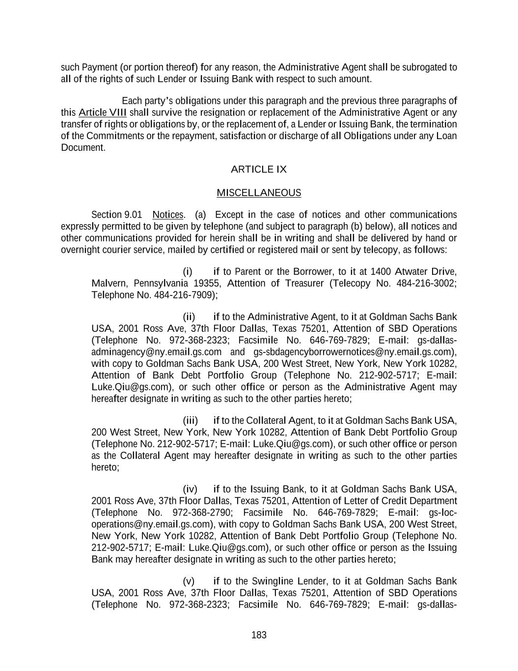 183 such Payment (or portion thereof) for any reason, the Administrative Agent shall be subrogated to all of the rights of such Lender or Issuing Bank with respect to such amount. Each party’s obligations under this paragraph and the previous three paragraphs of this Article VIII shall survive the resignation or replacement of the Administrative Agent or any transfer of rights or obligations by, or the replacement of, a Lender or Issuing Bank, the termination of the Commitments or the repayment, satisfaction or discharge of all Obligations under any Loan Document. ARTICLE IX MISCELLANEOUS Section 9.01 Notices. (a) Except in the case of notices and other communications expressly permitted to be given by telephone (and subject to paragraph (b) below), all notices and other communications provided for herein shall be in writing and shall be delivered by hand or overnight courier service, mailed by certified or registered mail or sent by telecopy, as follows: (i) if to Parent or the Borrower, to it at 1400 Atwater Drive, Malvern, Pennsylvania 19355, Attention of Treasurer (Telecopy No. 484-216-3002; Telephone No. 484-216-7909); (ii) if to the Administrative Agent, to it at Goldman Sachs Bank USA, 2001 Ross Ave, 37th Floor Dallas, Texas 75201, Attention of SBD Operations (Telephone No. 972-368-2323; Facsimile No. 646-769-7829; E-mail: gs-dallas- adminagency@ny.email.gs.com and gs-sbdagencyborrowernotices@ny.email.gs.com), with copy to Goldman Sachs Bank USA, 200 West Street, New York, New York 10282, Attention of Bank Debt Portfolio Group (Telephone No. 212-902-5717; E-mail: Luke.Qiu@gs.com), or such other office or person as the Administrative Agent may hereafter designate in writing as such to the other parties hereto; (iii) if to the Collateral Agent, to it at Goldman Sachs Bank USA, 200 West Street, New York, New York 10282, Attention of Bank Debt Portfolio Group (Telephone No. 212-902-5717; E-mail: Luke.Qiu@gs.com), or such other office or person as the Collateral Agent may hereafter designate in writing as such to the other parties hereto; (iv) if to the Issuing Bank, to it at Goldman Sachs Bank USA, 2001 Ross Ave, 37th Floor Dallas, Texas 75201, Attention of Letter of Credit Department (Telephone No. 972-368-2790; Facsimile No. 646-769-7829; E-mail: gs-loc- operations@ny.email.gs.com), with copy to Goldman Sachs Bank USA, 200 West Street, New York, New York 10282, Attention of Bank Debt Portfolio Group (Telephone No. 212-902-5717; E-mail: Luke.Qiu@gs.com), or such other office or person as the Issuing Bank may hereafter designate in writing as such to the other parties hereto; (v) if to the Swingline Lender, to it at Goldman Sachs Bank USA, 2001 Ross Ave, 37th Floor Dallas, Texas 75201, Attention of SBD Operations (Telephone No. 972-368-2323; Facsimile No. 646-769-7829; E-mail: gs-dallas-
