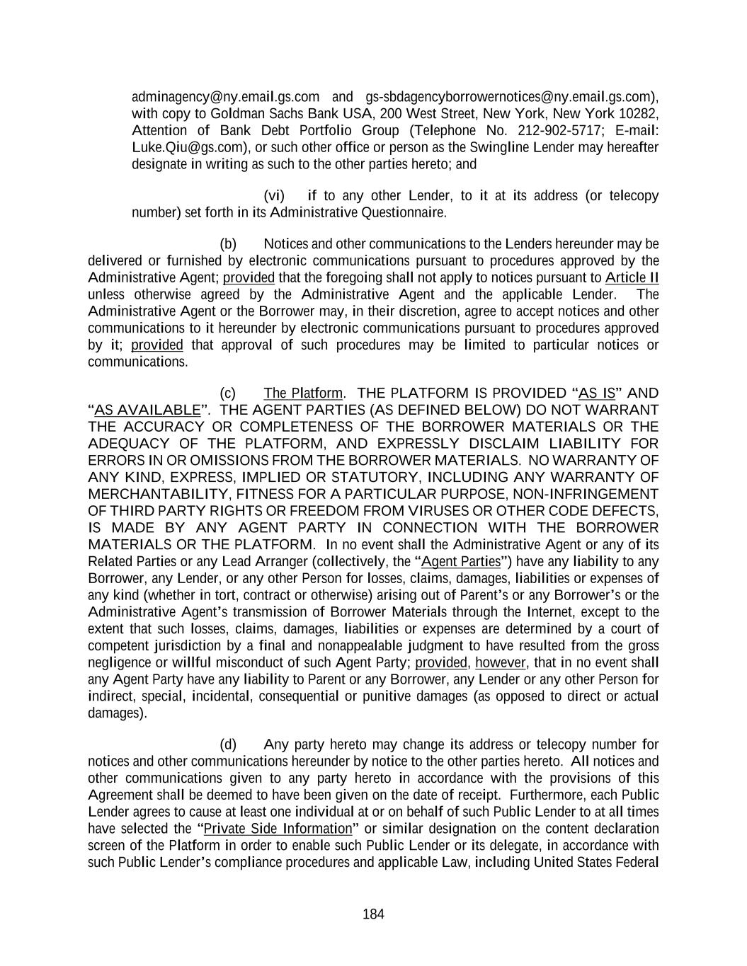 184 adminagency@ny.email.gs.com and gs-sbdagencyborrowernotices@ny.email.gs.com), with copy to Goldman Sachs Bank USA, 200 West Street, New York, New York 10282, Attention of Bank Debt Portfolio Group (Telephone No. 212-902-5717; E-mail: Luke.Qiu@gs.com), or such other office or person as the Swingline Lender may hereafter designate in writing as such to the other parties hereto; and (vi) if to any other Lender, to it at its address (or telecopy number) set forth in its Administrative Questionnaire. (b) Notices and other communications to the Lenders hereunder may be delivered or furnished by electronic communications pursuant to procedures approved by the Administrative Agent; provided that the foregoing shall not apply to notices pursuant to Article II unless otherwise agreed by the Administrative Agent and the applicable Lender. The Administrative Agent or the Borrower may, in their discretion, agree to accept notices and other communications to it hereunder by electronic communications pursuant to procedures approved by it; provided that approval of such procedures may be limited to particular notices or communications. (c) The Platform. THE PLATFORM IS PROVIDED “AS IS” AND “AS AVAILABLE”. THE AGENT PARTIES (AS DEFINED BELOW) DO NOT WARRANT THE ACCURACY OR COMPLETENESS OF THE BORROWER MATERIALS OR THE ADEQUACY OF THE PLATFORM, AND EXPRESSLY DISCLAIM LIABILITY FOR ERRORS IN OR OMISSIONS FROM THE BORROWER MATERIALS. NO WARRANTY OF ANY KIND, EXPRESS, IMPLIED OR STATUTORY, INCLUDING ANY WARRANTY OF MERCHANTABILITY, FITNESS FOR A PARTICULAR PURPOSE, NON-INFRINGEMENT OF THIRD PARTY RIGHTS OR FREEDOM FROM VIRUSES OR OTHER CODE DEFECTS, IS MADE BY ANY AGENT PARTY IN CONNECTION WITH THE BORROWER MATERIALS OR THE PLATFORM. In no event shall the Administrative Agent or any of its Related Parties or any Lead Arranger (collectively, the “Agent Parties”) have any liability to any Borrower, any Lender, or any other Person for losses, claims, damages, liabilities or expenses of any kind (whether in tort, contract or otherwise) arising out of Parent’s or any Borrower’s or the Administrative Agent’s transmission of Borrower Materials through the Internet, except to the extent that such losses, claims, damages, liabilities or expenses are determined by a court of competent jurisdiction by a final and nonappealable judgment to have resulted from the gross negligence or willful misconduct of such Agent Party; provided, however, that in no event shall any Agent Party have any liability to Parent or any Borrower, any Lender or any other Person for indirect, special, incidental, consequential or punitive damages (as opposed to direct or actual damages). (d) Any party hereto may change its address or telecopy number for notices and other communications hereunder by notice to the other parties hereto. All notices and other communications given to any party hereto in accordance with the provisions of this Agreement shall be deemed to have been given on the date of receipt. Furthermore, each Public Lender agrees to cause at least one individual at or on behalf of such Public Lender to at all times have selected the “Private Side Information” or similar designation on the content declaration screen of the Platform in order to enable such Public Lender or its delegate, in accordance with such Public Lender’s compliance procedures and applicable Law, including United States Federal