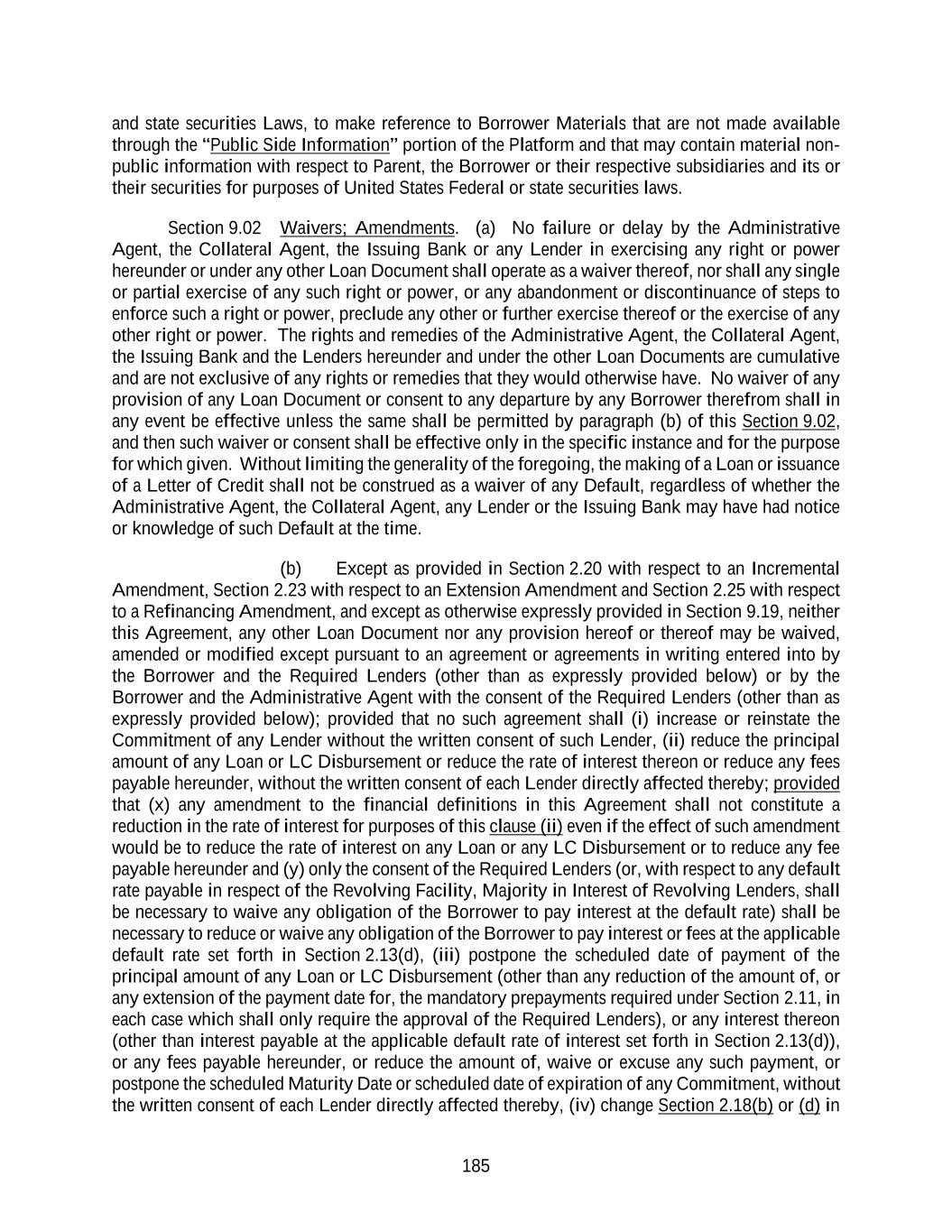 185 and state securities Laws, to make reference to Borrower Materials that are not made available through the “Public Side Information” portion of the Platform and that may contain material non- public information with respect to Parent, the Borrower or their respective subsidiaries and its or their securities for purposes of United States Federal or state securities laws. Section 9.02 Waivers; Amendments. (a) No failure or delay by the Administrative Agent, the Collateral Agent, the Issuing Bank or any Lender in exercising any right or power hereunder or under any other Loan Document shall operate as a waiver thereof, nor shall any single or partial exercise of any such right or power, or any abandonment or discontinuance of steps to enforce such a right or power, preclude any other or further exercise thereof or the exercise of any other right or power. The rights and remedies of the Administrative Agent, the Collateral Agent, the Issuing Bank and the Lenders hereunder and under the other Loan Documents are cumulative and are not exclusive of any rights or remedies that they would otherwise have. No waiver of any provision of any Loan Document or consent to any departure by any Borrower therefrom shall in any event be effective unless the same shall be permitted by paragraph (b) of this Section 9.02, and then such waiver or consent shall be effective only in the specific instance and for the purpose for which given. Without limiting the generality of the foregoing, the making of a Loan or issuance of a Letter of Credit shall not be construed as a waiver of any Default, regardless of whether the Administrative Agent, the Collateral Agent, any Lender or the Issuing Bank may have had notice or knowledge of such Default at the time. (b) Except as provided in Section 2.20 with respect to an Incremental Amendment, Section 2.23 with respect to an Extension Amendment and Section 2.25 with respect to a Refinancing Amendment, and except as otherwise expressly provided in Section 9.19, neither this Agreement, any other Loan Document nor any provision hereof or thereof may be waived, amended or modified except pursuant to an agreement or agreements in writing entered into by the Borrower and the Required Lenders (other than as expressly provided below) or by the Borrower and the Administrative Agent with the consent of the Required Lenders (other than as expressly provided below); provided that no such agreement shall (i) increase or reinstate the Commitment of any Lender without the written consent of such Lender, (ii) reduce the principal amount of any Loan or LC Disbursement or reduce the rate of interest thereon or reduce any fees payable hereunder, without the written consent of each Lender directly affected thereby; provided that (x) any amendment to the financial definitions in this Agreement shall not constitute a reduction in the rate of interest for purposes of this clause (ii) even if the effect of such amendment would be to reduce the rate of interest on any Loan or any LC Disbursement or to reduce any fee payable hereunder and (y) only the consent of the Required Lenders (or, with respect to any default rate payable in respect of the Revolving Facility, Majority in Interest of Revolving Lenders, shall be necessary to waive any obligation of the Borrower to pay interest at the default rate) shall be necessary to reduce or waive any obligation of the Borrower to pay interest or fees at the applicable default rate set forth in Section 2.13(d), (iii) postpone the scheduled date of payment of the principal amount of any Loan or LC Disbursement (other than any reduction of the amount of, or any extension of the payment date for, the mandatory prepayments required under Section 2.11, in each case which shall only require the approval of the Required Lenders), or any interest thereon (other than interest payable at the applicable default rate of interest set forth in Section 2.13(d)), or any fees payable hereunder, or reduce the amount of, waive or excuse any such payment, or postpone the scheduled Maturity Date or scheduled date of expiration of any Commitment, without the written consent of each Lender directly affected thereby, (iv) change Section 2.18(b) or (d) in