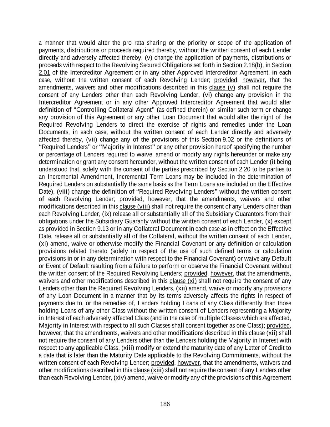 186 a manner that would alter the pro rata sharing or the priority or scope of the application of payments, distributions or proceeds required thereby, without the written consent of each Lender directly and adversely affected thereby, (v) change the application of payments, distributions or proceeds with respect to the Revolving Secured Obligations set forth in Section 2.18(b), in Section 2.01 of the Intercreditor Agreement or in any other Approved Intercreditor Agreement, in each case, without the written consent of each Revolving Lender; provided, however, that the amendments, waivers and other modifications described in this clause (v) shall not require the consent of any Lenders other than each Revolving Lender, (vi) change any provision in the Intercreditor Agreement or in any other Approved Intercreditor Agreement that would alter definition of “Controlling Collateral Agent” (as defined therein) or similar such term or change any provision of this Agreement or any other Loan Document that would alter the right of the Required Revolving Lenders to direct the exercise of rights and remedies under the Loan Documents, in each case, without the written consent of each Lender directly and adversely affected thereby, (vii) change any of the provisions of this Section 9.02 or the definitions of “Required Lenders” or “Majority in Interest” or any other provision hereof specifying the number or percentage of Lenders required to waive, amend or modify any rights hereunder or make any determination or grant any consent hereunder, without the written consent of each Lender (it being understood that, solely with the consent of the parties prescribed by Section 2.20 to be parties to an Incremental Amendment, Incremental Term Loans may be included in the determination of Required Lenders on substantially the same basis as the Term Loans are included on the Effective Date), (viii) change the definition of “Required Revolving Lenders” without the written consent of each Revolving Lender; provided, however, that the amendments, waivers and other modifications described in this clause (viii) shall not require the consent of any Lenders other than each Revolving Lender, (ix) release all or substantially all of the Subsidiary Guarantors from their obligations under the Subsidiary Guaranty without the written consent of each Lender, (x) except as provided in Section 9.13 or in any Collateral Document in each case as in effect on the Effective Date, release all or substantially all of the Collateral, without the written consent of each Lender, (xi) amend, waive or otherwise modify the Financial Covenant or any definition or calculation provisions related thereto (solely in respect of the use of such defined terms or calculation provisions in or in any determination with respect to the Financial Covenant) or waive any Default or Event of Default resulting from a failure to perform or observe the Financial Covenant without the written consent of the Required Revolving Lenders; provided, however, that the amendments, waivers and other modifications described in this clause (xi) shall not require the consent of any Lenders other than the Required Revolving Lenders, (xii) amend, waive or modify any provisions of any Loan Document in a manner that by its terms adversely affects the rights in respect of payments due to, or the remedies of, Lenders holding Loans of any Class differently than those holding Loans of any other Class without the written consent of Lenders representing a Majority in Interest of each adversely affected Class (and in the case of multiple Classes which are affected, Majority in Interest with respect to all such Classes shall consent together as one Class); provided, however, that the amendments, waivers and other modifications described in this clause (xii) shall not require the consent of any Lenders other than the Lenders holding the Majority in Interest with respect to any applicable Class, (xiii) modify or extend the maturity date of any Letter of Credit to a date that is later than the Maturity Date applicable to the Revolving Commitments, without the written consent of each Revolving Lender; provided, however, that the amendments, waivers and other modifications described in this clause (xiii) shall not require the consent of any Lenders other than each Revolving Lender, (xiv) amend, waive or modify any of the provisions of this Agreement