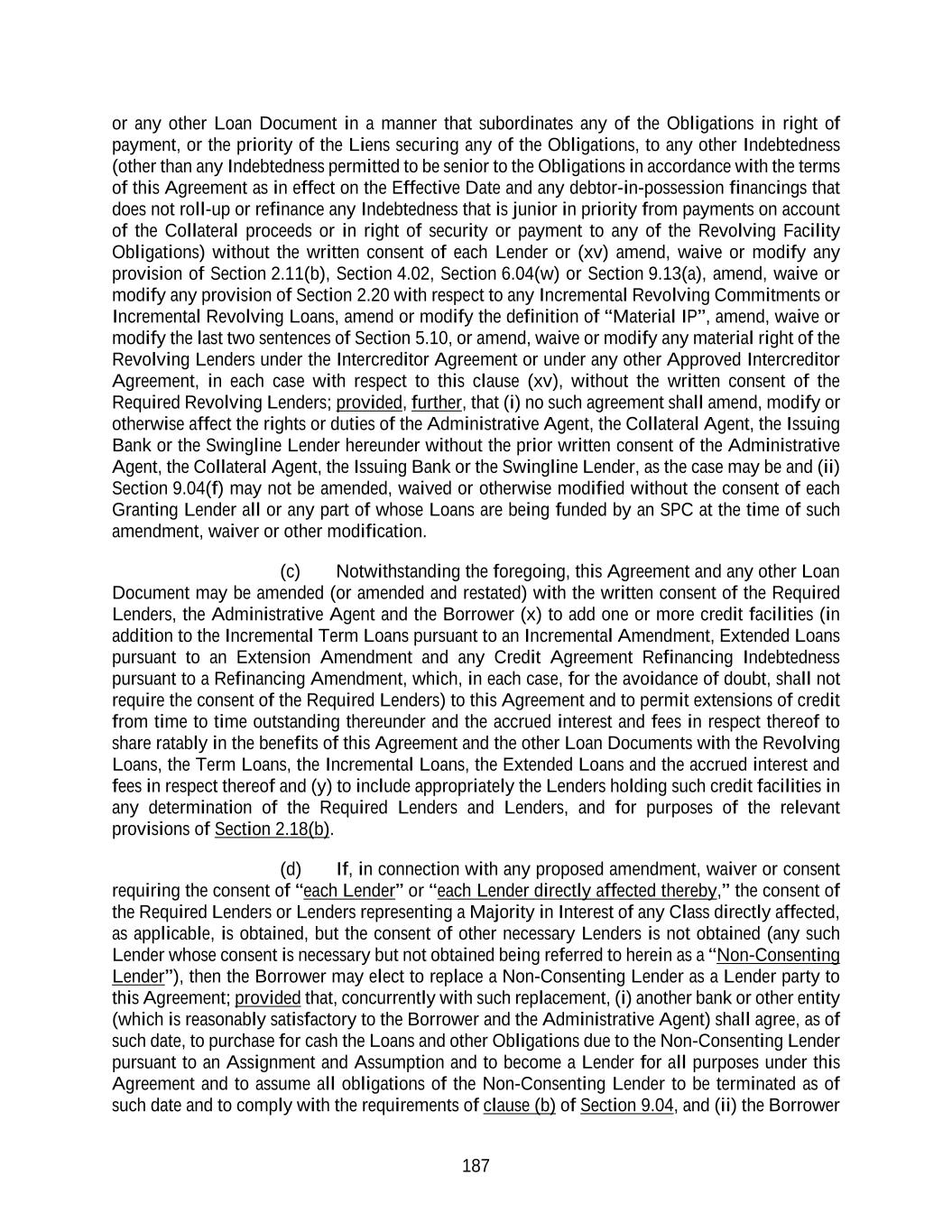 187 or any other Loan Document in a manner that subordinates any of the Obligations in right of payment, or the priority of the Liens securing any of the Obligations, to any other Indebtedness (other than any Indebtedness permitted to be senior to the Obligations in accordance with the terms of this Agreement as in effect on the Effective Date and any debtor-in-possession financings that does not roll-up or refinance any Indebtedness that is junior in priority from payments on account of the Collateral proceeds or in right of security or payment to any of the Revolving Facility Obligations) without the written consent of each Lender or (xv) amend, waive or modify any provision of Section 2.11(b), Section 4.02, Section 6.04(w) or Section 9.13(a), amend, waive or modify any provision of Section 2.20 with respect to any Incremental Revolving Commitments or Incremental Revolving Loans, amend or modify the definition of “Material IP”, amend, waive or modify the last two sentences of Section 5.10, or amend, waive or modify any material right of the Revolving Lenders under the Intercreditor Agreement or under any other Approved Intercreditor Agreement, in each case with respect to this clause (xv), without the written consent of the Required Revolving Lenders; provided, further, that (i) no such agreement shall amend, modify or otherwise affect the rights or duties of the Administrative Agent, the Collateral Agent, the Issuing Bank or the Swingline Lender hereunder without the prior written consent of the Administrative Agent, the Collateral Agent, the Issuing Bank or the Swingline Lender, as the case may be and (ii) Section 9.04(f) may not be amended, waived or otherwise modified without the consent of each Granting Lender all or any part of whose Loans are being funded by an SPC at the time of such amendment, waiver or other modification. (c) Notwithstanding the foregoing, this Agreement and any other Loan Document may be amended (or amended and restated) with the written consent of the Required Lenders, the Administrative Agent and the Borrower (x) to add one or more credit facilities (in addition to the Incremental Term Loans pursuant to an Incremental Amendment, Extended Loans pursuant to an Extension Amendment and any Credit Agreement Refinancing Indebtedness pursuant to a Refinancing Amendment, which, in each case, for the avoidance of doubt, shall not require the consent of the Required Lenders) to this Agreement and to permit extensions of credit from time to time outstanding thereunder and the accrued interest and fees in respect thereof to share ratably in the benefits of this Agreement and the other Loan Documents with the Revolving Loans, the Term Loans, the Incremental Loans, the Extended Loans and the accrued interest and fees in respect thereof and (y) to include appropriately the Lenders holding such credit facilities in any determination of the Required Lenders and Lenders, and for purposes of the relevant provisions of Section 2.18(b). (d) If, in connection with any proposed amendment, waiver or consent requiring the consent of “each Lender” or “each Lender directly affected thereby,” the consent of the Required Lenders or Lenders representing a Majority in Interest of any Class directly affected, as applicable, is obtained, but the consent of other necessary Lenders is not obtained (any such Lender whose consent is necessary but not obtained being referred to herein as a “Non-Consenting Lender”), then the Borrower may elect to replace a Non-Consenting Lender as a Lender party to this Agreement; provided that, concurrently with such replacement, (i) another bank or other entity (which is reasonably satisfactory to the Borrower and the Administrative Agent) shall agree, as of such date, to purchase for cash the Loans and other Obligations due to the Non-Consenting Lender pursuant to an Assignment and Assumption and to become a Lender for all purposes under this Agreement and to assume all obligations of the Non-Consenting Lender to be terminated as of such date and to comply with the requirements of clause (b) of Section 9.04, and (ii) the Borrower