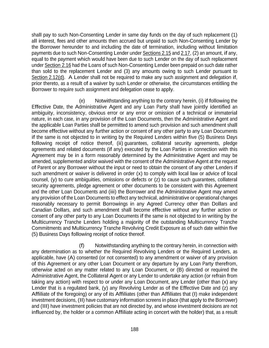 188 shall pay to such Non-Consenting Lender in same day funds on the day of such replacement (1) all interest, fees and other amounts then accrued but unpaid to such Non-Consenting Lender by the Borrower hereunder to and including the date of termination, including without limitation payments due to such Non-Consenting Lender under Sections 2.15 and 2.17, (2) an amount, if any, equal to the payment which would have been due to such Lender on the day of such replacement under Section 2.16 had the Loans of such Non-Consenting Lender been prepaid on such date rather than sold to the replacement Lender and (3) any amounts owing to such Lender pursuant to Section 2.12(d). A Lender shall not be required to make any such assignment and delegation if, prior thereto, as a result of a waiver by such Lender or otherwise, the circumstances entitling the Borrower to require such assignment and delegation cease to apply. (e) Notwithstanding anything to the contrary herein, (i) if following the Effective Date, the Administrative Agent and any Loan Party shall have jointly identified an ambiguity, inconsistency, obvious error or any error or omission of a technical or immaterial nature, in each case, in any provision of the Loan Documents, then the Administrative Agent and the applicable Loan Parties shall be permitted to amend such provision and such amendment shall become effective without any further action or consent of any other party to any Loan Documents if the same is not objected to in writing by the Required Lenders within five (5) Business Days following receipt of notice thereof, (ii) guarantees, collateral security agreements, pledge agreements and related documents (if any) executed by the Loan Parties in connection with this Agreement may be in a form reasonably determined by the Administrative Agent and may be amended, supplemented and/or waived with the consent of the Administrative Agent at the request of Parent or any Borrower without the input or need to obtain the consent of any other Lenders if such amendment or waiver is delivered in order (x) to comply with local law or advice of local counsel, (y) to cure ambiguities, omissions or defects or (z) to cause such guarantees, collateral security agreements, pledge agreement or other documents to be consistent with this Agreement and the other Loan Documents and (iii) the Borrower and the Administrative Agent may amend any provision of the Loan Documents to effect any technical, administrative or operational changes reasonably necessary to permit Borrowings in any Agreed Currency other than Dollars and Canadian Dollars, and such amendment shall become effective without any further action or consent of any other party to any Loan Documents if the same is not objected to in writing by the Multicurrency Tranche Lenders holding a majority of the outstanding Multicurrency Tranche Commitments and Multicurrency Tranche Revolving Credit Exposure as of such date within five (5) Business Days following receipt of notice thereof. (f) Notwithstanding anything to the contrary herein, in connection with any determination as to whether the Required Revolving Lenders or the Required Lenders, as applicable, have (A) consented (or not consented) to any amendment or waiver of any provision of this Agreement or any other Loan Document or any departure by any Loan Party therefrom, otherwise acted on any matter related to any Loan Document, or (B) directed or required the Administrative Agent, the Collateral Agent or any Lender to undertake any action (or refrain from taking any action) with respect to or under any Loan Document, any Lender (other than (x) any Lender that is a regulated bank, (y) any Revolving Lender as of the Effective Date and (z) any Affiliate of the foregoing) or any of its Affiliates (other than Affiliates that (I) make independent investment decisions, (II) have customary information screens in place (that apply to the Borrower) and (III) have investment policies that are not directed by, and whose investment decisions are not influenced by, the holder or a common Affiliate acting in concert with the holder) that, as a result
