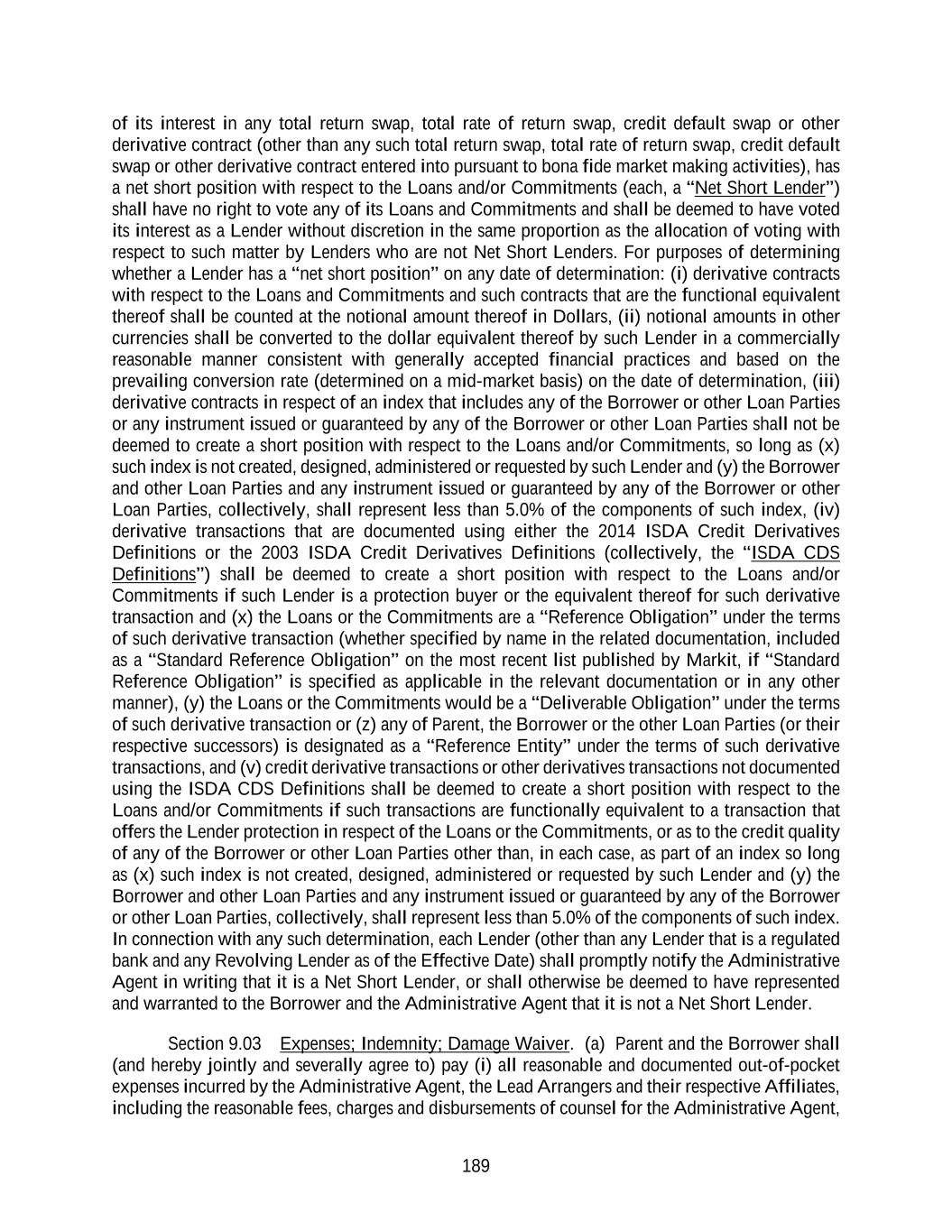 189 of its interest in any total return swap, total rate of return swap, credit default swap or other derivative contract (other than any such total return swap, total rate of return swap, credit default swap or other derivative contract entered into pursuant to bona fide market making activities), has a net short position with respect to the Loans and/or Commitments (each, a “Net Short Lender”) shall have no right to vote any of its Loans and Commitments and shall be deemed to have voted its interest as a Lender without discretion in the same proportion as the allocation of voting with respect to such matter by Lenders who are not Net Short Lenders. For purposes of determining whether a Lender has a “net short position” on any date of determination: (i) derivative contracts with respect to the Loans and Commitments and such contracts that are the functional equivalent thereof shall be counted at the notional amount thereof in Dollars, (ii) notional amounts in other currencies shall be converted to the dollar equivalent thereof by such Lender in a commercially reasonable manner consistent with generally accepted financial practices and based on the prevailing conversion rate (determined on a mid-market basis) on the date of determination, (iii) derivative contracts in respect of an index that includes any of the Borrower or other Loan Parties or any instrument issued or guaranteed by any of the Borrower or other Loan Parties shall not be deemed to create a short position with respect to the Loans and/or Commitments, so long as (x) such index is not created, designed, administered or requested by such Lender and (y) the Borrower and other Loan Parties and any instrument issued or guaranteed by any of the Borrower or other Loan Parties, collectively, shall represent less than 5.0% of the components of such index, (iv) derivative transactions that are documented using either the 2014 ISDA Credit Derivatives Definitions or the 2003 ISDA Credit Derivatives Definitions (collectively, the “ISDA CDS Definitions”) shall be deemed to create a short position with respect to the Loans and/or Commitments if such Lender is a protection buyer or the equivalent thereof for such derivative transaction and (x) the Loans or the Commitments are a “Reference Obligation” under the terms of such derivative transaction (whether specified by name in the related documentation, included as a “Standard Reference Obligation” on the most recent list published by Markit, if “Standard Reference Obligation” is specified as applicable in the relevant documentation or in any other manner), (y) the Loans or the Commitments would be a “Deliverable Obligation” under the terms of such derivative transaction or (z) any of Parent, the Borrower or the other Loan Parties (or their respective successors) is designated as a “Reference Entity” under the terms of such derivative transactions, and (v) credit derivative transactions or other derivatives transactions not documented using the ISDA CDS Definitions shall be deemed to create a short position with respect to the Loans and/or Commitments if such transactions are functionally equivalent to a transaction that offers the Lender protection in respect of the Loans or the Commitments, or as to the credit quality of any of the Borrower or other Loan Parties other than, in each case, as part of an index so long as (x) such index is not created, designed, administered or requested by such Lender and (y) the Borrower and other Loan Parties and any instrument issued or guaranteed by any of the Borrower or other Loan Parties, collectively, shall represent less than 5.0% of the components of such index. In connection with any such determination, each Lender (other than any Lender that is a regulated bank and any Revolving Lender as of the Effective Date) shall promptly notify the Administrative Agent in writing that it is a Net Short Lender, or shall otherwise be deemed to have represented and warranted to the Borrower and the Administrative Agent that it is not a Net Short Lender. Section 9.03 Expenses; Indemnity; Damage Waiver. (a) Parent and the Borrower shall (and hereby jointly and severally agree to) pay (i) all reasonable and documented out-of-pocket expenses incurred by the Administrative Agent, the Lead Arrangers and their respective Affiliates, including the reasonable fees, charges and disbursements of counsel for the Administrative Agent,