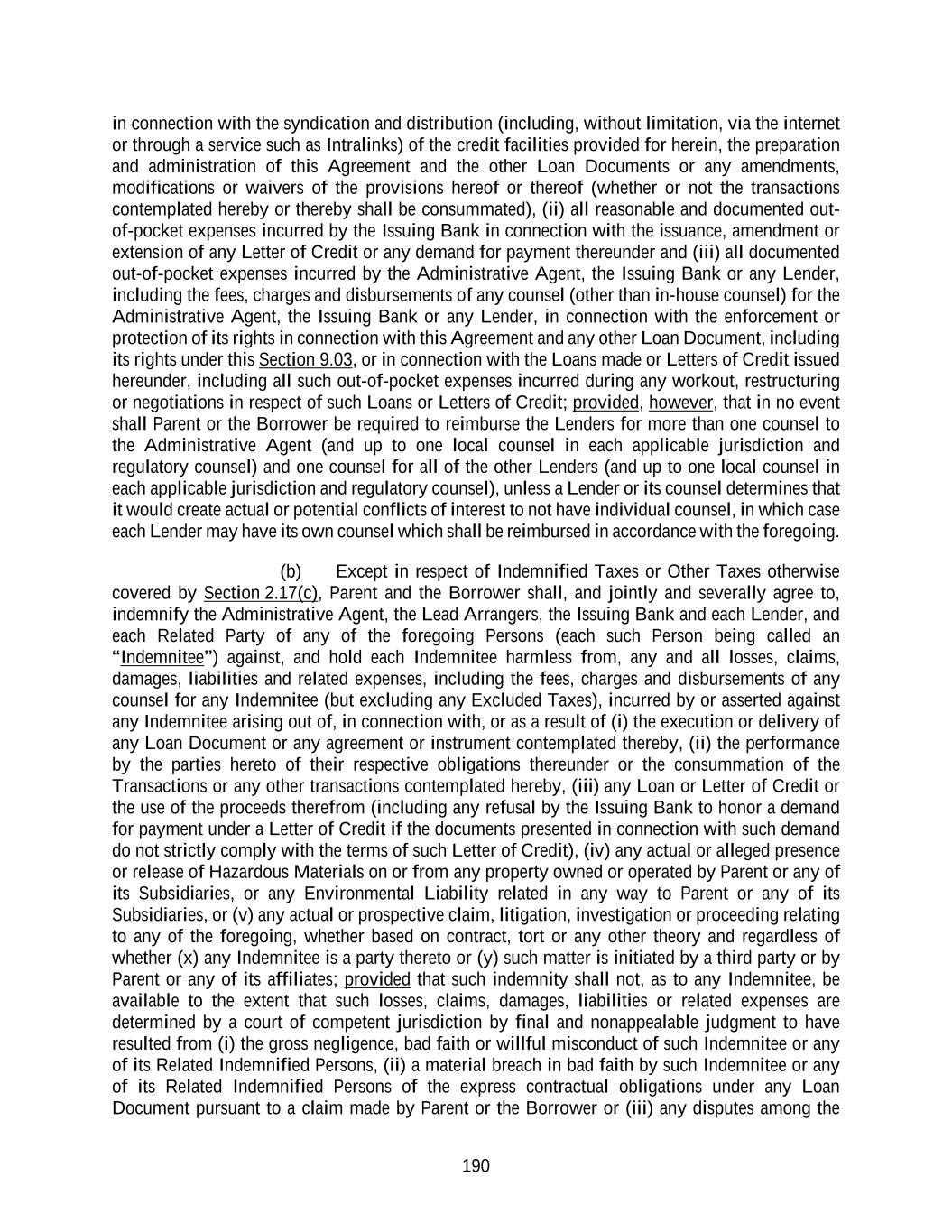 190 in connection with the syndication and distribution (including, without limitation, via the internet or through a service such as Intralinks) of the credit facilities provided for herein, the preparation and administration of this Agreement and the other Loan Documents or any amendments, modifications or waivers of the provisions hereof or thereof (whether or not the transactions contemplated hereby or thereby shall be consummated), (ii) all reasonable and documented out- of-pocket expenses incurred by the Issuing Bank in connection with the issuance, amendment or extension of any Letter of Credit or any demand for payment thereunder and (iii) all documented out-of-pocket expenses incurred by the Administrative Agent, the Issuing Bank or any Lender, including the fees, charges and disbursements of any counsel (other than in-house counsel) for the Administrative Agent, the Issuing Bank or any Lender, in connection with the enforcement or protection of its rights in connection with this Agreement and any other Loan Document, including its rights under this Section 9.03, or in connection with the Loans made or Letters of Credit issued hereunder, including all such out-of-pocket expenses incurred during any workout, restructuring or negotiations in respect of such Loans or Letters of Credit; provided, however, that in no event shall Parent or the Borrower be required to reimburse the Lenders for more than one counsel to the Administrative Agent (and up to one local counsel in each applicable jurisdiction and regulatory counsel) and one counsel for all of the other Lenders (and up to one local counsel in each applicable jurisdiction and regulatory counsel), unless a Lender or its counsel determines that it would create actual or potential conflicts of interest to not have individual counsel, in which case each Lender may have its own counsel which shall be reimbursed in accordance with the foregoing. (b) Except in respect of Indemnified Taxes or Other Taxes otherwise covered by Section 2.17(c), Parent and the Borrower shall, and jointly and severally agree to, indemnify the Administrative Agent, the Lead Arrangers, the Issuing Bank and each Lender, and each Related Party of any of the foregoing Persons (each such Person being called an “Indemnitee”) against, and hold each Indemnitee harmless from, any and all losses, claims, damages, liabilities and related expenses, including the fees, charges and disbursements of any counsel for any Indemnitee (but excluding any Excluded Taxes), incurred by or asserted against any Indemnitee arising out of, in connection with, or as a result of (i) the execution or delivery of any Loan Document or any agreement or instrument contemplated thereby, (ii) the performance by the parties hereto of their respective obligations thereunder or the consummation of the Transactions or any other transactions contemplated hereby, (iii) any Loan or Letter of Credit or the use of the proceeds therefrom (including any refusal by the Issuing Bank to honor a demand for payment under a Letter of Credit if the documents presented in connection with such demand do not strictly comply with the terms of such Letter of Credit), (iv) any actual or alleged presence or release of Hazardous Materials on or from any property owned or operated by Parent or any of its Subsidiaries, or any Environmental Liability related in any way to Parent or any of its Subsidiaries, or (v) any actual or prospective claim, litigation, investigation or proceeding relating to any of the foregoing, whether based on contract, tort or any other theory and regardless of whether (x) any Indemnitee is a party thereto or (y) such matter is initiated by a third party or by Parent or any of its affiliates; provided that such indemnity shall not, as to any Indemnitee, be available to the extent that such losses, claims, damages, liabilities or related expenses are determined by a court of competent jurisdiction by final and nonappealable judgment to have resulted from (i) the gross negligence, bad faith or willful misconduct of such Indemnitee or any of its Related Indemnified Persons, (ii) a material breach in bad faith by such Indemnitee or any of its Related Indemnified Persons of the express contractual obligations under any Loan Document pursuant to a claim made by Parent or the Borrower or (iii) any disputes among the