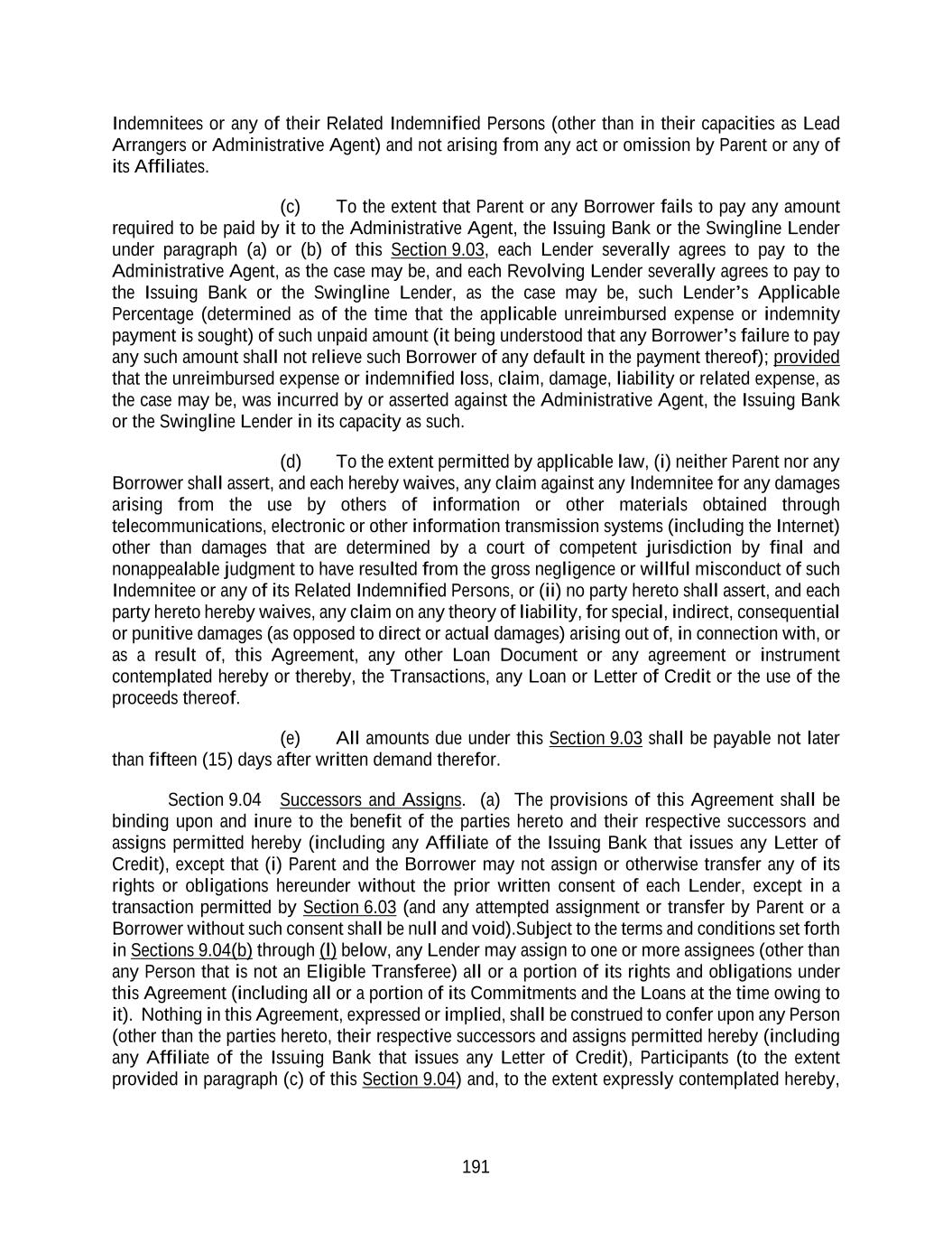 191 Indemnitees or any of their Related Indemnified Persons (other than in their capacities as Lead Arrangers or Administrative Agent) and not arising from any act or omission by Parent or any of its Affiliates. (c) To the extent that Parent or any Borrower fails to pay any amount required to be paid by it to the Administrative Agent, the Issuing Bank or the Swingline Lender under paragraph (a) or (b) of this Section 9.03, each Lender severally agrees to pay to the Administrative Agent, as the case may be, and each Revolving Lender severally agrees to pay to the Issuing Bank or the Swingline Lender, as the case may be, such Lender’s Applicable Percentage (determined as of the time that the applicable unreimbursed expense or indemnity payment is sought) of such unpaid amount (it being understood that any Borrower’s failure to pay any such amount shall not relieve such Borrower of any default in the payment thereof); provided that the unreimbursed expense or indemnified loss, claim, damage, liability or related expense, as the case may be, was incurred by or asserted against the Administrative Agent, the Issuing Bank or the Swingline Lender in its capacity as such. (d) To the extent permitted by applicable law, (i) neither Parent nor any Borrower shall assert, and each hereby waives, any claim against any Indemnitee for any damages arising from the use by others of information or other materials obtained through telecommunications, electronic or other information transmission systems (including the Internet) other than damages that are determined by a court of competent jurisdiction by final and nonappealable judgment to have resulted from the gross negligence or willful misconduct of such Indemnitee or any of its Related Indemnified Persons, or (ii) no party hereto shall assert, and each party hereto hereby waives, any claim on any theory of liability, for special, indirect, consequential or punitive damages (as opposed to direct or actual damages) arising out of, in connection with, or as a result of, this Agreement, any other Loan Document or any agreement or instrument contemplated hereby or thereby, the Transactions, any Loan or Letter of Credit or the use of the proceeds thereof. (e) All amounts due under this Section 9.03 shall be payable not later than fifteen (15) days after written demand therefor. Section 9.04 Successors and Assigns. (a) The provisions of this Agreement shall be binding upon and inure to the benefit of the parties hereto and their respective successors and assigns permitted hereby (including any Affiliate of the Issuing Bank that issues any Letter of Credit), except that (i) Parent and the Borrower may not assign or otherwise transfer any of its rights or obligations hereunder without the prior written consent of each Lender, except in a transaction permitted by Section 6.03 (and any attempted assignment or transfer by Parent or a Borrower without such consent shall be null and void).Subject to the terms and conditions set forth in Sections 9.04(b) through (l) below, any Lender may assign to one or more assignees (other than any Person that is not an Eligible Transferee) all or a portion of its rights and obligations under this Agreement (including all or a portion of its Commitments and the Loans at the time owing to it). Nothing in this Agreement, expressed or implied, shall be construed to confer upon any Person (other than the parties hereto, their respective successors and assigns permitted hereby (including any Affiliate of the Issuing Bank that issues any Letter of Credit), Participants (to the extent provided in paragraph (c) of this Section 9.04) and, to the extent expressly contemplated hereby,