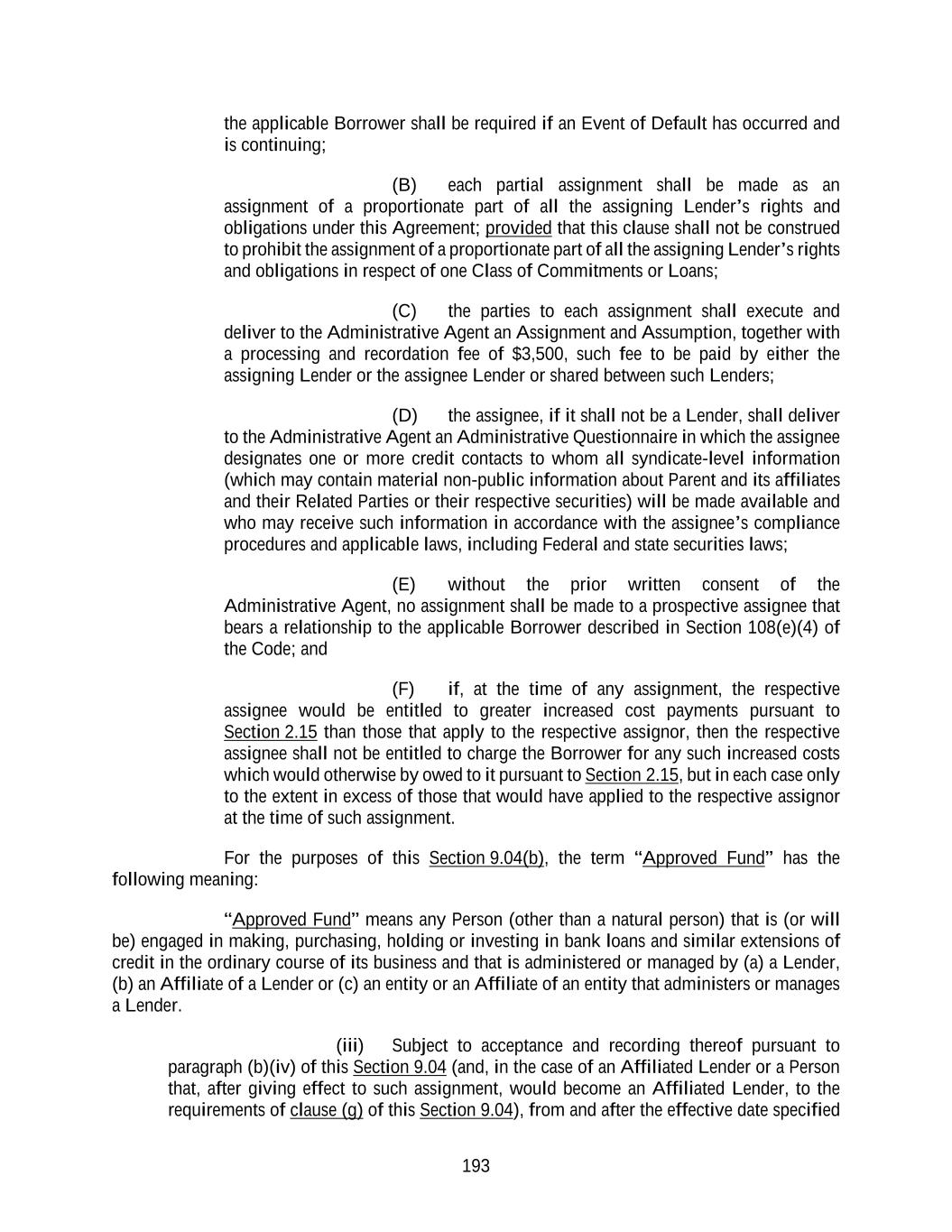 193 the applicable Borrower shall be required if an Event of Default has occurred and is continuing; (B) each partial assignment shall be made as an assignment of a proportionate part of all the assigning Lender’s rights and obligations under this Agreement; provided that this clause shall not be construed to prohibit the assignment of a proportionate part of all the assigning Lender’s rights and obligations in respect of one Class of Commitments or Loans; (C) the parties to each assignment shall execute and deliver to the Administrative Agent an Assignment and Assumption, together with a processing and recordation fee of $3,500, such fee to be paid by either the assigning Lender or the assignee Lender or shared between such Lenders; (D) the assignee, if it shall not be a Lender, shall deliver to the Administrative Agent an Administrative Questionnaire in which the assignee designates one or more credit contacts to whom all syndicate-level information (which may contain material non-public information about Parent and its affiliates and their Related Parties or their respective securities) will be made available and who may receive such information in accordance with the assignee’s compliance procedures and applicable laws, including Federal and state securities laws; (E) without the prior written consent of the Administrative Agent, no assignment shall be made to a prospective assignee that bears a relationship to the applicable Borrower described in Section 108(e)(4) of the Code; and (F) if, at the time of any assignment, the respective assignee would be entitled to greater increased cost payments pursuant to Section 2.15 than those that apply to the respective assignor, then the respective assignee shall not be entitled to charge the Borrower for any such increased costs which would otherwise by owed to it pursuant to Section 2.15, but in each case only to the extent in excess of those that would have applied to the respective assignor at the time of such assignment. For the purposes of this Section 9.04(b), the term “Approved Fund” has the following meaning: “Approved Fund” means any Person (other than a natural person) that is (or will be) engaged in making, purchasing, holding or investing in bank loans and similar extensions of credit in the ordinary course of its business and that is administered or managed by (a) a Lender, (b) an Affiliate of a Lender or (c) an entity or an Affiliate of an entity that administers or manages a Lender. (iii) Subject to acceptance and recording thereof pursuant to paragraph (b)(iv) of this Section 9.04 (and, in the case of an Affiliated Lender or a Person that, after giving effect to such assignment, would become an Affiliated Lender, to the requirements of clause (g) of this Section 9.04), from and after the effective date specified