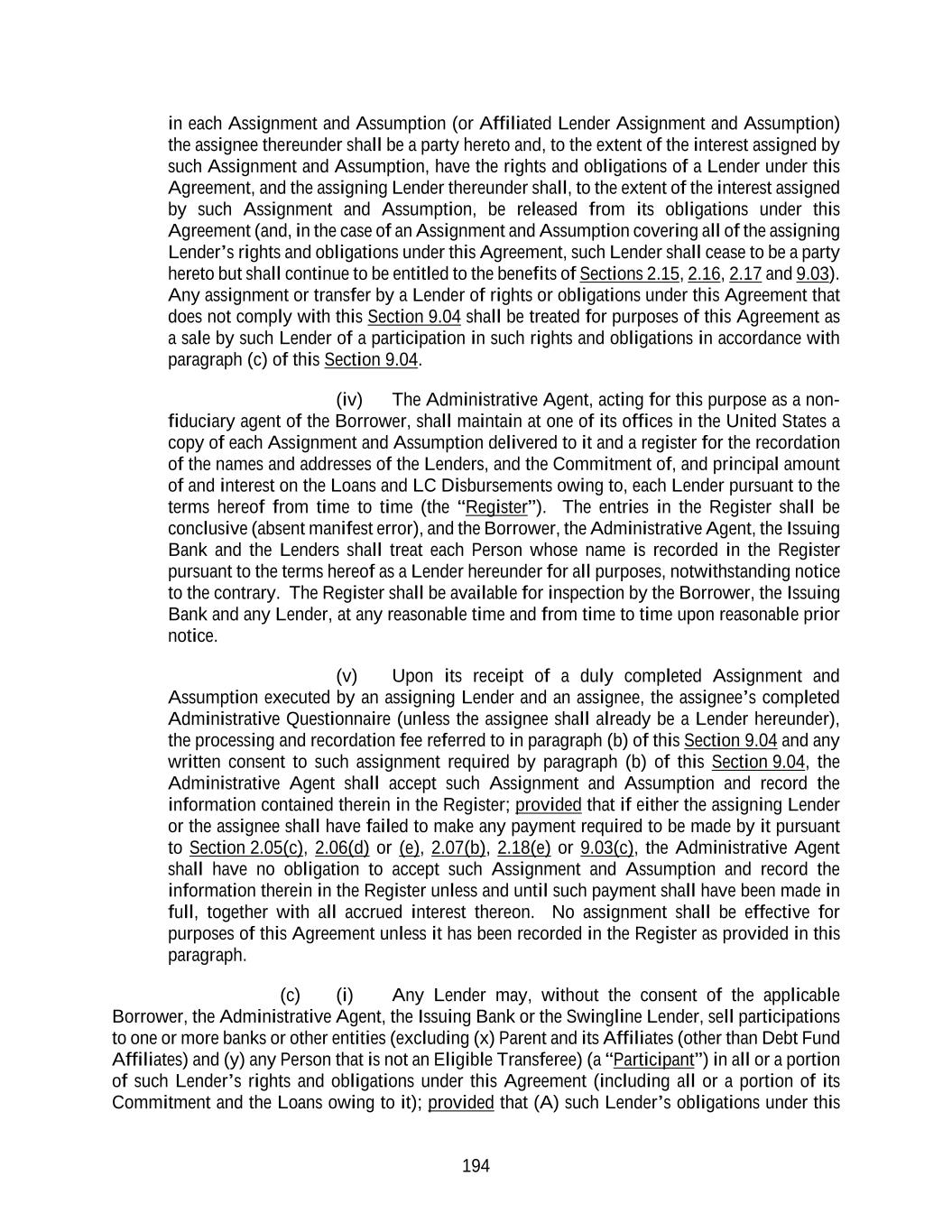 194 in each Assignment and Assumption (or Affiliated Lender Assignment and Assumption) the assignee thereunder shall be a party hereto and, to the extent of the interest assigned by such Assignment and Assumption, have the rights and obligations of a Lender under this Agreement, and the assigning Lender thereunder shall, to the extent of the interest assigned by such Assignment and Assumption, be released from its obligations under this Agreement (and, in the case of an Assignment and Assumption covering all of the assigning Lender’s rights and obligations under this Agreement, such Lender shall cease to be a party hereto but shall continue to be entitled to the benefits of Sections 2.15, 2.16, 2.17 and 9.03). Any assignment or transfer by a Lender of rights or obligations under this Agreement that does not comply with this Section 9.04 shall be treated for purposes of this Agreement as a sale by such Lender of a participation in such rights and obligations in accordance with paragraph (c) of this Section 9.04. (iv) The Administrative Agent, acting for this purpose as a non- fiduciary agent of the Borrower, shall maintain at one of its offices in the United States a copy of each Assignment and Assumption delivered to it and a register for the recordation of the names and addresses of the Lenders, and the Commitment of, and principal amount of and interest on the Loans and LC Disbursements owing to, each Lender pursuant to the terms hereof from time to time (the “Register”). The entries in the Register shall be conclusive (absent manifest error), and the Borrower, the Administrative Agent, the Issuing Bank and the Lenders shall treat each Person whose name is recorded in the Register pursuant to the terms hereof as a Lender hereunder for all purposes, notwithstanding notice to the contrary. The Register shall be available for inspection by the Borrower, the Issuing Bank and any Lender, at any reasonable time and from time to time upon reasonable prior notice. (v) Upon its receipt of a duly completed Assignment and Assumption executed by an assigning Lender and an assignee, the assignee’s completed Administrative Questionnaire (unless the assignee shall already be a Lender hereunder), the processing and recordation fee referred to in paragraph (b) of this Section 9.04 and any written consent to such assignment required by paragraph (b) of this Section 9.04, the Administrative Agent shall accept such Assignment and Assumption and record the information contained therein in the Register; provided that if either the assigning Lender or the assignee shall have failed to make any payment required to be made by it pursuant to Section 2.05(c), 2.06(d) or (e), 2.07(b), 2.18(e) or 9.03(c), the Administrative Agent shall have no obligation to accept such Assignment and Assumption and record the information therein in the Register unless and until such payment shall have been made in full, together with all accrued interest thereon. No assignment shall be effective for purposes of this Agreement unless it has been recorded in the Register as provided in this paragraph. (c) (i) Any Lender may, without the consent of the applicable Borrower, the Administrative Agent, the Issuing Bank or the Swingline Lender, sell participations to one or more banks or other entities (excluding (x) Parent and its Affiliates (other than Debt Fund Affiliates) and (y) any Person that is not an Eligible Transferee) (a “Participant”) in all or a portion of such Lender’s rights and obligations under this Agreement (including all or a portion of its Commitment and the Loans owing to it); provided that (A) such Lender’s obligations under this