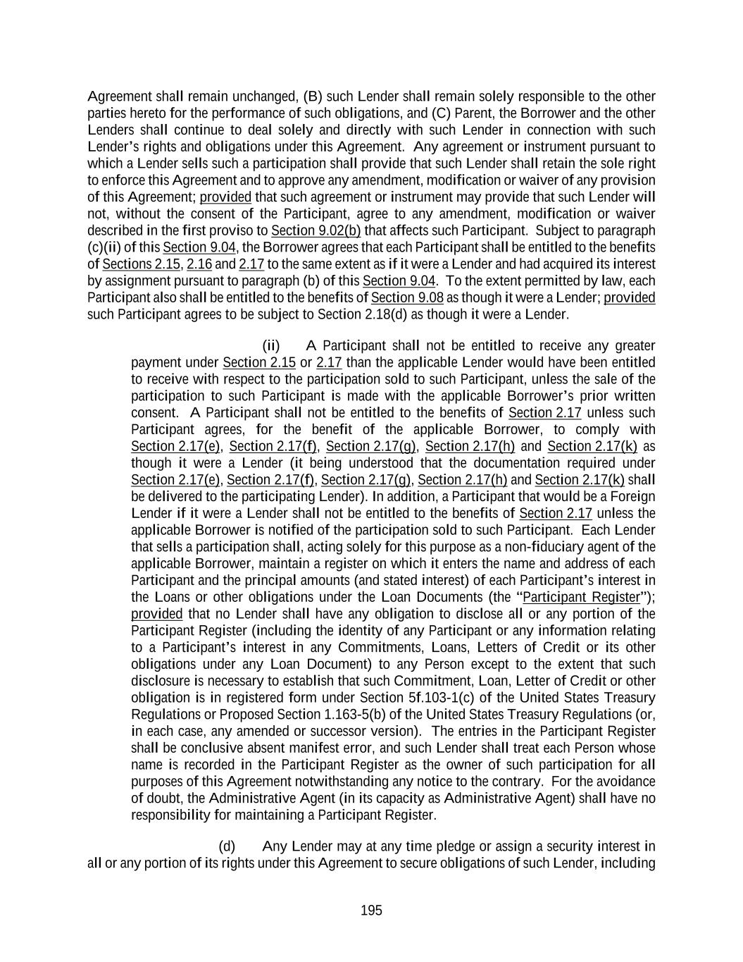 195 Agreement shall remain unchanged, (B) such Lender shall remain solely responsible to the other parties hereto for the performance of such obligations, and (C) Parent, the Borrower and the other Lenders shall continue to deal solely and directly with such Lender in connection with such Lender’s rights and obligations under this Agreement. Any agreement or instrument pursuant to which a Lender sells such a participation shall provide that such Lender shall retain the sole right to enforce this Agreement and to approve any amendment, modification or waiver of any provision of this Agreement; provided that such agreement or instrument may provide that such Lender will not, without the consent of the Participant, agree to any amendment, modification or waiver described in the first proviso to Section 9.02(b) that affects such Participant. Subject to paragraph (c)(ii) of this Section 9.04, the Borrower agrees that each Participant shall be entitled to the benefits of Sections 2.15, 2.16 and 2.17 to the same extent as if it were a Lender and had acquired its interest by assignment pursuant to paragraph (b) of this Section 9.04. To the extent permitted by law, each Participant also shall be entitled to the benefits of Section 9.08 as though it were a Lender; provided such Participant agrees to be subject to Section 2.18(d) as though it were a Lender. (ii) A Participant shall not be entitled to receive any greater payment under Section 2.15 or 2.17 than the applicable Lender would have been entitled to receive with respect to the participation sold to such Participant, unless the sale of the participation to such Participant is made with the applicable Borrower’s prior written consent. A Participant shall not be entitled to the benefits of Section 2.17 unless such Participant agrees, for the benefit of the applicable Borrower, to comply with Section 2.17(e), Section 2.17(f), Section 2.17(g), Section 2.17(h) and Section 2.17(k) as though it were a Lender (it being understood that the documentation required under Section 2.17(e), Section 2.17(f), Section 2.17(g), Section 2.17(h) and Section 2.17(k) shall be delivered to the participating Lender). In addition, a Participant that would be a Foreign Lender if it were a Lender shall not be entitled to the benefits of Section 2.17 unless the applicable Borrower is notified of the participation sold to such Participant. Each Lender that sells a participation shall, acting solely for this purpose as a non-fiduciary agent of the applicable Borrower, maintain a register on which it enters the name and address of each Participant and the principal amounts (and stated interest) of each Participant’s interest in the Loans or other obligations under the Loan Documents (the “Participant Register”); provided that no Lender shall have any obligation to disclose all or any portion of the Participant Register (including the identity of any Participant or any information relating to a Participant’s interest in any Commitments, Loans, Letters of Credit or its other obligations under any Loan Document) to any Person except to the extent that such disclosure is necessary to establish that such Commitment, Loan, Letter of Credit or other obligation is in registered form under Section 5f.103-1(c) of the United States Treasury Regulations or Proposed Section 1.163-5(b) of the United States Treasury Regulations (or, in each case, any amended or successor version). The entries in the Participant Register shall be conclusive absent manifest error, and such Lender shall treat each Person whose name is recorded in the Participant Register as the owner of such participation for all purposes of this Agreement notwithstanding any notice to the contrary. For the avoidance of doubt, the Administrative Agent (in its capacity as Administrative Agent) shall have no responsibility for maintaining a Participant Register. (d) Any Lender may at any time pledge or assign a security interest in all or any portion of its rights under this Agreement to secure obligations of such Lender, including