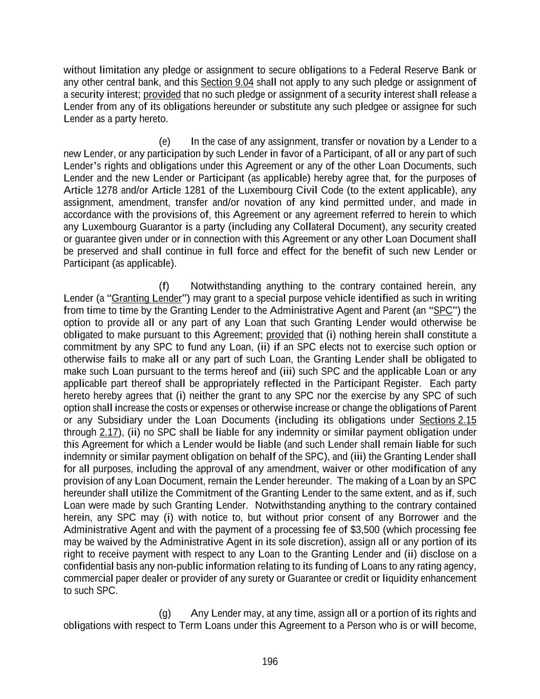 196 without limitation any pledge or assignment to secure obligations to a Federal Reserve Bank or any other central bank, and this Section 9.04 shall not apply to any such pledge or assignment of a security interest; provided that no such pledge or assignment of a security interest shall release a Lender from any of its obligations hereunder or substitute any such pledgee or assignee for such Lender as a party hereto. (e) In the case of any assignment, transfer or novation by a Lender to a new Lender, or any participation by such Lender in favor of a Participant, of all or any part of such Lender’s rights and obligations under this Agreement or any of the other Loan Documents, such Lender and the new Lender or Participant (as applicable) hereby agree that, for the purposes of Article 1278 and/or Article 1281 of the Luxembourg Civil Code (to the extent applicable), any assignment, amendment, transfer and/or novation of any kind permitted under, and made in accordance with the provisions of, this Agreement or any agreement referred to herein to which any Luxembourg Guarantor is a party (including any Collateral Document), any security created or guarantee given under or in connection with this Agreement or any other Loan Document shall be preserved and shall continue in full force and effect for the benefit of such new Lender or Participant (as applicable). (f) Notwithstanding anything to the contrary contained herein, any Lender (a “Granting Lender”) may grant to a special purpose vehicle identified as such in writing from time to time by the Granting Lender to the Administrative Agent and Parent (an “SPC”) the option to provide all or any part of any Loan that such Granting Lender would otherwise be obligated to make pursuant to this Agreement; provided that (i) nothing herein shall constitute a commitment by any SPC to fund any Loan, (ii) if an SPC elects not to exercise such option or otherwise fails to make all or any part of such Loan, the Granting Lender shall be obligated to make such Loan pursuant to the terms hereof and (iii) such SPC and the applicable Loan or any applicable part thereof shall be appropriately reflected in the Participant Register. Each party hereto hereby agrees that (i) neither the grant to any SPC nor the exercise by any SPC of such option shall increase the costs or expenses or otherwise increase or change the obligations of Parent or any Subsidiary under the Loan Documents (including its obligations under Sections 2.15 through 2.17), (ii) no SPC shall be liable for any indemnity or similar payment obligation under this Agreement for which a Lender would be liable (and such Lender shall remain liable for such indemnity or similar payment obligation on behalf of the SPC), and (iii) the Granting Lender shall for all purposes, including the approval of any amendment, waiver or other modification of any provision of any Loan Document, remain the Lender hereunder. The making of a Loan by an SPC hereunder shall utilize the Commitment of the Granting Lender to the same extent, and as if, such Loan were made by such Granting Lender. Notwithstanding anything to the contrary contained herein, any SPC may (i) with notice to, but without prior consent of any Borrower and the Administrative Agent and with the payment of a processing fee of $3,500 (which processing fee may be waived by the Administrative Agent in its sole discretion), assign all or any portion of its right to receive payment with respect to any Loan to the Granting Lender and (ii) disclose on a confidential basis any non-public information relating to its funding of Loans to any rating agency, commercial paper dealer or provider of any surety or Guarantee or credit or liquidity enhancement to such SPC. (g) Any Lender may, at any time, assign all or a portion of its rights and obligations with respect to Term Loans under this Agreement to a Person who is or will become,