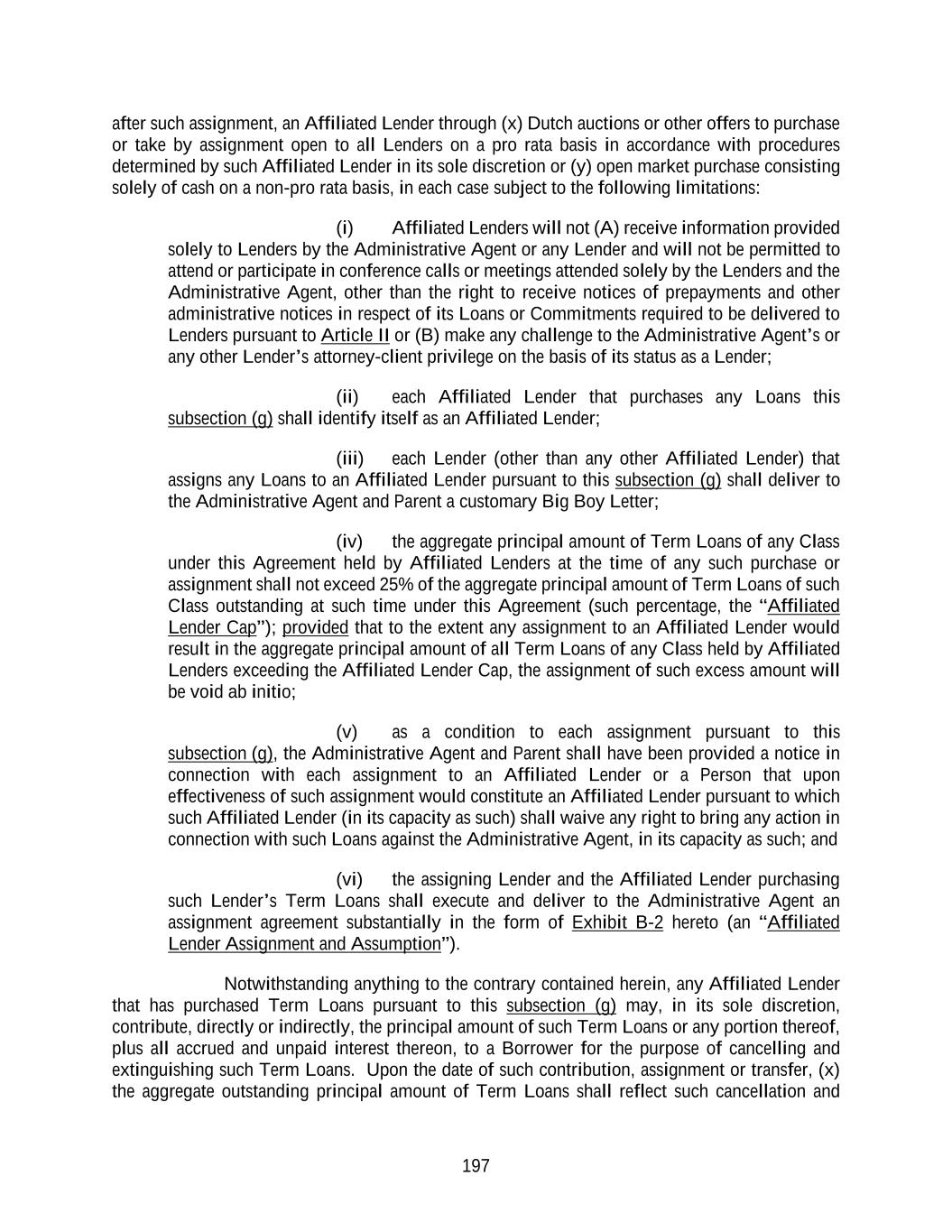197 after such assignment, an Affiliated Lender through (x) Dutch auctions or other offers to purchase or take by assignment open to all Lenders on a pro rata basis in accordance with procedures determined by such Affiliated Lender in its sole discretion or (y) open market purchase consisting solely of cash on a non-pro rata basis, in each case subject to the following limitations: (i) Affiliated Lenders will not (A) receive information provided solely to Lenders by the Administrative Agent or any Lender and will not be permitted to attend or participate in conference calls or meetings attended solely by the Lenders and the Administrative Agent, other than the right to receive notices of prepayments and other administrative notices in respect of its Loans or Commitments required to be delivered to Lenders pursuant to Article II or (B) make any challenge to the Administrative Agent’s or any other Lender’s attorney-client privilege on the basis of its status as a Lender; (ii) each Affiliated Lender that purchases any Loans this subsection (g) shall identify itself as an Affiliated Lender; (iii) each Lender (other than any other Affiliated Lender) that assigns any Loans to an Affiliated Lender pursuant to this subsection (g) shall deliver to the Administrative Agent and Parent a customary Big Boy Letter; (iv) the aggregate principal amount of Term Loans of any Class under this Agreement held by Affiliated Lenders at the time of any such purchase or assignment shall not exceed 25% of the aggregate principal amount of Term Loans of such Class outstanding at such time under this Agreement (such percentage, the “Affiliated Lender Cap”); provided that to the extent any assignment to an Affiliated Lender would result in the aggregate principal amount of all Term Loans of any Class held by Affiliated Lenders exceeding the Affiliated Lender Cap, the assignment of such excess amount will be void ab initio; (v) as a condition to each assignment pursuant to this subsection (g), the Administrative Agent and Parent shall have been provided a notice in connection with each assignment to an Affiliated Lender or a Person that upon effectiveness of such assignment would constitute an Affiliated Lender pursuant to which such Affiliated Lender (in its capacity as such) shall waive any right to bring any action in connection with such Loans against the Administrative Agent, in its capacity as such; and (vi) the assigning Lender and the Affiliated Lender purchasing such Lender’s Term Loans shall execute and deliver to the Administrative Agent an assignment agreement substantially in the form of Exhibit B-2 hereto (an “Affiliated Lender Assignment and Assumption”). Notwithstanding anything to the contrary contained herein, any Affiliated Lender that has purchased Term Loans pursuant to this subsection (g) may, in its sole discretion, contribute, directly or indirectly, the principal amount of such Term Loans or any portion thereof, plus all accrued and unpaid interest thereon, to a Borrower for the purpose of cancelling and extinguishing such Term Loans. Upon the date of such contribution, assignment or transfer, (x) the aggregate outstanding principal amount of Term Loans shall reflect such cancellation and