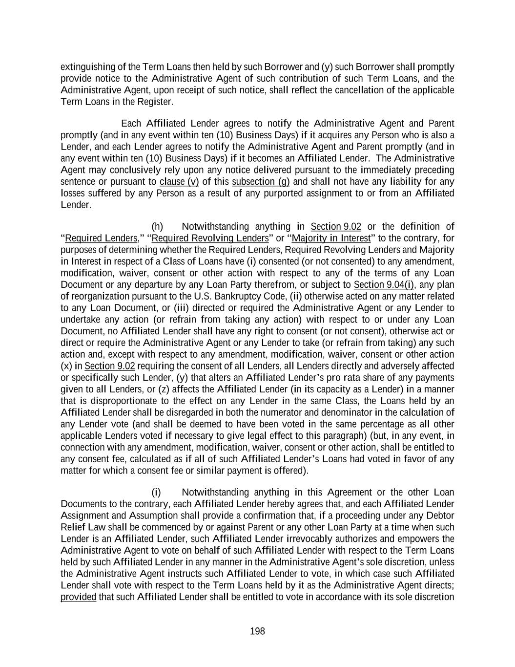 198 extinguishing of the Term Loans then held by such Borrower and (y) such Borrower shall promptly provide notice to the Administrative Agent of such contribution of such Term Loans, and the Administrative Agent, upon receipt of such notice, shall reflect the cancellation of the applicable Term Loans in the Register. Each Affiliated Lender agrees to notify the Administrative Agent and Parent promptly (and in any event within ten (10) Business Days) if it acquires any Person who is also a Lender, and each Lender agrees to notify the Administrative Agent and Parent promptly (and in any event within ten (10) Business Days) if it becomes an Affiliated Lender. The Administrative Agent may conclusively rely upon any notice delivered pursuant to the immediately preceding sentence or pursuant to clause (v) of this subsection (g) and shall not have any liability for any losses suffered by any Person as a result of any purported assignment to or from an Affiliated Lender. (h) Notwithstanding anything in Section 9.02 or the definition of “Required Lenders,” “Required Revolving Lenders” or “Majority in Interest” to the contrary, for purposes of determining whether the Required Lenders, Required Revolving Lenders and Majority in Interest in respect of a Class of Loans have (i) consented (or not consented) to any amendment, modification, waiver, consent or other action with respect to any of the terms of any Loan Document or any departure by any Loan Party therefrom, or subject to Section 9.04(i), any plan of reorganization pursuant to the U.S. Bankruptcy Code, (ii) otherwise acted on any matter related to any Loan Document, or (iii) directed or required the Administrative Agent or any Lender to undertake any action (or refrain from taking any action) with respect to or under any Loan Document, no Affiliated Lender shall have any right to consent (or not consent), otherwise act or direct or require the Administrative Agent or any Lender to take (or refrain from taking) any such action and, except with respect to any amendment, modification, waiver, consent or other action (x) in Section 9.02 requiring the consent of all Lenders, all Lenders directly and adversely affected or specifically such Lender, (y) that alters an Affiliated Lender’s pro rata share of any payments given to all Lenders, or (z) affects the Affiliated Lender (in its capacity as a Lender) in a manner that is disproportionate to the effect on any Lender in the same Class, the Loans held by an Affiliated Lender shall be disregarded in both the numerator and denominator in the calculation of any Lender vote (and shall be deemed to have been voted in the same percentage as all other applicable Lenders voted if necessary to give legal effect to this paragraph) (but, in any event, in connection with any amendment, modification, waiver, consent or other action, shall be entitled to any consent fee, calculated as if all of such Affiliated Lender’s Loans had voted in favor of any matter for which a consent fee or similar payment is offered). (i) Notwithstanding anything in this Agreement or the other Loan Documents to the contrary, each Affiliated Lender hereby agrees that, and each Affiliated Lender Assignment and Assumption shall provide a confirmation that, if a proceeding under any Debtor Relief Law shall be commenced by or against Parent or any other Loan Party at a time when such Lender is an Affiliated Lender, such Affiliated Lender irrevocably authorizes and empowers the Administrative Agent to vote on behalf of such Affiliated Lender with respect to the Term Loans held by such Affiliated Lender in any manner in the Administrative Agent’s sole discretion, unless the Administrative Agent instructs such Affiliated Lender to vote, in which case such Affiliated Lender shall vote with respect to the Term Loans held by it as the Administrative Agent directs; provided that such Affiliated Lender shall be entitled to vote in accordance with its sole discretion
