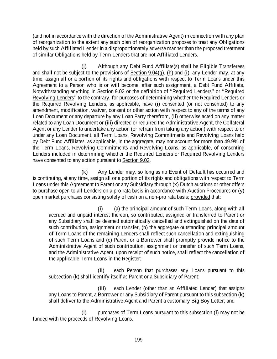 199 (and not in accordance with the direction of the Administrative Agent) in connection with any plan of reorganization to the extent any such plan of reorganization proposes to treat any Obligations held by such Affiliated Lender in a disproportionately adverse manner than the proposed treatment of similar Obligations held by Term Lenders that are not Affiliated Lenders. (j) Although any Debt Fund Affiliate(s) shall be Eligible Transferees and shall not be subject to the provisions of Section 9.04(g), (h) and (i), any Lender may, at any time, assign all or a portion of its rights and obligations with respect to Term Loans under this Agreement to a Person who is or will become, after such assignment, a Debt Fund Affiliate. Notwithstanding anything in Section 9.02 or the definition of “Required Lenders” or “Required Revolving Lenders” to the contrary, for purposes of determining whether the Required Lenders or the Required Revolving Lenders, as applicable, have (i) consented (or not consented) to any amendment, modification, waiver, consent or other action with respect to any of the terms of any Loan Document or any departure by any Loan Party therefrom, (ii) otherwise acted on any matter related to any Loan Document or (iii) directed or required the Administrative Agent, the Collateral Agent or any Lender to undertake any action (or refrain from taking any action) with respect to or under any Loan Document, all Term Loans, Revolving Commitments and Revolving Loans held by Debt Fund Affiliates, as applicable, in the aggregate, may not account for more than 49.9% of the Term Loans, Revolving Commitments and Revolving Loans, as applicable, of consenting Lenders included in determining whether the Required Lenders or Required Revolving Lenders have consented to any action pursuant to Section 9.02. (k) Any Lender may, so long as no Event of Default has occurred and is continuing, at any time, assign all or a portion of its rights and obligations with respect to Term Loans under this Agreement to Parent or any Subsidiary through (x) Dutch auctions or other offers to purchase open to all Lenders on a pro rata basis in accordance with Auction Procedures or (y) open market purchases consisting solely of cash on a non-pro rata basis; provided that: (i) (a) the principal amount of such Term Loans, along with all accrued and unpaid interest thereon, so contributed, assigned or transferred to Parent or any Subsidiary shall be deemed automatically cancelled and extinguished on the date of such contribution, assignment or transfer, (b) the aggregate outstanding principal amount of Term Loans of the remaining Lenders shall reflect such cancellation and extinguishing of such Term Loans and (c) Parent or a Borrower shall promptly provide notice to the Administrative Agent of such contribution, assignment or transfer of such Term Loans, and the Administrative Agent, upon receipt of such notice, shall reflect the cancellation of the applicable Term Loans in the Register; (ii) each Person that purchases any Loans pursuant to this subsection (k) shall identify itself as Parent or a Subsidiary of Parent; (iii) each Lender (other than an Affiliated Lender) that assigns any Loans to Parent, a Borrower or any Subsidiary of Parent pursuant to this subsection (k) shall deliver to the Administrative Agent and Parent a customary Big Boy Letter; and (l) purchases of Term Loans pursuant to this subsection (l) may not be funded with the proceeds of Revolving Loans.