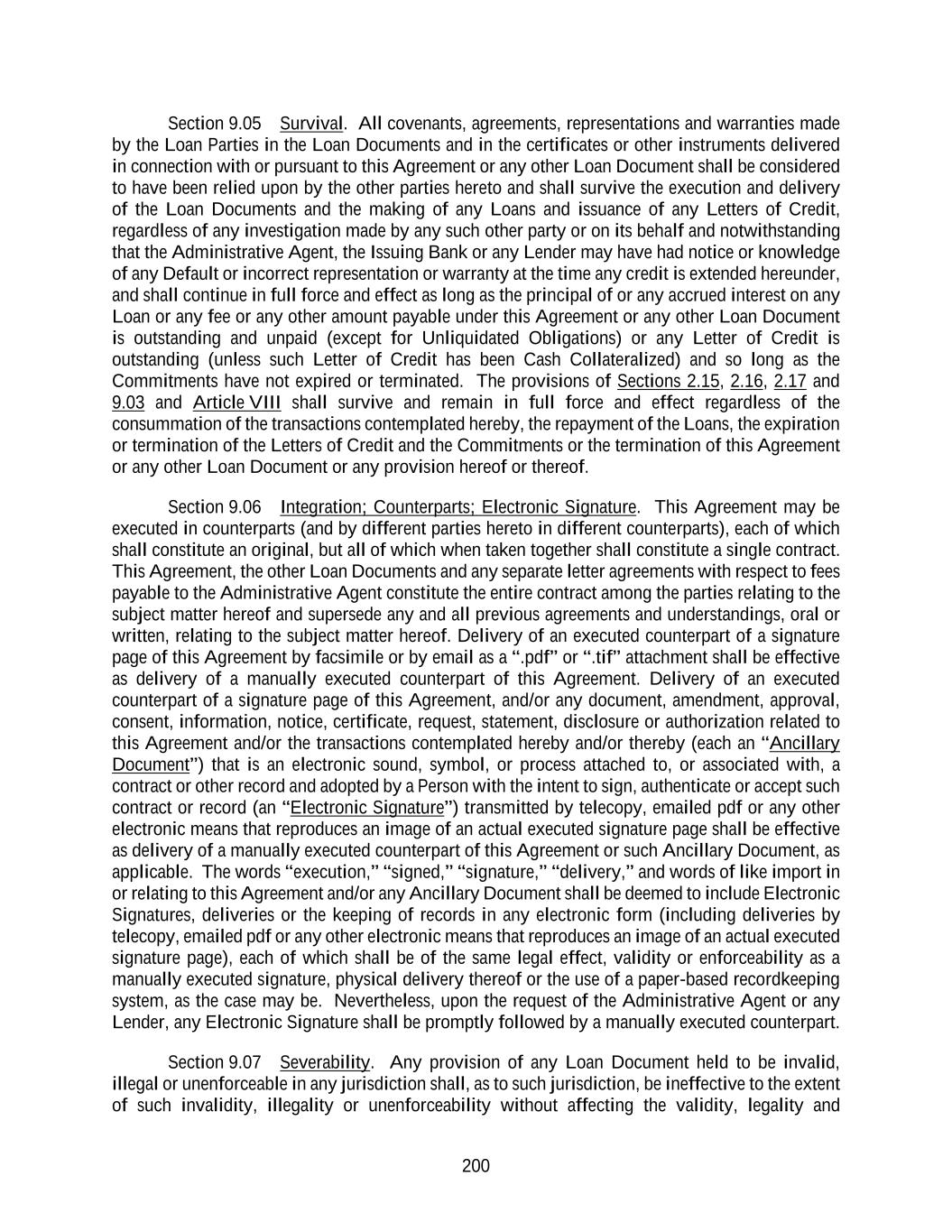 200 Section 9.05 Survival. All covenants, agreements, representations and warranties made by the Loan Parties in the Loan Documents and in the certificates or other instruments delivered in connection with or pursuant to this Agreement or any other Loan Document shall be considered to have been relied upon by the other parties hereto and shall survive the execution and delivery of the Loan Documents and the making of any Loans and issuance of any Letters of Credit, regardless of any investigation made by any such other party or on its behalf and notwithstanding that the Administrative Agent, the Issuing Bank or any Lender may have had notice or knowledge of any Default or incorrect representation or warranty at the time any credit is extended hereunder, and shall continue in full force and effect as long as the principal of or any accrued interest on any Loan or any fee or any other amount payable under this Agreement or any other Loan Document is outstanding and unpaid (except for Unliquidated Obligations) or any Letter of Credit is outstanding (unless such Letter of Credit has been Cash Collateralized) and so long as the Commitments have not expired or terminated. The provisions of Sections 2.15, 2.16, 2.17 and 9.03 and Article VIII shall survive and remain in full force and effect regardless of the consummation of the transactions contemplated hereby, the repayment of the Loans, the expiration or termination of the Letters of Credit and the Commitments or the termination of this Agreement or any other Loan Document or any provision hereof or thereof. Section 9.06 Integration; Counterparts; Electronic Signature. This Agreement may be executed in counterparts (and by different parties hereto in different counterparts), each of which shall constitute an original, but all of which when taken together shall constitute a single contract. This Agreement, the other Loan Documents and any separate letter agreements with respect to fees payable to the Administrative Agent constitute the entire contract among the parties relating to the subject matter hereof and supersede any and all previous agreements and understandings, oral or written, relating to the subject matter hereof. Delivery of an executed counterpart of a signature page of this Agreement by facsimile or by email as a “.pdf” or “.tif” attachment shall be effective as delivery of a manually executed counterpart of this Agreement. Delivery of an executed counterpart of a signature page of this Agreement, and/or any document, amendment, approval, consent, information, notice, certificate, request, statement, disclosure or authorization related to this Agreement and/or the transactions contemplated hereby and/or thereby (each an “Ancillary Document”) that is an electronic sound, symbol, or process attached to, or associated with, a contract or other record and adopted by a Person with the intent to sign, authenticate or accept such contract or record (an “Electronic Signature”) transmitted by telecopy, emailed pdf or any other electronic means that reproduces an image of an actual executed signature page shall be effective as delivery of a manually executed counterpart of this Agreement or such Ancillary Document, as applicable. The words “execution,” “signed,” “signature,” “delivery,” and words of like import in or relating to this Agreement and/or any Ancillary Document shall be deemed to include Electronic Signatures, deliveries or the keeping of records in any electronic form (including deliveries by telecopy, emailed pdf or any other electronic means that reproduces an image of an actual executed signature page), each of which shall be of the same legal effect, validity or enforceability as a manually executed signature, physical delivery thereof or the use of a paper-based recordkeeping system, as the case may be. Nevertheless, upon the request of the Administrative Agent or any Lender, any Electronic Signature shall be promptly followed by a manually executed counterpart. Section 9.07 Severability. Any provision of any Loan Document held to be invalid, illegal or unenforceable in any jurisdiction shall, as to such jurisdiction, be ineffective to the extent of such invalidity, illegality or unenforceability without affecting the validity, legality and
