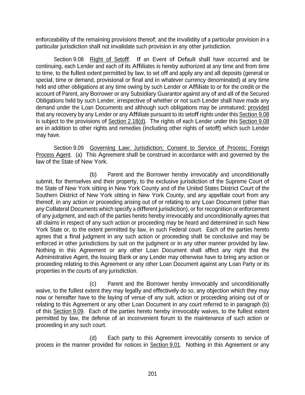 201 enforceability of the remaining provisions thereof; and the invalidity of a particular provision in a particular jurisdiction shall not invalidate such provision in any other jurisdiction. Section 9.08 Right of Setoff. If an Event of Default shall have occurred and be continuing, each Lender and each of its Affiliates is hereby authorized at any time and from time to time, to the fullest extent permitted by law, to set off and apply any and all deposits (general or special, time or demand, provisional or final and in whatever currency denominated) at any time held and other obligations at any time owing by such Lender or Affiliate to or for the credit or the account of Parent, any Borrower or any Subsidiary Guarantor against any of and all of the Secured Obligations held by such Lender, irrespective of whether or not such Lender shall have made any demand under the Loan Documents and although such obligations may be unmatured; provided that any recovery by any Lender or any Affiliate pursuant to its setoff rights under this Section 9.08 is subject to the provisions of Section 2.18(d). The rights of each Lender under this Section 9.08 are in addition to other rights and remedies (including other rights of setoff) which such Lender may have. Section 9.09 Governing Law; Jurisdiction; Consent to Service of Process; Foreign Process Agent. (a) This Agreement shall be construed in accordance with and governed by the law of the State of New York. (b) Parent and the Borrower hereby irrevocably and unconditionally submit, for themselves and their property, to the exclusive jurisdiction of the Supreme Court of the State of New York sitting in New York County and of the United States District Court of the Southern District of New York sitting in New York County, and any appellate court from any thereof, in any action or proceeding arising out of or relating to any Loan Document (other than any Collateral Documents which specify a different jurisdiction), or for recognition or enforcement of any judgment, and each of the parties hereto hereby irrevocably and unconditionally agrees that all claims in respect of any such action or proceeding may be heard and determined in such New York State or, to the extent permitted by law, in such Federal court. Each of the parties hereto agrees that a final judgment in any such action or proceeding shall be conclusive and may be enforced in other jurisdictions by suit on the judgment or in any other manner provided by law. Nothing in this Agreement or any other Loan Document shall affect any right that the Administrative Agent, the Issuing Bank or any Lender may otherwise have to bring any action or proceeding relating to this Agreement or any other Loan Document against any Loan Party or its properties in the courts of any jurisdiction. (c) Parent and the Borrower hereby irrevocably and unconditionally waive, to the fullest extent they may legally and effectively do so, any objection which they may now or hereafter have to the laying of venue of any suit, action or proceeding arising out of or relating to this Agreement or any other Loan Document in any court referred to in paragraph (b) of this Section 9.09. Each of the parties hereto hereby irrevocably waives, to the fullest extent permitted by law, the defense of an inconvenient forum to the maintenance of such action or proceeding in any such court. (d) Each party to this Agreement irrevocably consents to service of process in the manner provided for notices in Section 9.01. Nothing in this Agreement or any