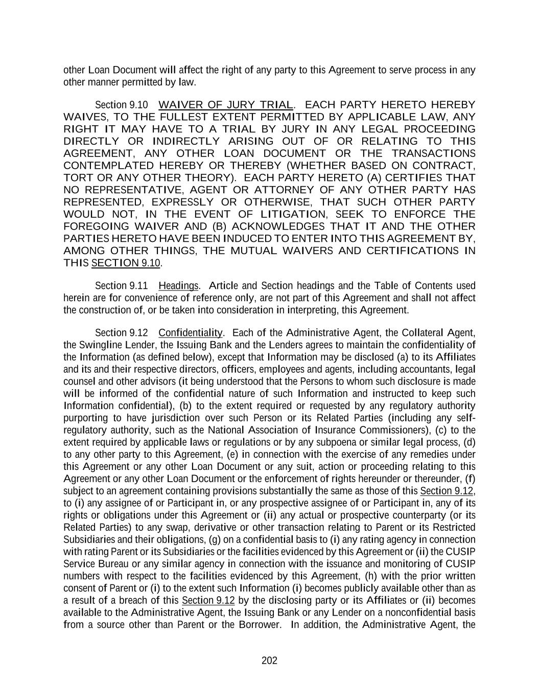 202 other Loan Document will affect the right of any party to this Agreement to serve process in any other manner permitted by law. Section 9.10 WAIVER OF JURY TRIAL. EACH PARTY HERETO HEREBY WAIVES, TO THE FULLEST EXTENT PERMITTED BY APPLICABLE LAW, ANY RIGHT IT MAY HAVE TO A TRIAL BY JURY IN ANY LEGAL PROCEEDING DIRECTLY OR INDIRECTLY ARISING OUT OF OR RELATING TO THIS AGREEMENT, ANY OTHER LOAN DOCUMENT OR THE TRANSACTIONS CONTEMPLATED HEREBY OR THEREBY (WHETHER BASED ON CONTRACT, TORT OR ANY OTHER THEORY). EACH PARTY HERETO (A) CERTIFIES THAT NO REPRESENTATIVE, AGENT OR ATTORNEY OF ANY OTHER PARTY HAS REPRESENTED, EXPRESSLY OR OTHERWISE, THAT SUCH OTHER PARTY WOULD NOT, IN THE EVENT OF LITIGATION, SEEK TO ENFORCE THE FOREGOING WAIVER AND (B) ACKNOWLEDGES THAT IT AND THE OTHER PARTIES HERETO HAVE BEEN INDUCED TO ENTER INTO THIS AGREEMENT BY, AMONG OTHER THINGS, THE MUTUAL WAIVERS AND CERTIFICATIONS IN THIS SECTION 9.10. Section 9.11 Headings. Article and Section headings and the Table of Contents used herein are for convenience of reference only, are not part of this Agreement and shall not affect the construction of, or be taken into consideration in interpreting, this Agreement. Section 9.12 Confidentiality. Each of the Administrative Agent, the Collateral Agent, the Swingline Lender, the Issuing Bank and the Lenders agrees to maintain the confidentiality of the Information (as defined below), except that Information may be disclosed (a) to its Affiliates and its and their respective directors, officers, employees and agents, including accountants, legal counsel and other advisors (it being understood that the Persons to whom such disclosure is made will be informed of the confidential nature of such Information and instructed to keep such Information confidential), (b) to the extent required or requested by any regulatory authority purporting to have jurisdiction over such Person or its Related Parties (including any self- regulatory authority, such as the National Association of Insurance Commissioners), (c) to the extent required by applicable laws or regulations or by any subpoena or similar legal process, (d) to any other party to this Agreement, (e) in connection with the exercise of any remedies under this Agreement or any other Loan Document or any suit, action or proceeding relating to this Agreement or any other Loan Document or the enforcement of rights hereunder or thereunder, (f) subject to an agreement containing provisions substantially the same as those of this Section 9.12, to (i) any assignee of or Participant in, or any prospective assignee of or Participant in, any of its rights or obligations under this Agreement or (ii) any actual or prospective counterparty (or its Related Parties) to any swap, derivative or other transaction relating to Parent or its Restricted Subsidiaries and their obligations, (g) on a confidential basis to (i) any rating agency in connection with rating Parent or its Subsidiaries or the facilities evidenced by this Agreement or (ii) the CUSIP Service Bureau or any similar agency in connection with the issuance and monitoring of CUSIP numbers with respect to the facilities evidenced by this Agreement, (h) with the prior written consent of Parent or (i) to the extent such Information (i) becomes publicly available other than as a result of a breach of this Section 9.12 by the disclosing party or its Affiliates or (ii) becomes available to the Administrative Agent, the Issuing Bank or any Lender on a nonconfidential basis from a source other than Parent or the Borrower. In addition, the Administrative Agent, the