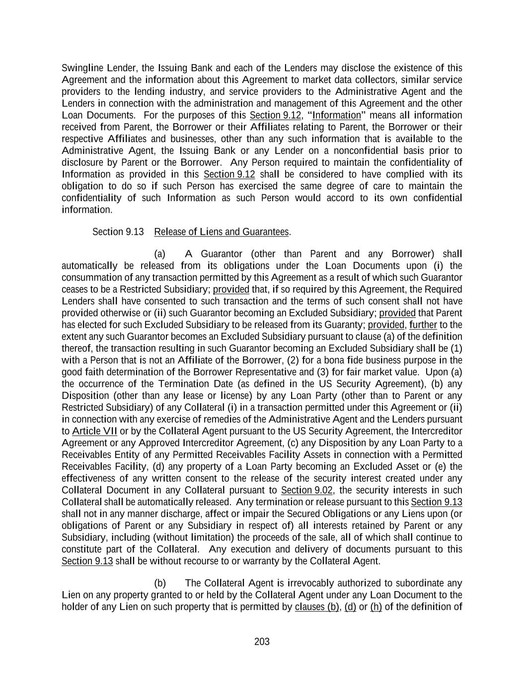 203 Swingline Lender, the Issuing Bank and each of the Lenders may disclose the existence of this Agreement and the information about this Agreement to market data collectors, similar service providers to the lending industry, and service providers to the Administrative Agent and the Lenders in connection with the administration and management of this Agreement and the other Loan Documents. For the purposes of this Section 9.12, “Information” means all information received from Parent, the Borrower or their Affiliates relating to Parent, the Borrower or their respective Affiliates and businesses, other than any such information that is available to the Administrative Agent, the Issuing Bank or any Lender on a nonconfidential basis prior to disclosure by Parent or the Borrower. Any Person required to maintain the confidentiality of Information as provided in this Section 9.12 shall be considered to have complied with its obligation to do so if such Person has exercised the same degree of care to maintain the confidentiality of such Information as such Person would accord to its own confidential information. Section 9.13 Release of Liens and Guarantees. (a) A Guarantor (other than Parent and any Borrower) shall automatically be released from its obligations under the Loan Documents upon (i) the consummation of any transaction permitted by this Agreement as a result of which such Guarantor ceases to be a Restricted Subsidiary; provided that, if so required by this Agreement, the Required Lenders shall have consented to such transaction and the terms of such consent shall not have provided otherwise or (ii) such Guarantor becoming an Excluded Subsidiary; provided that Parent has elected for such Excluded Subsidiary to be released from its Guaranty; provided, further to the extent any such Guarantor becomes an Excluded Subsidiary pursuant to clause (a) of the definition thereof, the transaction resulting in such Guarantor becoming an Excluded Subsidiary shall be (1) with a Person that is not an Affiliate of the Borrower, (2) for a bona fide business purpose in the good faith determination of the Borrower Representative and (3) for fair market value. Upon (a) the occurrence of the Termination Date (as defined in the US Security Agreement), (b) any Disposition (other than any lease or license) by any Loan Party (other than to Parent or any Restricted Subsidiary) of any Collateral (i) in a transaction permitted under this Agreement or (ii) in connection with any exercise of remedies of the Administrative Agent and the Lenders pursuant to Article VII or by the Collateral Agent pursuant to the US Security Agreement, the Intercreditor Agreement or any Approved Intercreditor Agreement, (c) any Disposition by any Loan Party to a Receivables Entity of any Permitted Receivables Facility Assets in connection with a Permitted Receivables Facility, (d) any property of a Loan Party becoming an Excluded Asset or (e) the effectiveness of any written consent to the release of the security interest created under any Collateral Document in any Collateral pursuant to Section 9.02, the security interests in such Collateral shall be automatically released. Any termination or release pursuant to this Section 9.13 shall not in any manner discharge, affect or impair the Secured Obligations or any Liens upon (or obligations of Parent or any Subsidiary in respect of) all interests retained by Parent or any Subsidiary, including (without limitation) the proceeds of the sale, all of which shall continue to constitute part of the Collateral. Any execution and delivery of documents pursuant to this Section 9.13 shall be without recourse to or warranty by the Collateral Agent. (b) The Collateral Agent is irrevocably authorized to subordinate any Lien on any property granted to or held by the Collateral Agent under any Loan Document to the holder of any Lien on such property that is permitted by clauses (b), (d) or (h) of the definition of
