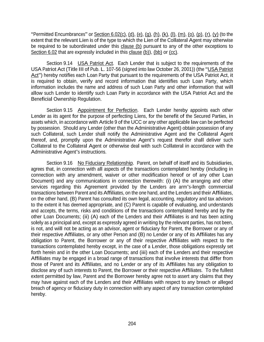 204 “Permitted Encumbrances” or Section 6.02(c), (d), (e), (g), (h), (k), (l), (m), (o), (p), (r), (y) (to the extent that the relevant Lien is of the type to which the Lien of the Collateral Agent may otherwise be required to be subordinated under this clause (b) pursuant to any of the other exceptions to Section 6.02 that are expressly included in this clause (b)), (bb) or (cc). Section 9.14 USA Patriot Act. Each Lender that is subject to the requirements of the USA Patriot Act (Title III of Pub. L. 107-56 (signed into law October 26, 2001)) (the “USA Patriot Act”) hereby notifies each Loan Party that pursuant to the requirements of the USA Patriot Act, it is required to obtain, verify and record information that identifies such Loan Party, which information includes the name and address of such Loan Party and other information that will allow such Lender to identify such Loan Party in accordance with the USA Patriot Act and the Beneficial Ownership Regulation. Section 9.15 Appointment for Perfection. Each Lender hereby appoints each other Lender as its agent for the purpose of perfecting Liens, for the benefit of the Secured Parties, in assets which, in accordance with Article 9 of the UCC or any other applicable law can be perfected by possession. Should any Lender (other than the Administrative Agent) obtain possession of any such Collateral, such Lender shall notify the Administrative Agent and the Collateral Agent thereof, and, promptly upon the Administrative Agent’s request therefor shall deliver such Collateral to the Collateral Agent or otherwise deal with such Collateral in accordance with the Administrative Agent’s instructions. Section 9.16 No Fiduciary Relationship. Parent, on behalf of itself and its Subsidiaries, agrees that, in connection with all aspects of the transactions contemplated hereby (including in connection with any amendment, waiver or other modification hereof or of any other Loan Document) and any communications in connection therewith: (i) (A) the arranging and other services regarding this Agreement provided by the Lenders are arm’s-length commercial transactions between Parent and its Affiliates, on the one hand, and the Lenders and their Affiliates, on the other hand, (B) Parent has consulted its own legal, accounting, regulatory and tax advisors to the extent it has deemed appropriate, and (C) Parent is capable of evaluating, and understands and accepts, the terms, risks and conditions of the transactions contemplated hereby and by the other Loan Documents; (ii) (A) each of the Lenders and their Affiliates is and has been acting solely as a principal and, except as expressly agreed in writing by the relevant parties, has not been, is not, and will not be acting as an advisor, agent or fiduciary for Parent, the Borrower or any of their respective Affiliates, or any other Person and (B) no Lender or any of its Affiliates has any obligation to Parent, the Borrower or any of their respective Affiliates with respect to the transactions contemplated hereby except, in the case of a Lender, those obligations expressly set forth herein and in the other Loan Documents; and (iii) each of the Lenders and their respective Affiliates may be engaged in a broad range of transactions that involve interests that differ from those of Parent and its Affiliates, and no Lender or any of its Affiliates has any obligation to disclose any of such interests to Parent, the Borrower or their respective Affiliates. To the fullest extent permitted by law, Parent and the Borrower hereby agree not to assert any claims that they may have against each of the Lenders and their Affiliates with respect to any breach or alleged breach of agency or fiduciary duty in connection with any aspect of any transaction contemplated hereby.
