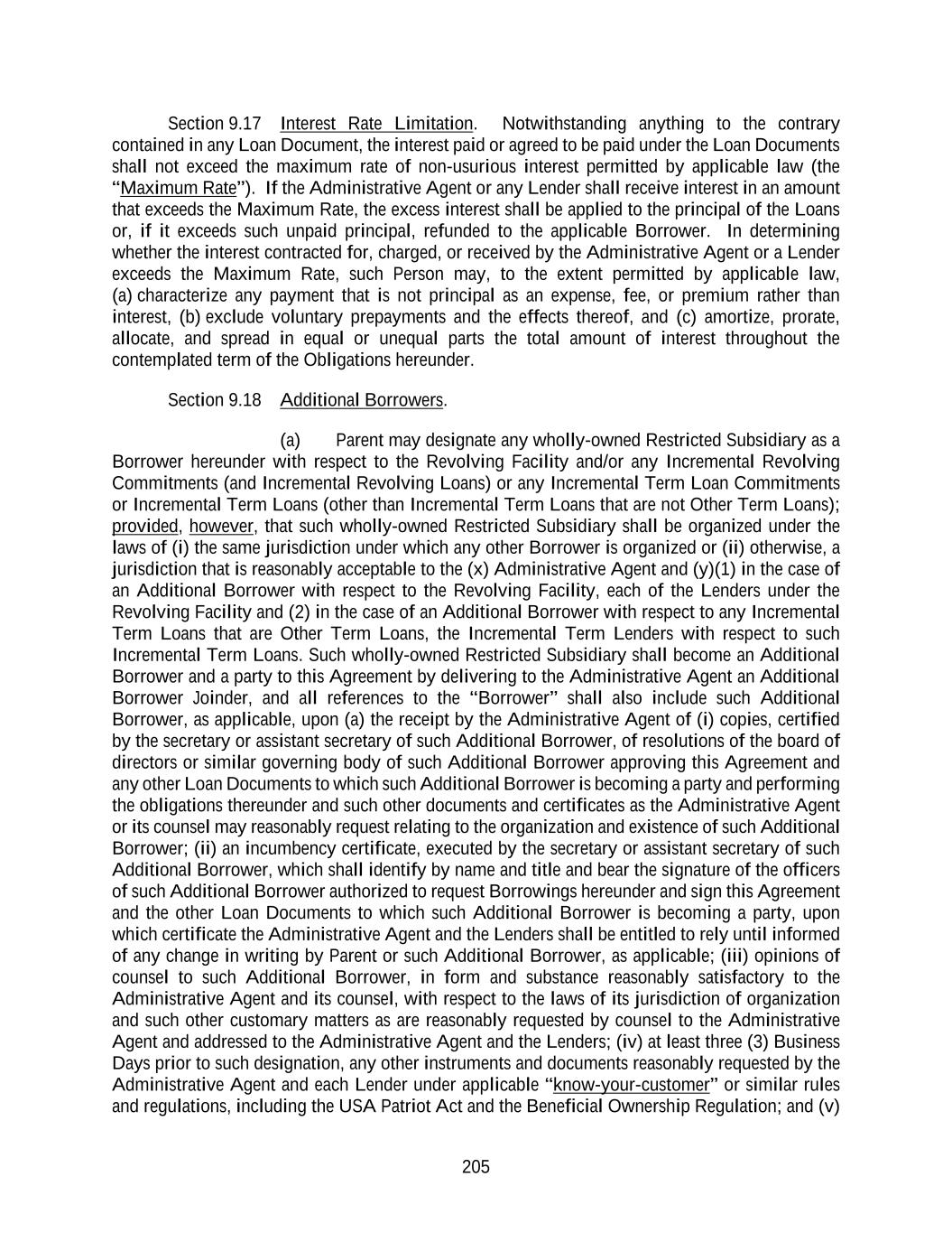 205 Section 9.17 Interest Rate Limitation. Notwithstanding anything to the contrary contained in any Loan Document, the interest paid or agreed to be paid under the Loan Documents shall not exceed the maximum rate of non-usurious interest permitted by applicable law (the “Maximum Rate”). If the Administrative Agent or any Lender shall receive interest in an amount that exceeds the Maximum Rate, the excess interest shall be applied to the principal of the Loans or, if it exceeds such unpaid principal, refunded to the applicable Borrower. In determining whether the interest contracted for, charged, or received by the Administrative Agent or a Lender exceeds the Maximum Rate, such Person may, to the extent permitted by applicable law, (a) characterize any payment that is not principal as an expense, fee, or premium rather than interest, (b) exclude voluntary prepayments and the effects thereof, and (c) amortize, prorate, allocate, and spread in equal or unequal parts the total amount of interest throughout the contemplated term of the Obligations hereunder. Section 9.18 Additional Borrowers. (a) Parent may designate any wholly-owned Restricted Subsidiary as a Borrower hereunder with respect to the Revolving Facility and/or any Incremental Revolving Commitments (and Incremental Revolving Loans) or any Incremental Term Loan Commitments or Incremental Term Loans (other than Incremental Term Loans that are not Other Term Loans); provided, however, that such wholly-owned Restricted Subsidiary shall be organized under the laws of (i) the same jurisdiction under which any other Borrower is organized or (ii) otherwise, a jurisdiction that is reasonably acceptable to the (x) Administrative Agent and (y)(1) in the case of an Additional Borrower with respect to the Revolving Facility, each of the Lenders under the Revolving Facility and (2) in the case of an Additional Borrower with respect to any Incremental Term Loans that are Other Term Loans, the Incremental Term Lenders with respect to such Incremental Term Loans. Such wholly-owned Restricted Subsidiary shall become an Additional Borrower and a party to this Agreement by delivering to the Administrative Agent an Additional Borrower Joinder, and all references to the “Borrower” shall also include such Additional Borrower, as applicable, upon (a) the receipt by the Administrative Agent of (i) copies, certified by the secretary or assistant secretary of such Additional Borrower, of resolutions of the board of directors or similar governing body of such Additional Borrower approving this Agreement and any other Loan Documents to which such Additional Borrower is becoming a party and performing the obligations thereunder and such other documents and certificates as the Administrative Agent or its counsel may reasonably request relating to the organization and existence of such Additional Borrower; (ii) an incumbency certificate, executed by the secretary or assistant secretary of such Additional Borrower, which shall identify by name and title and bear the signature of the officers of such Additional Borrower authorized to request Borrowings hereunder and sign this Agreement and the other Loan Documents to which such Additional Borrower is becoming a party, upon which certificate the Administrative Agent and the Lenders shall be entitled to rely until informed of any change in writing by Parent or such Additional Borrower, as applicable; (iii) opinions of counsel to such Additional Borrower, in form and substance reasonably satisfactory to the Administrative Agent and its counsel, with respect to the laws of its jurisdiction of organization and such other customary matters as are reasonably requested by counsel to the Administrative Agent and addressed to the Administrative Agent and the Lenders; (iv) at least three (3) Business Days prior to such designation, any other instruments and documents reasonably requested by the Administrative Agent and each Lender under applicable “know-your-customer” or similar rules and regulations, including the USA Patriot Act and the Beneficial Ownership Regulation; and (v)