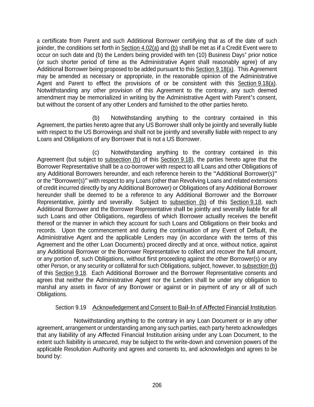 206 a certificate from Parent and such Additional Borrower certifying that as of the date of such joinder, the conditions set forth in Section 4.02(a) and (b) shall be met as if a Credit Event were to occur on such date and (b) the Lenders being provided with ten (10) Business Days’ prior notice (or such shorter period of time as the Administrative Agent shall reasonably agree) of any Additional Borrower being proposed to be added pursuant to this Section 9.18(a). This Agreement may be amended as necessary or appropriate, in the reasonable opinion of the Administrative Agent and Parent to effect the provisions of or be consistent with this Section 9.18(a). Notwithstanding any other provision of this Agreement to the contrary, any such deemed amendment may be memorialized in writing by the Administrative Agent with Parent’s consent, but without the consent of any other Lenders and furnished to the other parties hereto. (b) Notwithstanding anything to the contrary contained in this Agreement, the parties hereto agree that any US Borrower shall only be jointly and severally liable with respect to the US Borrowings and shall not be jointly and severally liable with respect to any Loans and Obligations of any Borrower that is not a US Borrower. (c) Notwithstanding anything to the contrary contained in this Agreement (but subject to subsection (b) of this Section 9.18), the parties hereto agree that the Borrower Representative shall be a co-borrower with respect to all Loans and other Obligations of any Additional Borrowers hereunder, and each reference herein to the “Additional Borrower(s)” or the “Borrower(s)” with respect to any Loans (other than Revolving Loans and related extensions of credit incurred directly by any Additional Borrower) or Obligations of any Additional Borrower hereunder shall be deemed to be a reference to any Additional Borrower and the Borrower Representative, jointly and severally. Subject to subsection (b) of this Section 9.18, each Additional Borrower and the Borrower Representative shall be jointly and severally liable for all such Loans and other Obligations, regardless of which Borrower actually receives the benefit thereof or the manner in which they account for such Loans and Obligations on their books and records. Upon the commencement and during the continuation of any Event of Default, the Administrative Agent and the applicable Lenders may (in accordance with the terms of this Agreement and the other Loan Documents) proceed directly and at once, without notice, against any Additional Borrower or the Borrower Representative to collect and recover the full amount, or any portion of, such Obligations, without first proceeding against the other Borrower(s) or any other Person, or any security or collateral for such Obligations, subject, however, to subsection (b) of this Section 9.18. Each Additional Borrower and the Borrower Representative consents and agrees that neither the Administrative Agent nor the Lenders shall be under any obligation to marshal any assets in favor of any Borrower or against or in payment of any or all of such Obligations. Section 9.19 Acknowledgement and Consent to Bail-In of Affected Financial Institution. Notwithstanding anything to the contrary in any Loan Document or in any other agreement, arrangement or understanding among any such parties, each party hereto acknowledges that any liability of any Affected Financial Institution arising under any Loan Document, to the extent such liability is unsecured, may be subject to the write-down and conversion powers of the applicable Resolution Authority and agrees and consents to, and acknowledges and agrees to be bound by: