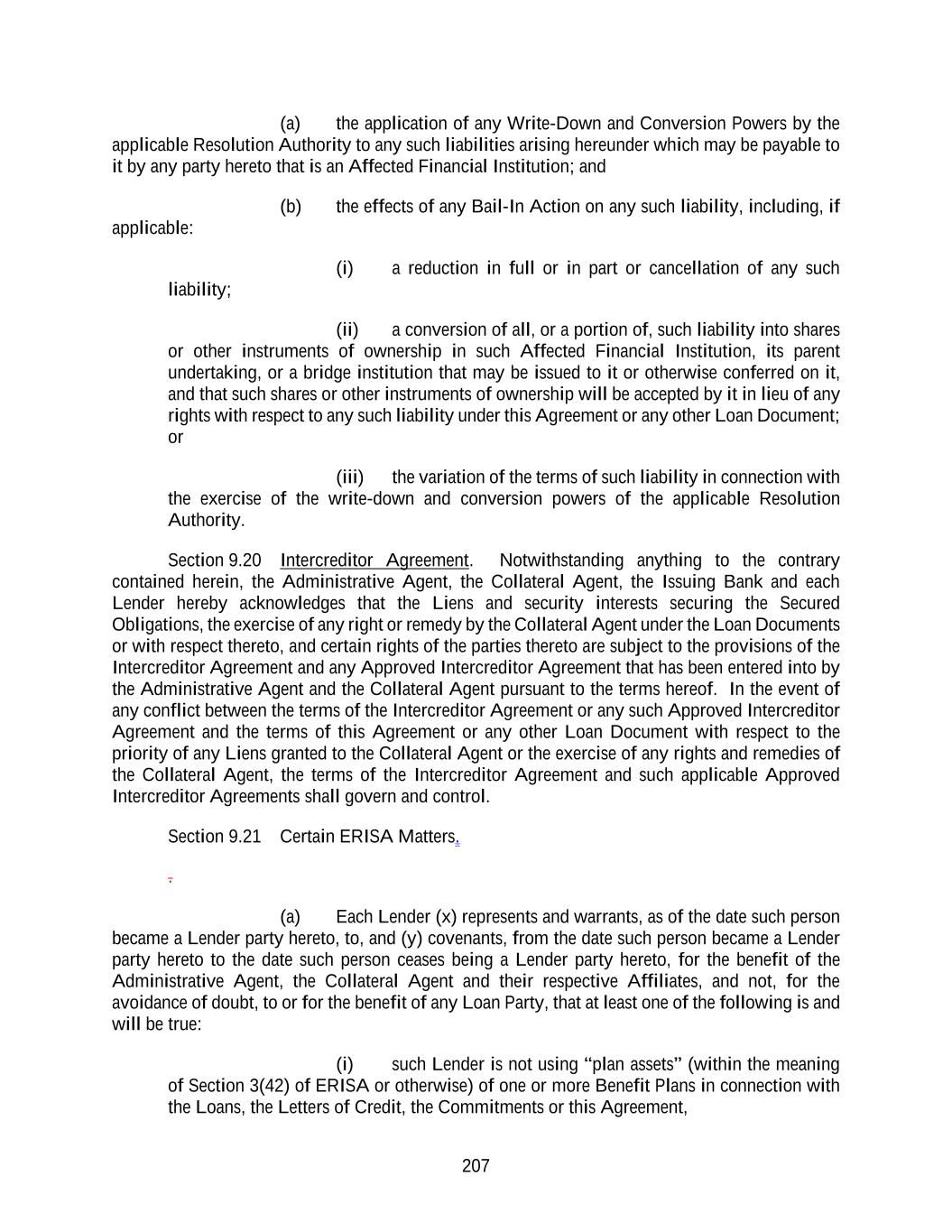 207 (a) the application of any Write-Down and Conversion Powers by the applicable Resolution Authority to any such liabilities arising hereunder which may be payable to it by any party hereto that is an Affected Financial Institution; and (b) the effects of any Bail-In Action on any such liability, including, if applicable: (i) a reduction in full or in part or cancellation of any such liability; (ii) a conversion of all, or a portion of, such liability into shares or other instruments of ownership in such Affected Financial Institution, its parent undertaking, or a bridge institution that may be issued to it or otherwise conferred on it, and that such shares or other instruments of ownership will be accepted by it in lieu of any rights with respect to any such liability under this Agreement or any other Loan Document; or (iii) the variation of the terms of such liability in connection with the exercise of the write-down and conversion powers of the applicable Resolution Authority. Section 9.20 Intercreditor Agreement. Notwithstanding anything to the contrary contained herein, the Administrative Agent, the Collateral Agent, the Issuing Bank and each Lender hereby acknowledges that the Liens and security interests securing the Secured Obligations, the exercise of any right or remedy by the Collateral Agent under the Loan Documents or with respect thereto, and certain rights of the parties thereto are subject to the provisions of the Intercreditor Agreement and any Approved Intercreditor Agreement that has been entered into by the Administrative Agent and the Collateral Agent pursuant to the terms hereof. In the event of any conflict between the terms of the Intercreditor Agreement or any such Approved Intercreditor Agreement and the terms of this Agreement or any other Loan Document with respect to the priority of any Liens granted to the Collateral Agent or the exercise of any rights and remedies of the Collateral Agent, the terms of the Intercreditor Agreement and such applicable Approved Intercreditor Agreements shall govern and control. Section 9.21 Certain ERISA Matters. . (a) Each Lender (x) represents and warrants, as of the date such person became a Lender party hereto, to, and (y) covenants, from the date such person became a Lender party hereto to the date such person ceases being a Lender party hereto, for the benefit of the Administrative Agent, the Collateral Agent and their respective Affiliates, and not, for the avoidance of doubt, to or for the benefit of any Loan Party, that at least one of the following is and will be true: (i) such Lender is not using “plan assets” (within the meaning of Section 3(42) of ERISA or otherwise) of one or more Benefit Plans in connection with the Loans, the Letters of Credit, the Commitments or this Agreement,
