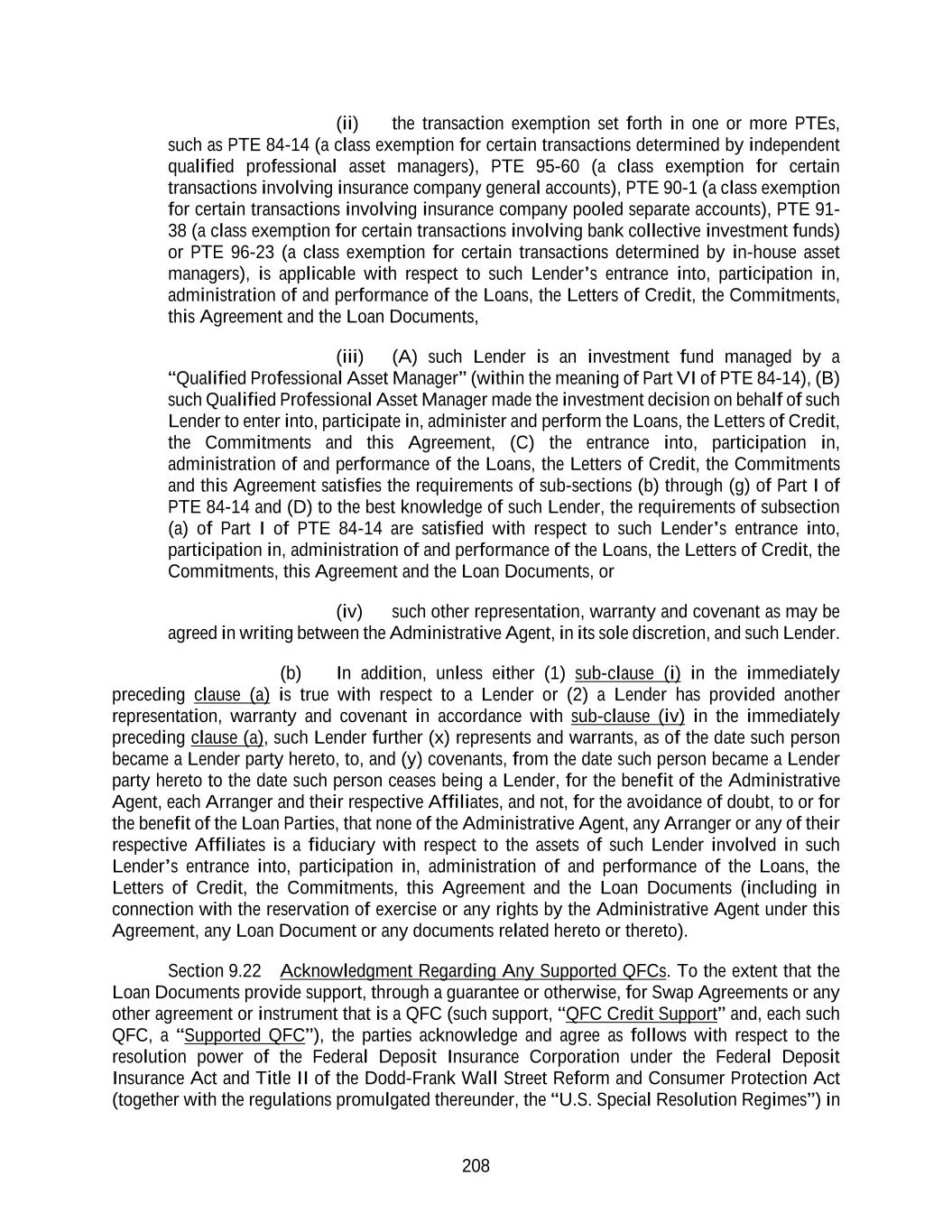 208 (ii) the transaction exemption set forth in one or more PTEs, such as PTE 84-14 (a class exemption for certain transactions determined by independent qualified professional asset managers), PTE 95-60 (a class exemption for certain transactions involving insurance company general accounts), PTE 90-1 (a class exemption for certain transactions involving insurance company pooled separate accounts), PTE 91- 38 (a class exemption for certain transactions involving bank collective investment funds) or PTE 96-23 (a class exemption for certain transactions determined by in-house asset managers), is applicable with respect to such Lender’s entrance into, participation in, administration of and performance of the Loans, the Letters of Credit, the Commitments, this Agreement and the Loan Documents, (iii) (A) such Lender is an investment fund managed by a “Qualified Professional Asset Manager” (within the meaning of Part VI of PTE 84-14), (B) such Qualified Professional Asset Manager made the investment decision on behalf of such Lender to enter into, participate in, administer and perform the Loans, the Letters of Credit, the Commitments and this Agreement, (C) the entrance into, participation in, administration of and performance of the Loans, the Letters of Credit, the Commitments and this Agreement satisfies the requirements of sub-sections (b) through (g) of Part I of PTE 84-14 and (D) to the best knowledge of such Lender, the requirements of subsection (a) of Part I of PTE 84-14 are satisfied with respect to such Lender’s entrance into, participation in, administration of and performance of the Loans, the Letters of Credit, the Commitments, this Agreement and the Loan Documents, or (iv) such other representation, warranty and covenant as may be agreed in writing between the Administrative Agent, in its sole discretion, and such Lender. (b) In addition, unless either (1) sub-clause (i) in the immediately preceding clause (a) is true with respect to a Lender or (2) a Lender has provided another representation, warranty and covenant in accordance with sub-clause (iv) in the immediately preceding clause (a), such Lender further (x) represents and warrants, as of the date such person became a Lender party hereto, to, and (y) covenants, from the date such person became a Lender party hereto to the date such person ceases being a Lender, for the benefit of the Administrative Agent, each Arranger and their respective Affiliates, and not, for the avoidance of doubt, to or for the benefit of the Loan Parties, that none of the Administrative Agent, any Arranger or any of their respective Affiliates is a fiduciary with respect to the assets of such Lender involved in such Lender’s entrance into, participation in, administration of and performance of the Loans, the Letters of Credit, the Commitments, this Agreement and the Loan Documents (including in connection with the reservation of exercise or any rights by the Administrative Agent under this Agreement, any Loan Document or any documents related hereto or thereto). Section 9.22 Acknowledgment Regarding Any Supported QFCs. To the extent that the Loan Documents provide support, through a guarantee or otherwise, for Swap Agreements or any other agreement or instrument that is a QFC (such support, “QFC Credit Support” and, each such QFC, a “Supported QFC”), the parties acknowledge and agree as follows with respect to the resolution power of the Federal Deposit Insurance Corporation under the Federal Deposit Insurance Act and Title II of the Dodd-Frank Wall Street Reform and Consumer Protection Act (together with the regulations promulgated thereunder, the “U.S. Special Resolution Regimes”) in