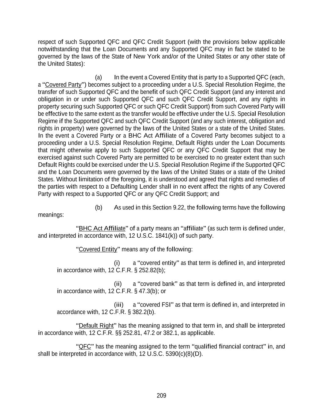 209 respect of such Supported QFC and QFC Credit Support (with the provisions below applicable notwithstanding that the Loan Documents and any Supported QFC may in fact be stated to be governed by the laws of the State of New York and/or of the United States or any other state of the United States): (a) In the event a Covered Entity that is party to a Supported QFC (each, a “Covered Party”) becomes subject to a proceeding under a U.S. Special Resolution Regime, the transfer of such Supported QFC and the benefit of such QFC Credit Support (and any interest and obligation in or under such Supported QFC and such QFC Credit Support, and any rights in property securing such Supported QFC or such QFC Credit Support) from such Covered Party will be effective to the same extent as the transfer would be effective under the U.S. Special Resolution Regime if the Supported QFC and such QFC Credit Support (and any such interest, obligation and rights in property) were governed by the laws of the United States or a state of the United States. In the event a Covered Party or a BHC Act Affiliate of a Covered Party becomes subject to a proceeding under a U.S. Special Resolution Regime, Default Rights under the Loan Documents that might otherwise apply to such Supported QFC or any QFC Credit Support that may be exercised against such Covered Party are permitted to be exercised to no greater extent than such Default Rights could be exercised under the U.S. Special Resolution Regime if the Supported QFC and the Loan Documents were governed by the laws of the United States or a state of the United States. Without limitation of the foregoing, it is understood and agreed that rights and remedies of the parties with respect to a Defaulting Lender shall in no event affect the rights of any Covered Party with respect to a Supported QFC or any QFC Credit Support; and (b) As used in this Section 9.22, the following terms have the following meanings: “BHC Act Affiliate” of a party means an “affiliate” (as such term is defined under, and interpreted in accordance with, 12 U.S.C. 1841(k)) of such party. “Covered Entity” means any of the following: (i) a “covered entity” as that term is defined in, and interpreted in accordance with, 12 C.F.R. § 252.82(b); (ii) a “covered bank” as that term is defined in, and interpreted in accordance with, 12 C.F.R. § 47.3(b); or (iii) a “covered FSI” as that term is defined in, and interpreted in accordance with, 12 C.F.R. § 382.2(b). “Default Right” has the meaning assigned to that term in, and shall be interpreted in accordance with, 12 C.F.R. §§ 252.81, 47.2 or 382.1, as applicable. “QFC” has the meaning assigned to the term “qualified financial contract” in, and shall be interpreted in accordance with, 12 U.S.C. 5390(c)(8)(D).