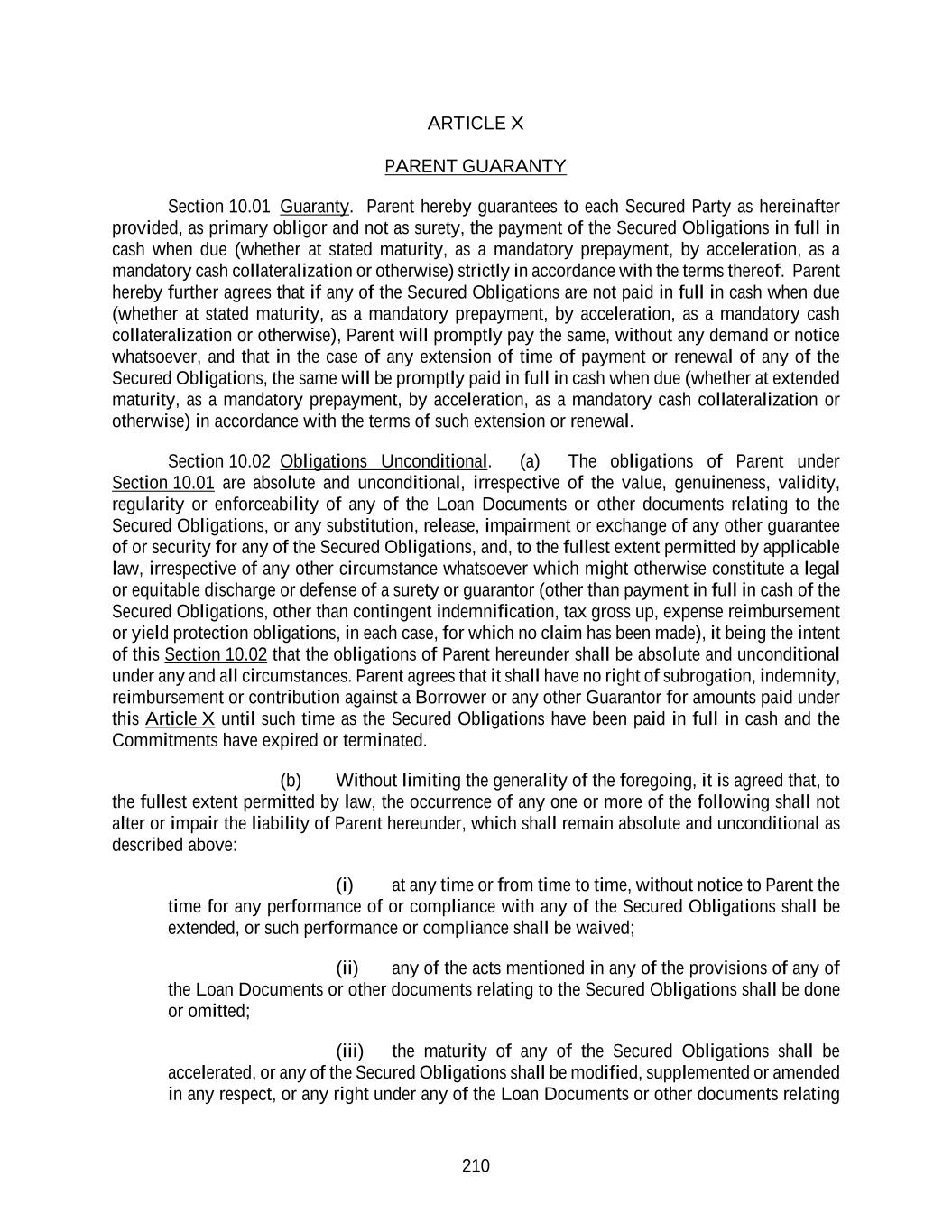 210 ARTICLE X PARENT GUARANTY Section 10.01 Guaranty. Parent hereby guarantees to each Secured Party as hereinafter provided, as primary obligor and not as surety, the payment of the Secured Obligations in full in cash when due (whether at stated maturity, as a mandatory prepayment, by acceleration, as a mandatory cash collateralization or otherwise) strictly in accordance with the terms thereof. Parent hereby further agrees that if any of the Secured Obligations are not paid in full in cash when due (whether at stated maturity, as a mandatory prepayment, by acceleration, as a mandatory cash collateralization or otherwise), Parent will promptly pay the same, without any demand or notice whatsoever, and that in the case of any extension of time of payment or renewal of any of the Secured Obligations, the same will be promptly paid in full in cash when due (whether at extended maturity, as a mandatory prepayment, by acceleration, as a mandatory cash collateralization or otherwise) in accordance with the terms of such extension or renewal. Section 10.02 Obligations Unconditional. (a) The obligations of Parent under Section 10.01 are absolute and unconditional, irrespective of the value, genuineness, validity, regularity or enforceability of any of the Loan Documents or other documents relating to the Secured Obligations, or any substitution, release, impairment or exchange of any other guarantee of or security for any of the Secured Obligations, and, to the fullest extent permitted by applicable law, irrespective of any other circumstance whatsoever which might otherwise constitute a legal or equitable discharge or defense of a surety or guarantor (other than payment in full in cash of the Secured Obligations, other than contingent indemnification, tax gross up, expense reimbursement or yield protection obligations, in each case, for which no claim has been made), it being the intent of this Section 10.02 that the obligations of Parent hereunder shall be absolute and unconditional under any and all circumstances. Parent agrees that it shall have no right of subrogation, indemnity, reimbursement or contribution against a Borrower or any other Guarantor for amounts paid under this Article X until such time as the Secured Obligations have been paid in full in cash and the Commitments have expired or terminated. (b) Without limiting the generality of the foregoing, it is agreed that, to the fullest extent permitted by law, the occurrence of any one or more of the following shall not alter or impair the liability of Parent hereunder, which shall remain absolute and unconditional as described above: (i) at any time or from time to time, without notice to Parent the time for any performance of or compliance with any of the Secured Obligations shall be extended, or such performance or compliance shall be waived; (ii) any of the acts mentioned in any of the provisions of any of the Loan Documents or other documents relating to the Secured Obligations shall be done or omitted; (iii) the maturity of any of the Secured Obligations shall be accelerated, or any of the Secured Obligations shall be modified, supplemented or amended in any respect, or any right under any of the Loan Documents or other documents relating