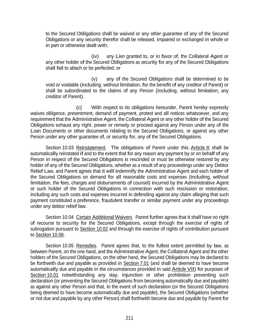 211 to the Secured Obligations shall be waived or any other guarantee of any of the Secured Obligations or any security therefor shall be released, impaired or exchanged in whole or in part or otherwise dealt with; (iv) any Lien granted to, or in favor of, the Collateral Agent or any other holder of the Secured Obligations as security for any of the Secured Obligations shall fail to attach or be perfected; or (v) any of the Secured Obligations shall be determined to be void or voidable (including, without limitation, for the benefit of any creditor of Parent) or shall be subordinated to the claims of any Person (including, without limitation, any creditor of Parent). (c) With respect to its obligations hereunder, Parent hereby expressly waives diligence, presentment, demand of payment, protest and all notices whatsoever, and any requirement that the Administrative Agent, the Collateral Agent or any other holder of the Secured Obligations exhaust any right, power or remedy or proceed against any Person under any of the Loan Documents or other documents relating to the Secured Obligations, or against any other Person under any other guarantee of, or security for, any of the Secured Obligations. Section 10.03 Reinstatement. The obligations of Parent under this Article X shall be automatically reinstated if and to the extent that for any reason any payment by or on behalf of any Person in respect of the Secured Obligations is rescinded or must be otherwise restored by any holder of any of the Secured Obligations, whether as a result of any proceedings under any Debtor Relief Law, and Parent agrees that it will indemnify the Administrative Agent and each holder of the Secured Obligations on demand for all reasonable costs and expenses (including, without limitation, the fees, charges and disbursements of counsel) incurred by the Administrative Agent or such holder of the Secured Obligations in connection with such rescission or restoration, including any such costs and expenses incurred in defending against any claim alleging that such payment constituted a preference, fraudulent transfer or similar payment under any proceedings under any debtor relief law. Section 10.04 Certain Additional Waivers. Parent further agrees that it shall have no right of recourse to security for the Secured Obligations, except through the exercise of rights of subrogation pursuant to Section 10.02 and through the exercise of rights of contribution pursuant to Section 10.06. Section 10.05 Remedies. Parent agrees that, to the fullest extent permitted by law, as between Parent, on the one hand, and the Administrative Agent, the Collateral Agent and the other holders of the Secured Obligations, on the other hand, the Secured Obligations may be declared to be forthwith due and payable as provided in Section 7.01 (and shall be deemed to have become automatically due and payable in the circumstances provided in said Article VII) for purposes of Section 10.01 notwithstanding any stay, injunction or other prohibition preventing such declaration (or preventing the Secured Obligations from becoming automatically due and payable) as against any other Person and that, in the event of such declaration (or the Secured Obligations being deemed to have become automatically due and payable), the Secured Obligations (whether or not due and payable by any other Person) shall forthwith become due and payable by Parent for