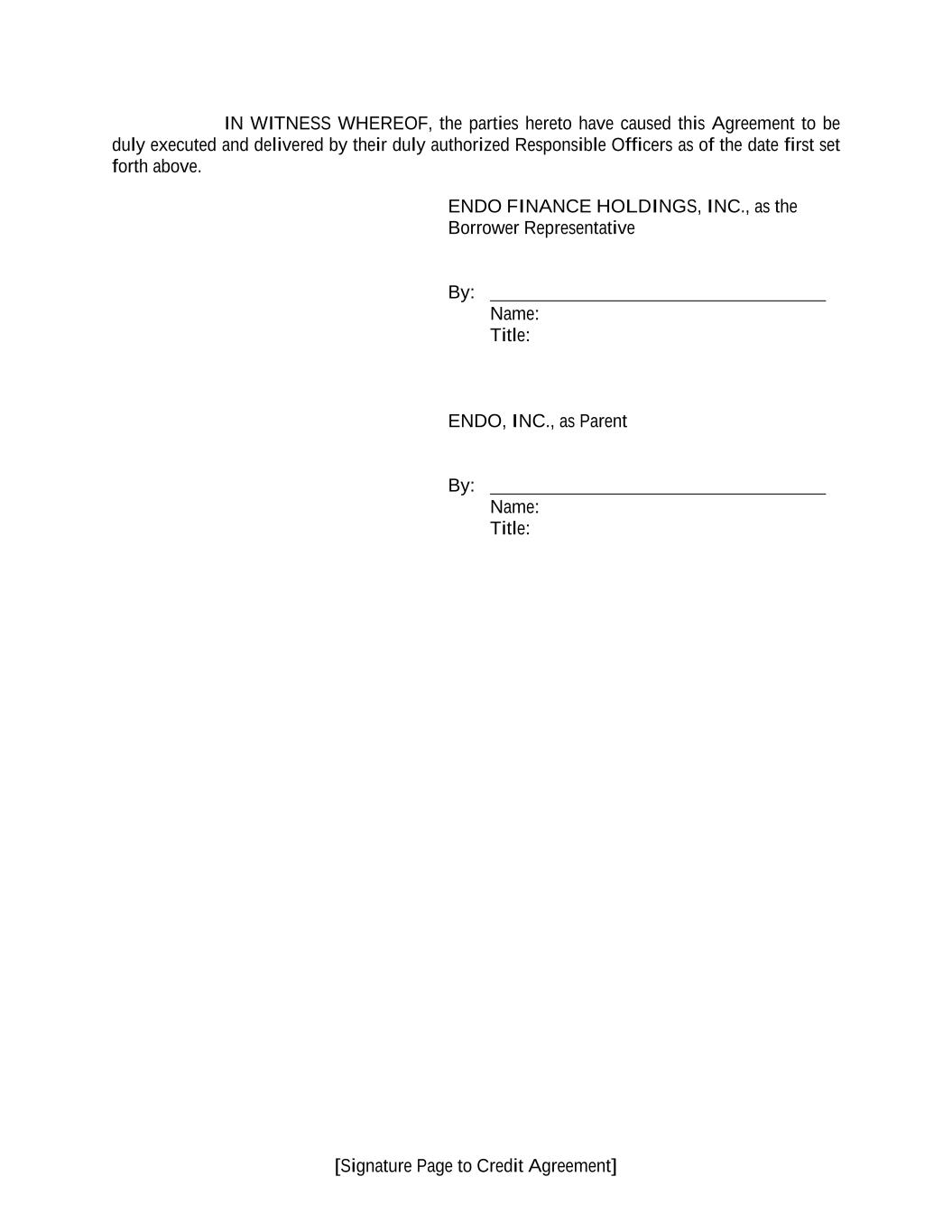[Signature Page to Credit Agreement] IN WITNESS WHEREOF, the parties hereto have caused this Agreement to be duly executed and delivered by their duly authorized Responsible Officers as of the date first set forth above. ENDO FINANCE HOLDINGS, INC., as the Borrower Representative By: Name: Title: ENDO, INC., as Parent By: Name: Title: