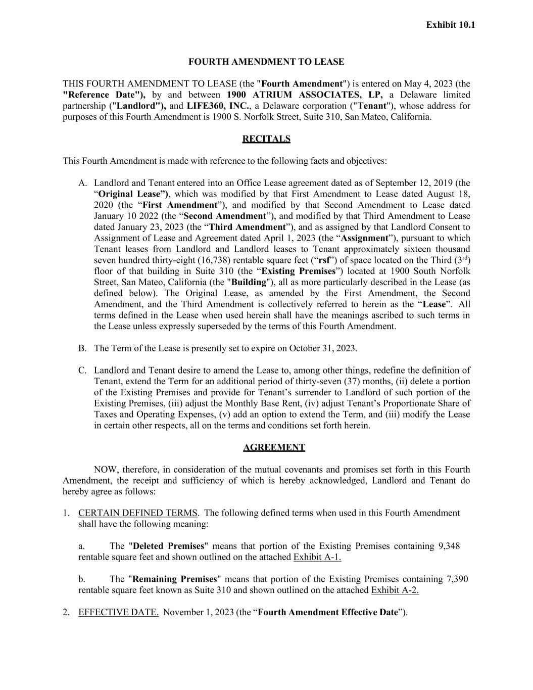 Exhibit 10.1 FOURTH AMENDMENT TO LEASE THIS FOURTH AMENDMENT TO LEASE (the "Fourth Amendment") is entered on May 4, 2023 (the "Reference Date"), by and between 1900 ATRIUM ASSOCIATES, LP, a Delaware limited partnership ("Landlord"), and LIFE360, INC., a Delaware corporation ("Tenant"), whose address for purposes of this Fourth Amendment is 1900 S. Norfolk Street, Suite 310, San Mateo, California. RECITALS This Fourth Amendment is made with reference to the following facts and objectives: A. Landlord and Tenant entered into an Office Lease agreement dated as of September 12, 2019 (the “Original Lease”), which was modified by that First Amendment to Lease dated August 18, 2020 (the “First Amendment”), and modified by that Second Amendment to Lease dated January 10 2022 (the “Second Amendment”), and modified by that Third Amendment to Lease dated January 23, 2023 (the “Third Amendment”), and as assigned by that Landlord Consent to Assignment of Lease and Agreement dated April 1, 2023 (the “Assignment”), pursuant to which Tenant leases from Landlord and Landlord leases to Tenant approximately sixteen thousand seven hundred thirty-eight (16,738) rentable square feet (“rsf”) of space located on the Third (3rd) floor of that building in Suite 310 (the “Existing Premises”) located at 1900 South Norfolk Street, San Mateo, California (the "Building"), all as more particularly described in the Lease (as defined below). The Original Lease, as amended by the First Amendment, the Second Amendment, and the Third Amendment is collectively referred to herein as the “Lease”. All terms defined in the Lease when used herein shall have the meanings ascribed to such terms in the Lease unless expressly superseded by the terms of this Fourth Amendment. B. The Term of the Lease is presently set to expire on October 31, 2023. C. Landlord and Tenant desire to amend the Lease to, among other things, redefine the definition of Tenant, extend the Term for an additional period of thirty-seven (37) months, (ii) delete a portion of the Existing Premises and provide for Tenant’s surrender to Landlord of such portion of the Existing Premises, (iii) adjust the Monthly Base Rent, (iv) adjust Tenant’s Proportionate Share of Taxes and Operating Expenses, (v) add an option to extend the Term, and (iii) modify the Lease in certain other respects, all on the terms and conditions set forth herein. AGREEMENT NOW, therefore, in consideration of the mutual covenants and promises set forth in this Fourth Amendment, the receipt and sufficiency of which is hereby acknowledged, Landlord and Tenant do hereby agree as follows: 1. CERTAIN DEFINED TERMS. The following defined terms when used in this Fourth Amendment shall have the following meaning: a. The "Deleted Premises" means that portion of the Existing Premises containing 9,348 rentable square feet and shown outlined on the attached Exhibit A-1. b. The "Remaining Premises" means that portion of the Existing Premises containing 7,390 rentable square feet known as Suite 310 and shown outlined on the attached Exhibit A-2. 2. EFFECTIVE DATE. November 1, 2023 (the “Fourth Amendment Effective Date”).